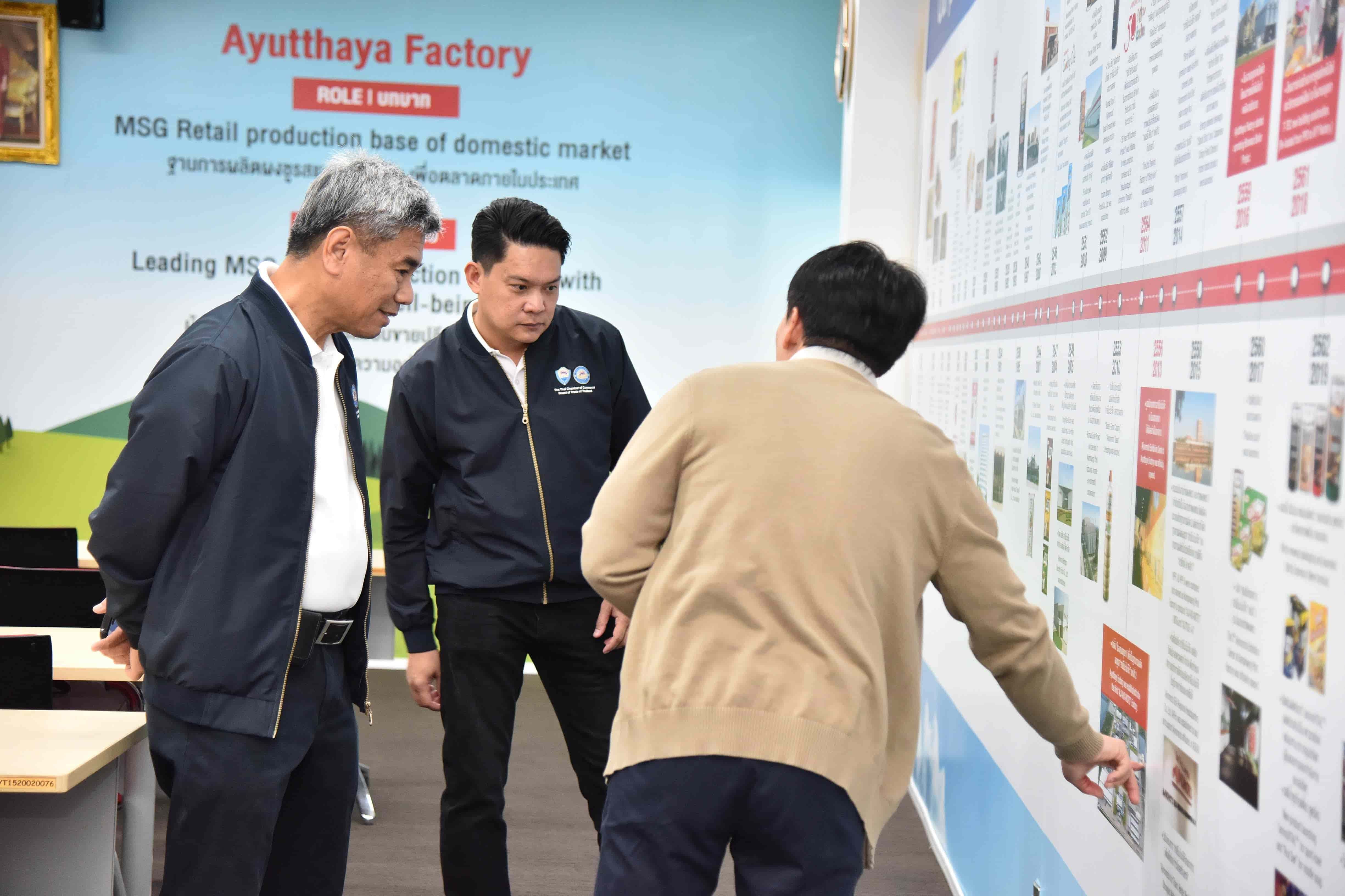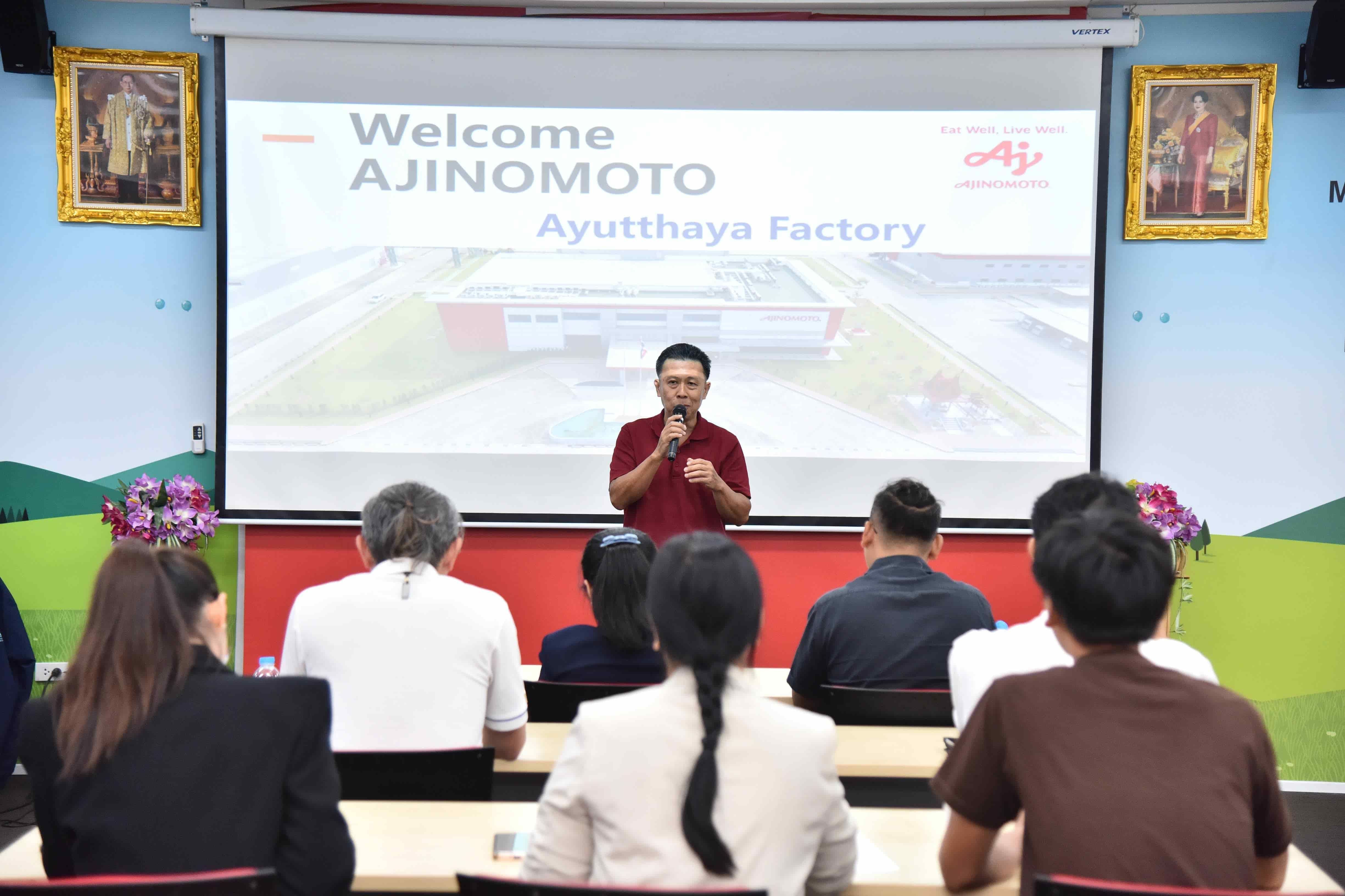 ได้การต้อนรับจาก คุณยุทธนา เกติพันธ์ ผู้จัดการฝ่ายบริหารทั่วไป กล่าวต้อนรับและบรรยายถึงประวัติการก่อตั้งโรงงานอยุธยาแห่งนี้ เริ่มต้นด้วยโรงงานอยุธยา นับเป็นโรงงานผลิตผงชูรส แห่งที่ 3 ของบริษัทฯ เริ่มเดินเครื่องจักรการผลิตในเดือนเมษายน พ.ศ. 2556 บนพื้นที่ 1,400 ไร่ เพื่อรองรับการเจริญเติบโตของตลาดทั้งใน และต่างประเทศ โรงงานแห่งนี้ใช้เทคโนโลยีการผลิตอันทันสมัยจากประเทศญี่ปุ่น โรงงานยังให้ความสำคัญกับการดูแลชุมชนและสิ่งแวดล้อมด้วยการใช้เทคโนโลยีสีเขียว “หม้อต้มไอน้ำพลังงานชีวมวล” โดยใช้แกลบเพื่อผลิตพลังงานไอน้ำทดแทน การใช้น้ำมันปิโตรเลียม