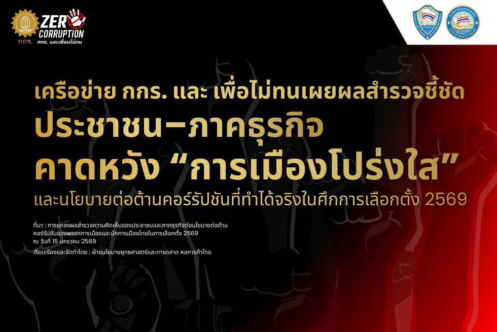 ผลสำรวจชี้ชัด ประชาชน–ภาคธุรกิจคาดหวัง “การเมืองโปร่งใส” และนโยบายต่อต้านคอร์รัปชันที่ทำได้จริงในศึกการเลือกตั้งปี 69