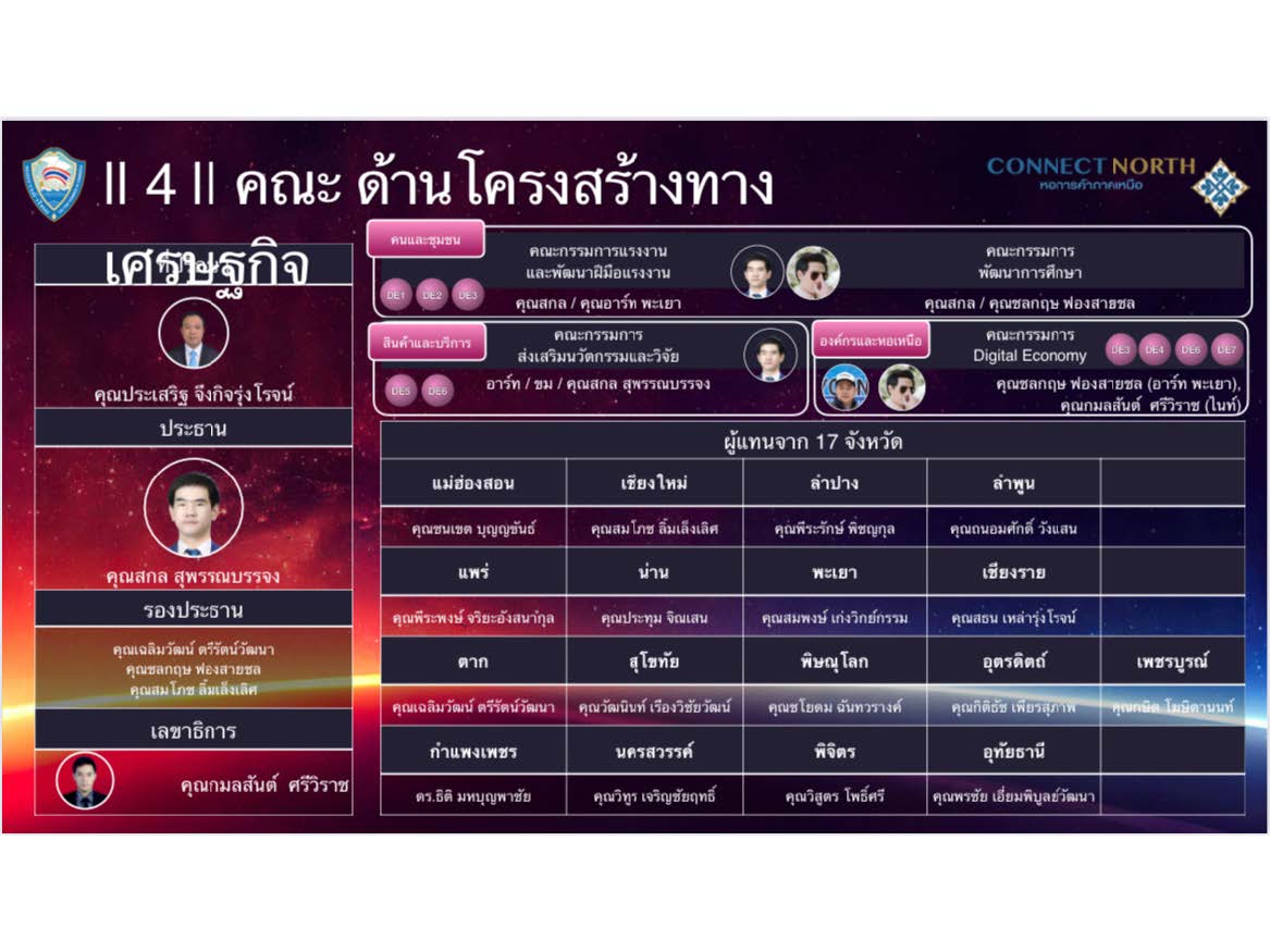 โดยมีผู้แทนด้านโครงสร้างทางเศรษฐกิจ จากหอการค้าจังหวัดภาคเหนือทั้ง 17 จังหวัด ประธานผู้ประกอบการรุ่นใหม่ YEC หอการค้าจังหวัดภาคเหนือ และผู้มีส่วนเกี่ยวข้อง เข้าร่วมประชุมในครั้งนี้