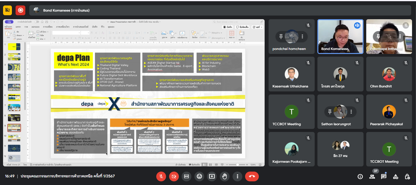 วันที่ 3 เมษายน 2567 คุณสมบัติ ชินสุขเสริม ประธานหอการค้าภาคเหนือ ได้มอบหมายให้ คุณพรเทพ อินทะชัย เลขาธิการหอการค้าภาคเหนือ เป็นประธานการประชุมหารือการดำเนินโครงการ Flagship Projects ภายใต้โครงการ Connect the dots (North) กับมหาวิทยาลัยเครือข่ายอุทยานวิทยาศาสตร์ภาคเหนือ (STEP) และ สำนักงานส่งเสริมเศรษฐกิจดิจิทัล (DEPA) โดยมี ที่ปรึกษาและคณะกรรมการบริหารหอการค้าภาคเหนือ พร้อมด้วยประธาน-เลขาธิการ-กรรมการ และ YEC หอการค้าภาคเหนือทั้ง 17 จังหวัด ร่วมประชุมโดยวิธี Conference