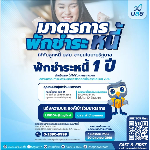 - เป็นลูกหนี้ บสย. ที่เข้าร่วมโครงการปรับปรุงโครงสร้างหนี้ และเข้าร่วมมาตรการ “บสย.พร้อมช่วย” และปฏิบัติตามเงื่อนไขเป็นระยะเวลา 3 เดือน สามารถพักชำระค่างวด 1 ปี (ไม่เกิน มิ.ย. 2568)