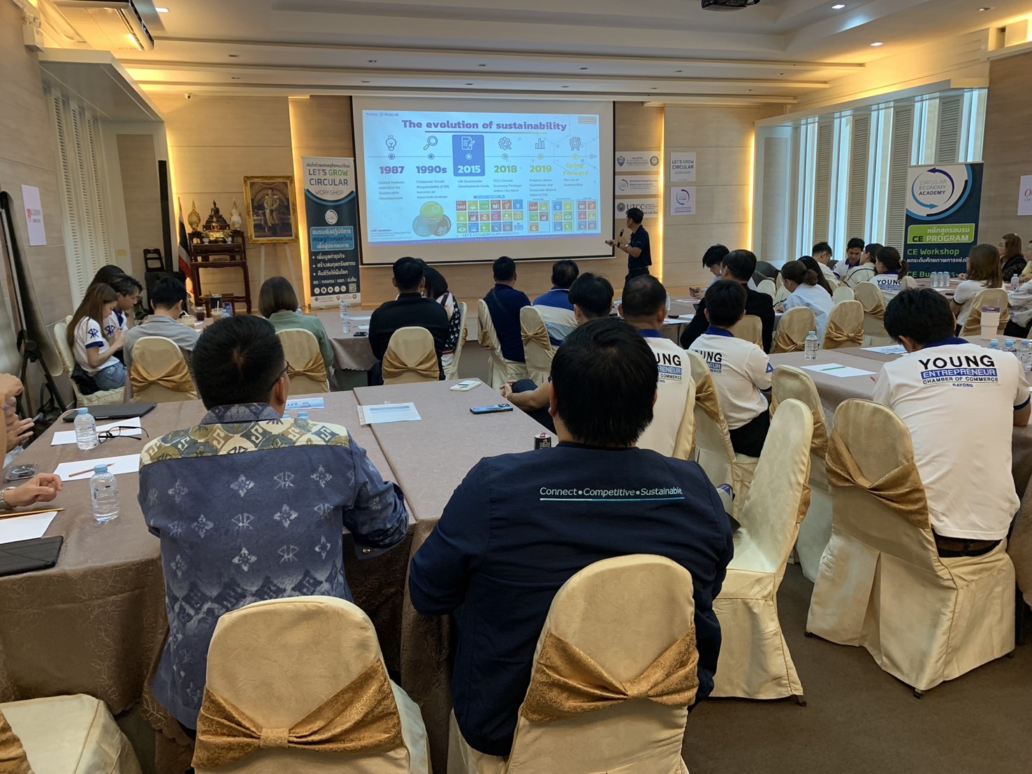 คณะกรรมการขับเคลื่อนเศรษฐกิจหมุนเวียนและสิ่งแวดล้อม หอการค้าไทย ร่วมกับ CE Academy มหาวิทยาลัยหอการค้าไทย ,หอการค้า และYEC จังหวัดระยอง ร่วมกัน จัดอบรมหลักสูตร " LET’S GROW CIRCULAR WORKSHOP " ผลักดันกิจกรรมสร้างต้นแบบ - ร่วมปันความรู้ - ร่วมมือเครือข่าย – เสริมกลไกความยั่งยืน หัวข้อ “SDGs - ยุทธศาสตร์ BCG - เศรษฐกิจหมุนเวียน - สังคมคาร์บอนต่ำ กับ การสร้างสรรค์นวัตกรรม สำหรับ SMEs” เมื่อวันที่ 18 มิถุนายน 2567 ณ ห้องประชุมหอการค้าจังหวัดระยอง จังหวัดระยอง โดยได้รับเกียรติจากประธานหอการค้าจังหวัดระยอง คุณพิธพร สมะลาภา เป็นประธานในพิธีเปิด