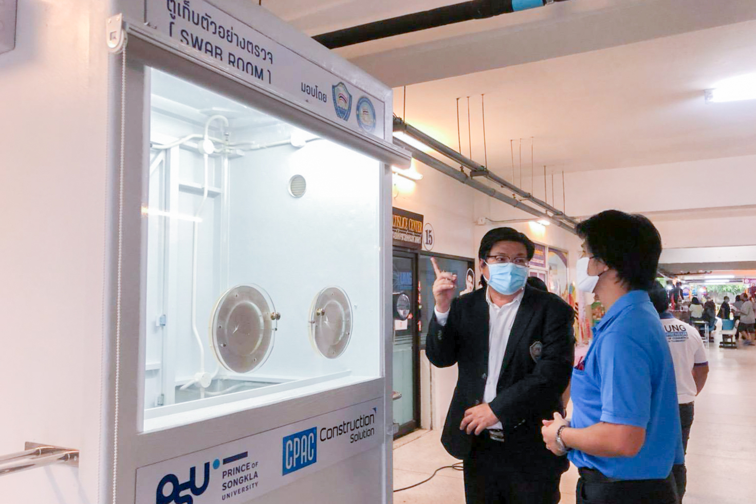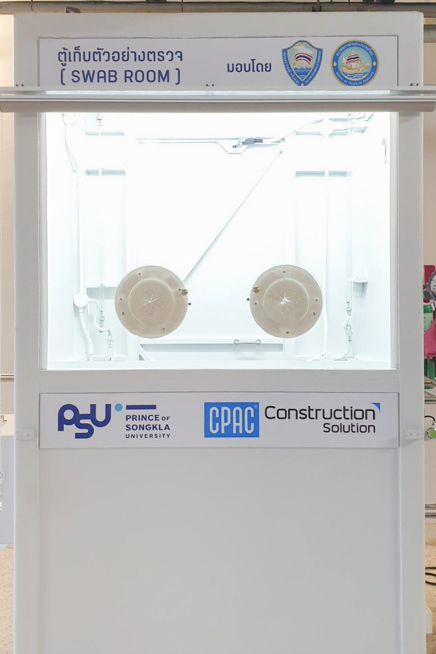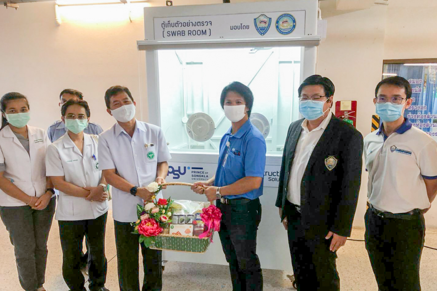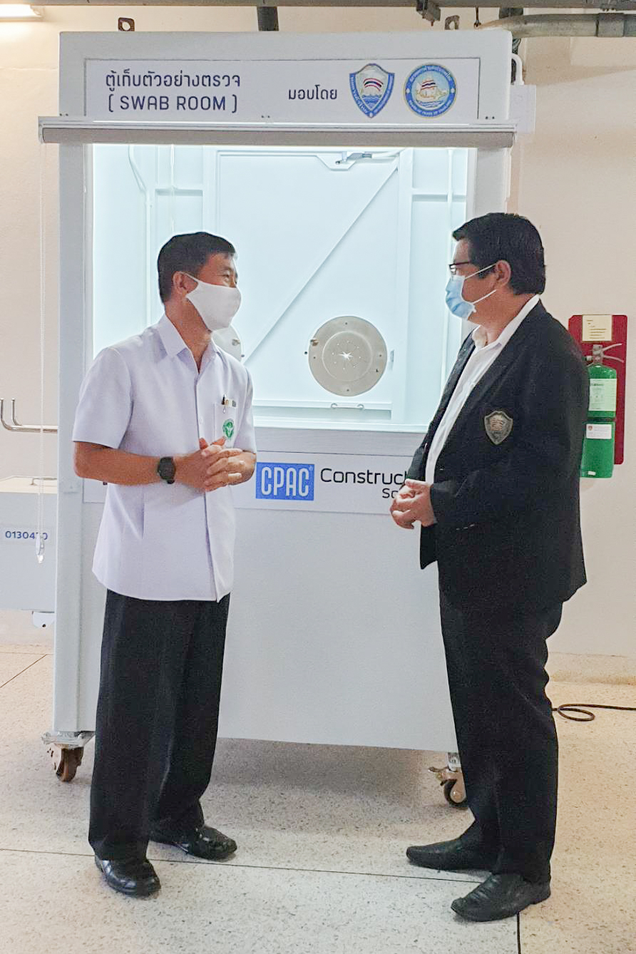 วันนี้ (1 พฤษภาคม 2563) คุณกรกฎ เตติรานนท์ ประธานหอการค้าจังหวัดนครศรีธรรมราช และคุณวราวุฒิ พิมเสน BSE OPERATION SENIOR MANAGER บริษัท ปูนซิเมนต์ไทย (ทุ่งสง) จำกัด ร่วมส่งมอบตู้ SWAB ROOM ให้กับ นพ.กิตติ รัตนสมบัติ ผู้อำนวยการ โรงพยาบาลท่าศาลา จ.นครศรีธรรมราช เพื่อใช้ในการเก็บตัวอย่างการตรวจเชื้อ COVID-19 และเพิ่มความปลอดภัยให้แก่บุคลากรทางการแพทย์ในการเก็บตัวอย่าง พร้อมกันนี้ได้มีการสาธิตแนะนำการทำงาน และการบำรุงรักษาตู้ฯ โดยทีมงานผู้เชี่ยวชาญได้แก่ คุณนิพนธ์ พลูเกิด และคุณชาญชัย ตรีเปีย