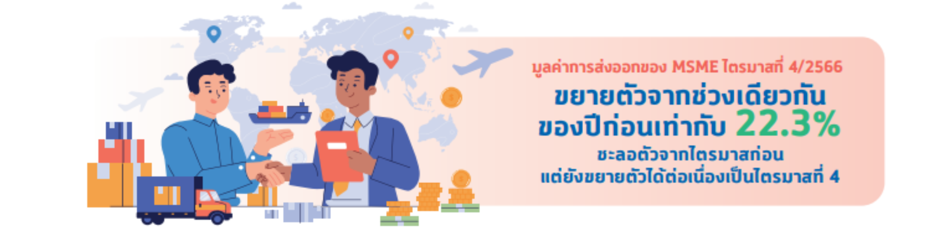 ในไตรมาสที่ 4/2566 MSME มีการส่งออกสินค้าคิดเป็นมูลค่า 327,023.7 ล้านบาท หรือ 9,190.9 ล้านเหรียญสหรัฐ ขยายตัว 22.3% เมื่อเทียบกับช่วงเดียวกันของปีก่อน โดยมีสัดส่วนต่อมูลค่าการส่งออกรวมเท่ากับ 13.2% ขณะที่มูลค่าการส่งออกรวมของประเทศไตรมาสสุดท้ายของปี 2566 มีมูลค่า 69,850.1 ล้านเหรียญสหรัฐ กลับมาขยายตัวได้ 6.2% หลังจากลดลงต่อเนื่องในช่วง 3 ไตรมาสแรกของปี