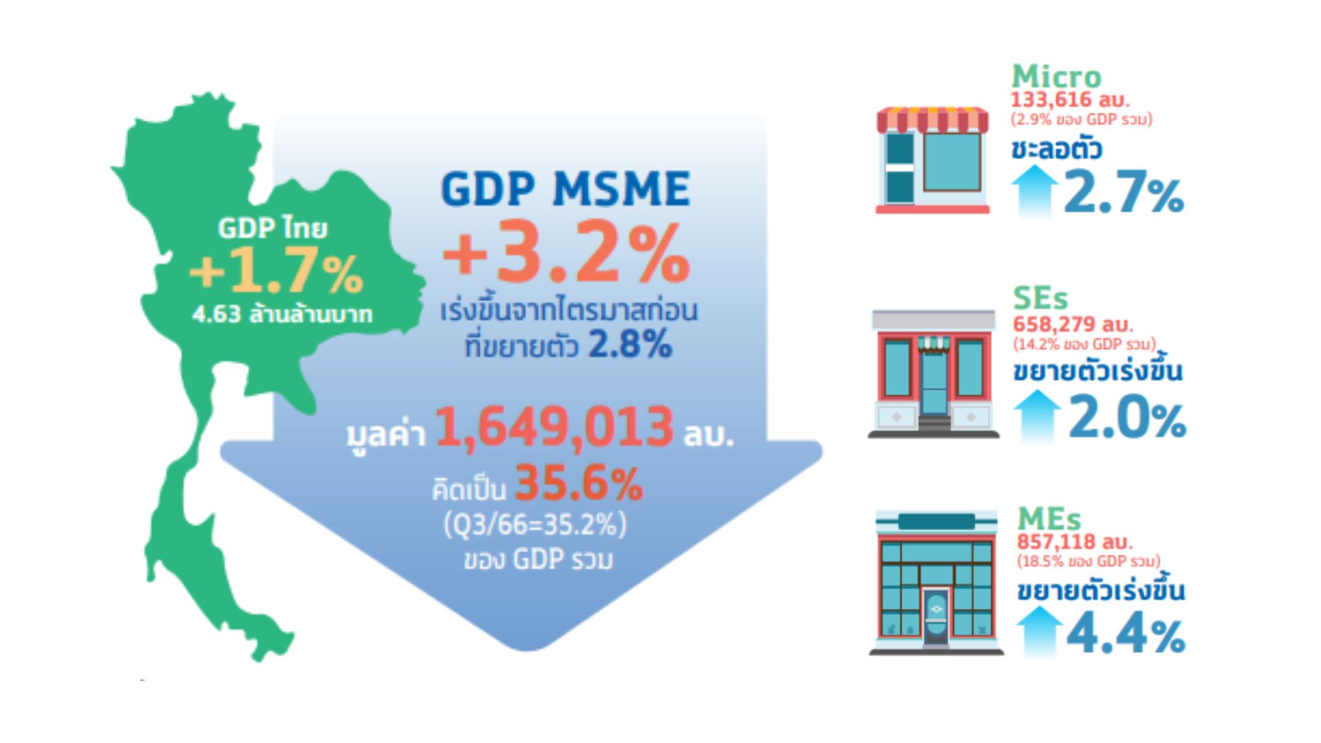 ผลิตภัณฑ์มวลรวมในประเทศของวิสาหกิจขนาดกลางและขนาดย่อม (GDP MSME) ไตรมาสที่ 4/2566 ขยายตัว 3.2% ขยายตัวเร่งขึ้นจากไตรมาสก่อนที่ขยายตัว 2.8% โดยมีมูลค่า 1,649,013 ล้านบาท คิดเป็นสัดส่วนต่อ GDP รวม เท่ากับ 35.6% ขณะที่ GDP ไทยไตรมาสที่ 4/2566 ขยายตัว 1.7% เมื่อพิจารณาตามขนาดธุรกิจ พบว่า GDP วิสาหกิจขนาดกลางขยายตัวได้มากที่สุดเท่ากับ 4.4% ขณะที่วิสาหกิจรายย่อย (Micro) และ วิสาหกิจขนาดย่อม ขยายตัวได้ 2.7% และ 2.0% ตามลําดับ เป็นการขยายตัวเร่งขึ้นจากไตรมาสก่อนทุกขนาดวิสาหกิจ เนื่องจากอัตราเงินเฟ้อที่ตํ่าทําให้การบริโภคยังคงขยายตัวได้ แม้ในด้านรายได้จากการท่องเที่ยวจะตํ่ากว่าเป้าหมายที่คาดไว้