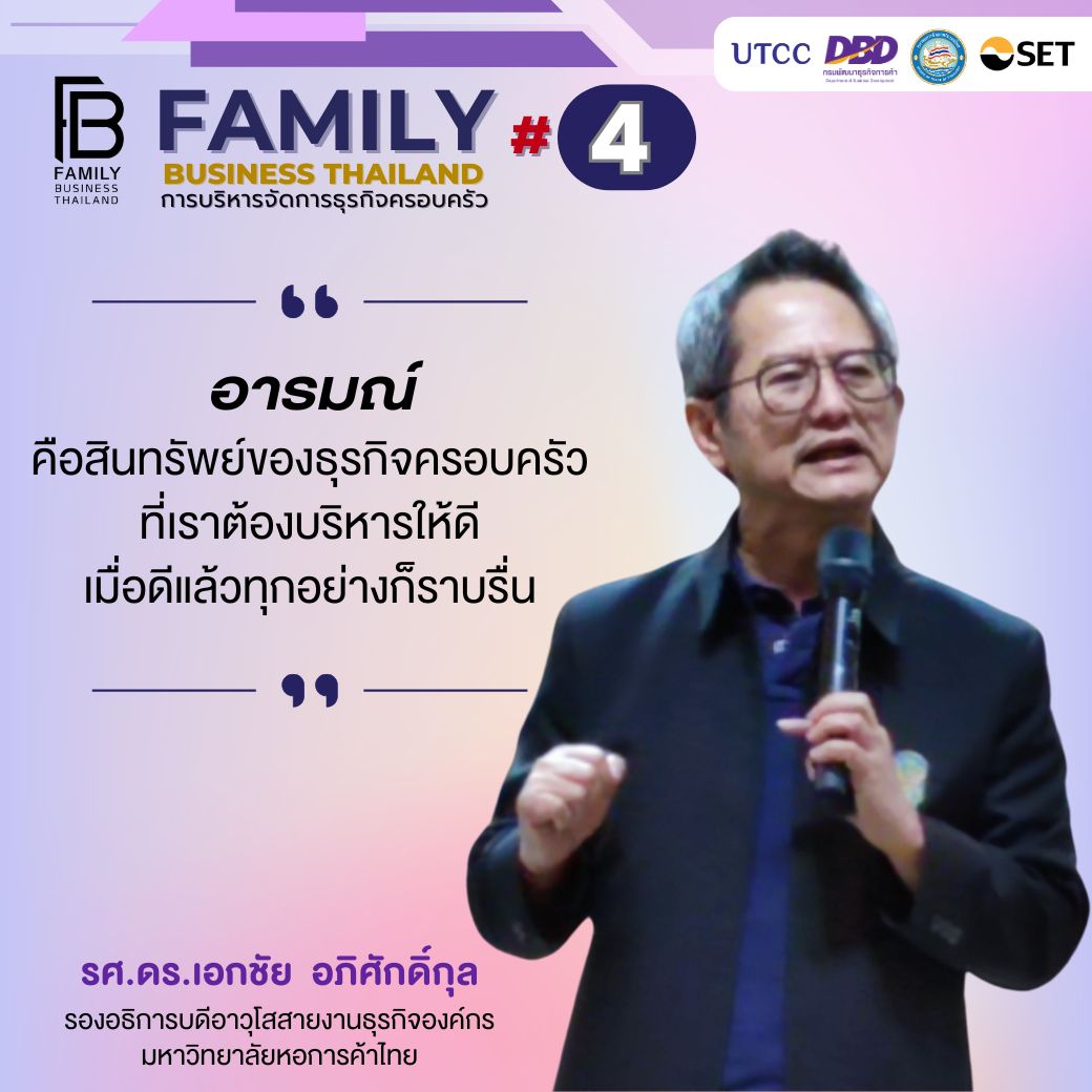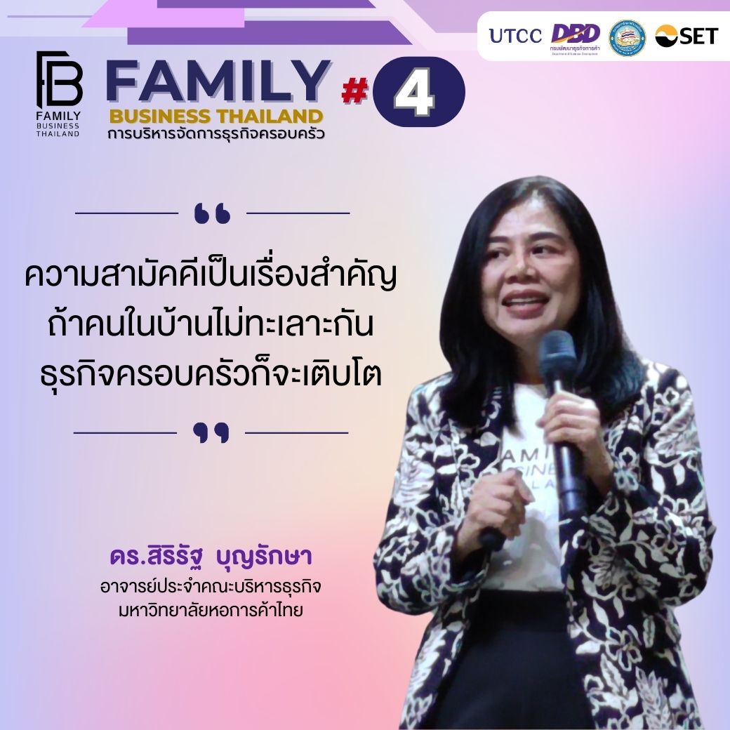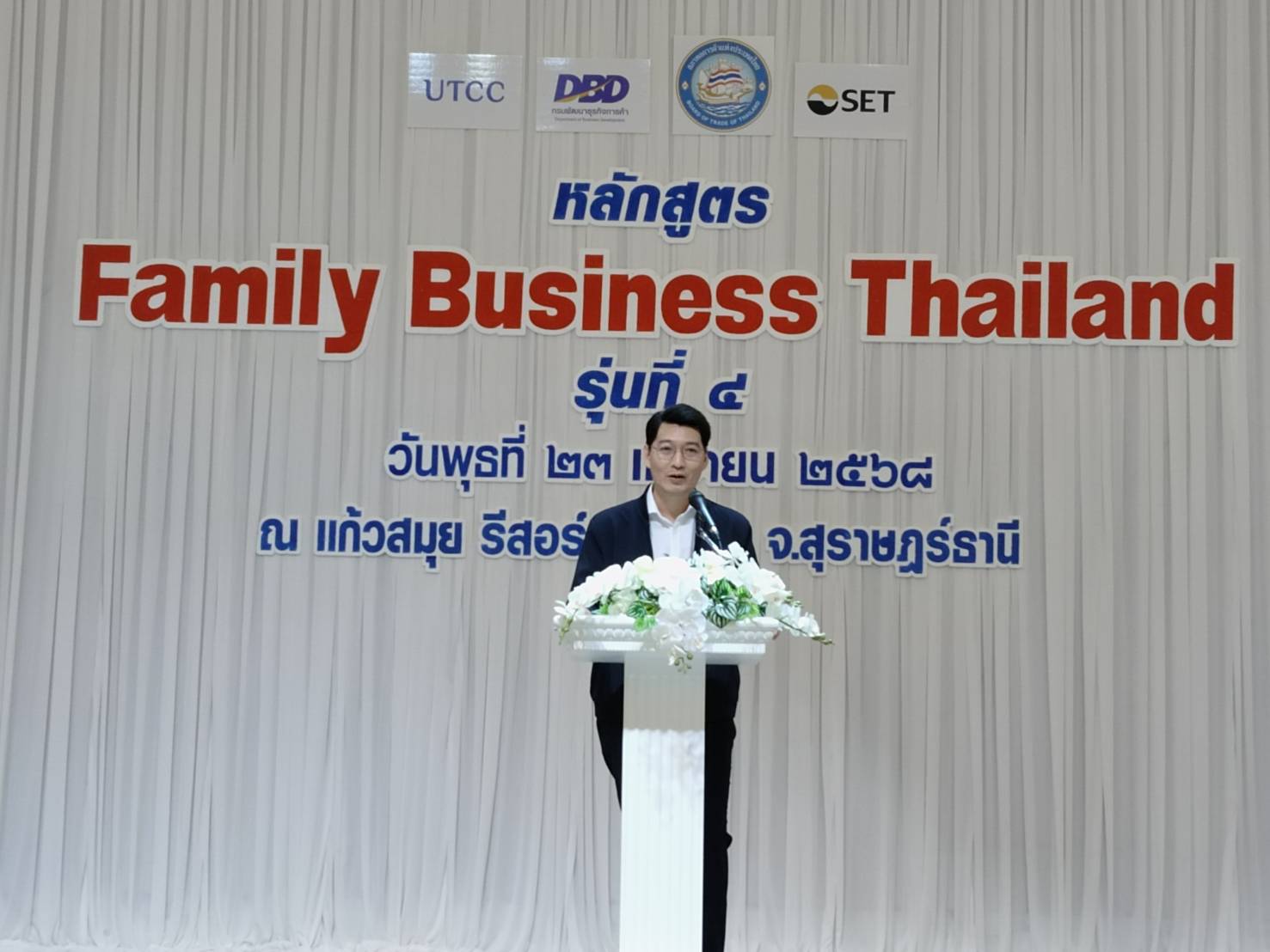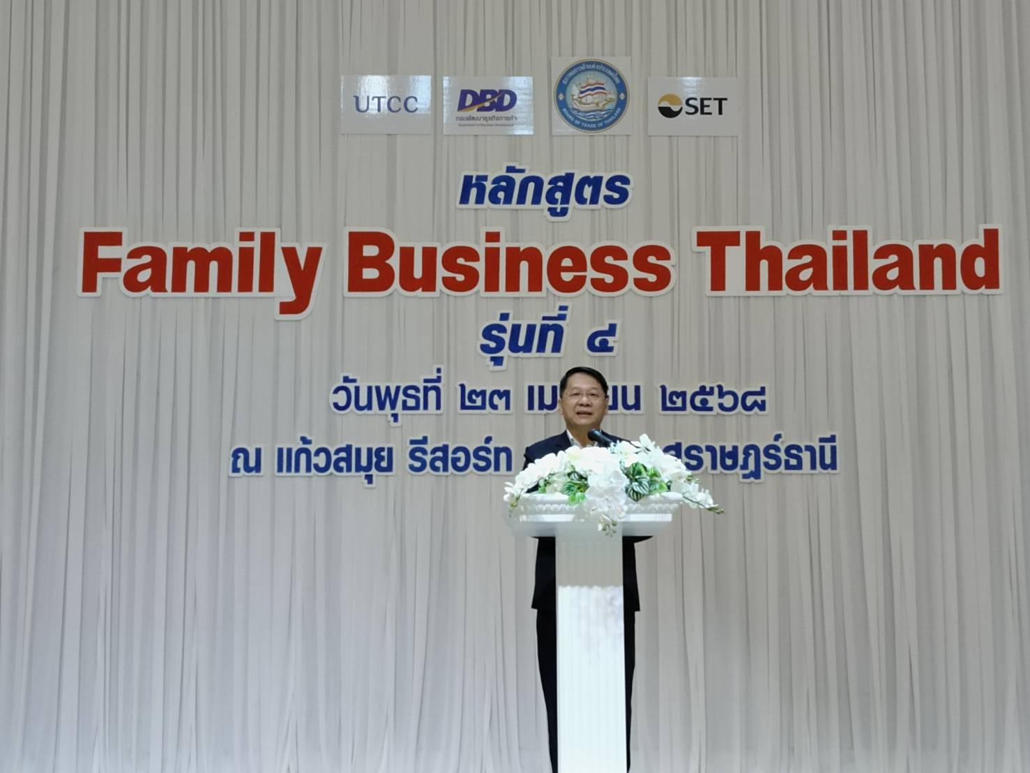 สภาหอการค้าแห่งประเทศไทย ร่วมกับ กรมพัฒนาธุรกิจการค้า กระทรวงพาณิชย์ ตลาดหลักทรัพย์แห่งประเทศไทย และมหาวิทยาลัยหอการค้าไทย จัดการอบรมหลักสูตร Family Business Thailand รุ่นที่ 4 เมื่อวันอังคารที่ 23 เมษายน 2568 ณ แก้วสมุย รีสอร์ท จังหวัดสุราษฏร์ธานี เพื่อถ่ายทอดองค์ความรู้ของการทำธุรกิจครอบครัว การสร้างกลยุทธ์การบริหารธุรกิจครอบครัว รวมถึงเคล็ดลับ และโอกาสสร้างจุดแข็งของธุรกิจครอบครัวให้เติบโตได้อย่างยั่งยืน โดยภายในงานได้รับเกียรติจาก คุณเกษียร ไลยโฆษิต ประธานหอการค้าจังหวัดสุราษฎร์ธานี กล่าวต้อนรับและเปิดการอบรม