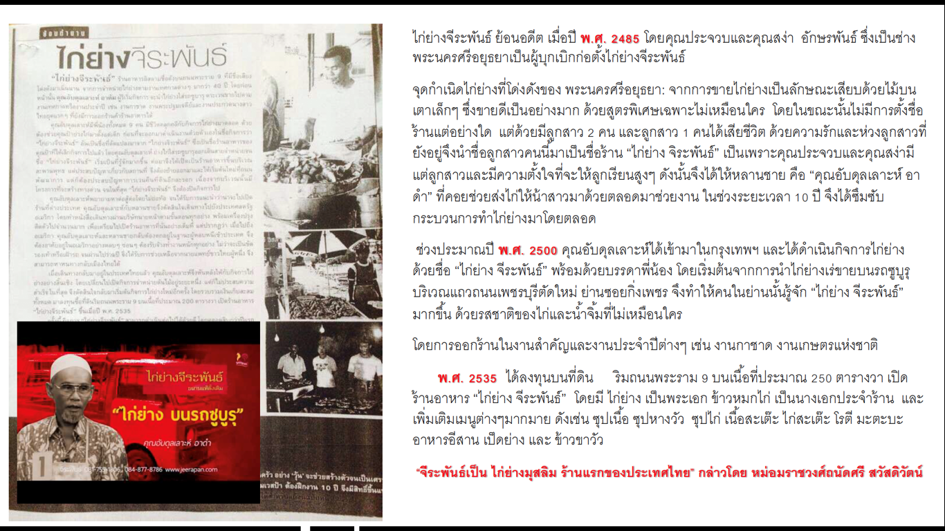 “ไก่ย่างจีระพันธ์” ก่อตั้งตั้งแต่ปี 2485 จากร้านไก่ย่างบนรถซูบารุเล็ก ๆ เดินสายขายในงานเทศกาลใหญ่ ๆ โดยเฉพาะงานวัดประจำจังหวัด จนได้ฉายาว่า “ไก่ย่างงานวัด” ถือเป็นแบรนด์มุสลิมยืนหนึ่งที่ได้รับการยอมรับและเป็นที่รู้จักอย่างดีในแวดวงชาวมุสลิม รวมทั้งถูกปากผู้คนทุกกลุ่มที่ได้ลิ้มชิมรส เกือบ 80 ปีที่เปิดดำเนินงานมา “ไก่ย่างจีระพันธ์” ผ่านร้อนผ่านหนาว ผ่านวิกฤติมาเยอะ กว่าจะมาถึงทุกวันนี้ได้