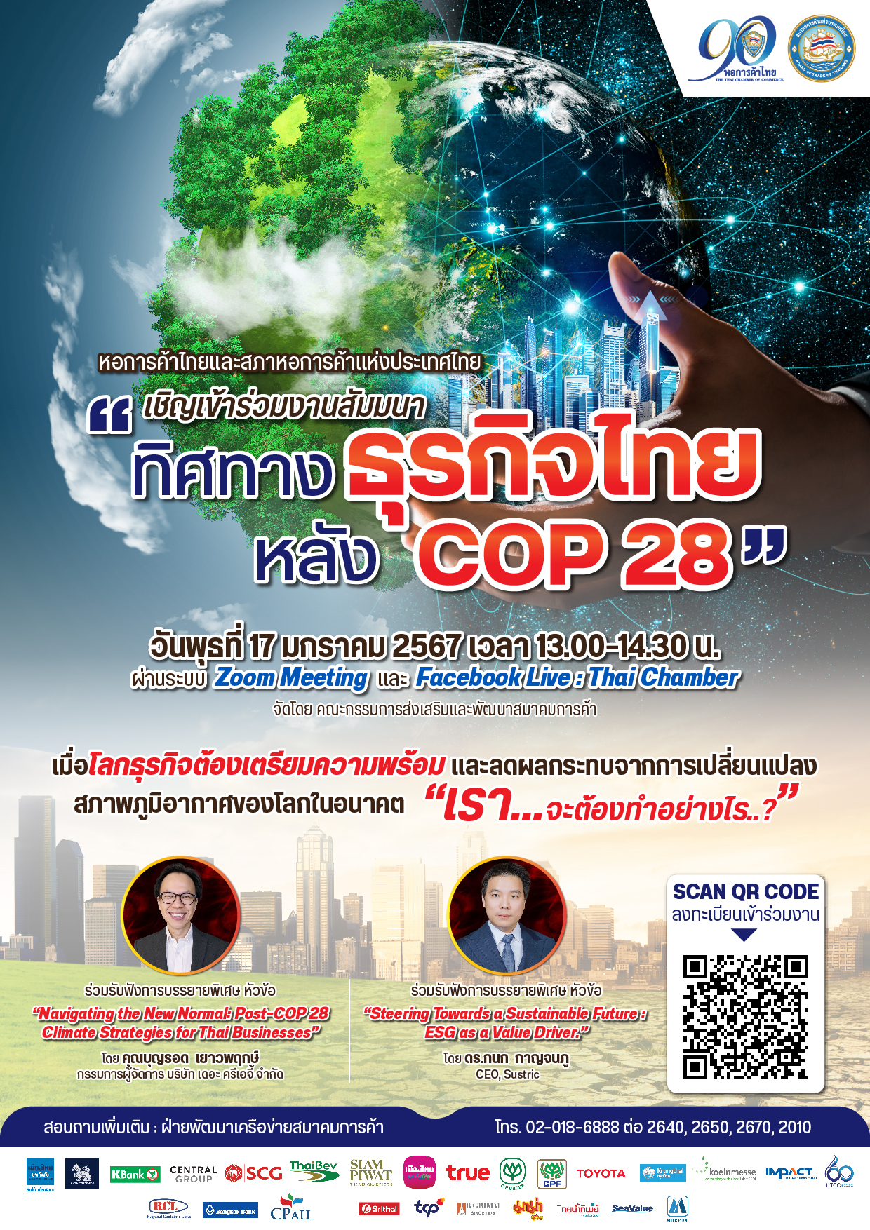 สัมมนา "ทิศทางธุรกิจไทยหลัง COP 28" วันพุธที่ 17 มกราคม 2567 เวลา 13.00-14.30 น.