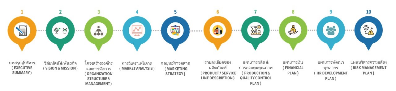 1. บทสรุปผู้บริหาร (EXECUTIVE SUMMARY) ถือเป็นปฐมบทของแผนธุรกิจในการแนะนำองค์กรในภาพใหญ่โดยจะครอบคลุมเนื้อหาดังต่อไปนี้