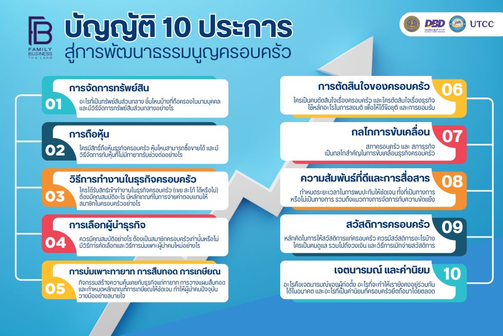 สำหรับแนวทางในการพัฒนาธรรมนูญครอบครัว ที่มหาวิทยาลัยหอการค้าไทยนำมาแลกเปลี่ยนในงานอบรมข้างต้น นอกจากธุรกิจครอบครัวจะต้องเข้าใจกระบวนการต่าง ๆ แล้ว หัวใจสำคัญของการทำธรรมนูญครอบครัวก็คือ การกำหนดบัญญัติ 10 ประการ ในการบริหารธุรกิจครอบครัวให้เติบโตอย่างยั่งยืน สรุปคร่าว ๆ ดังนี้