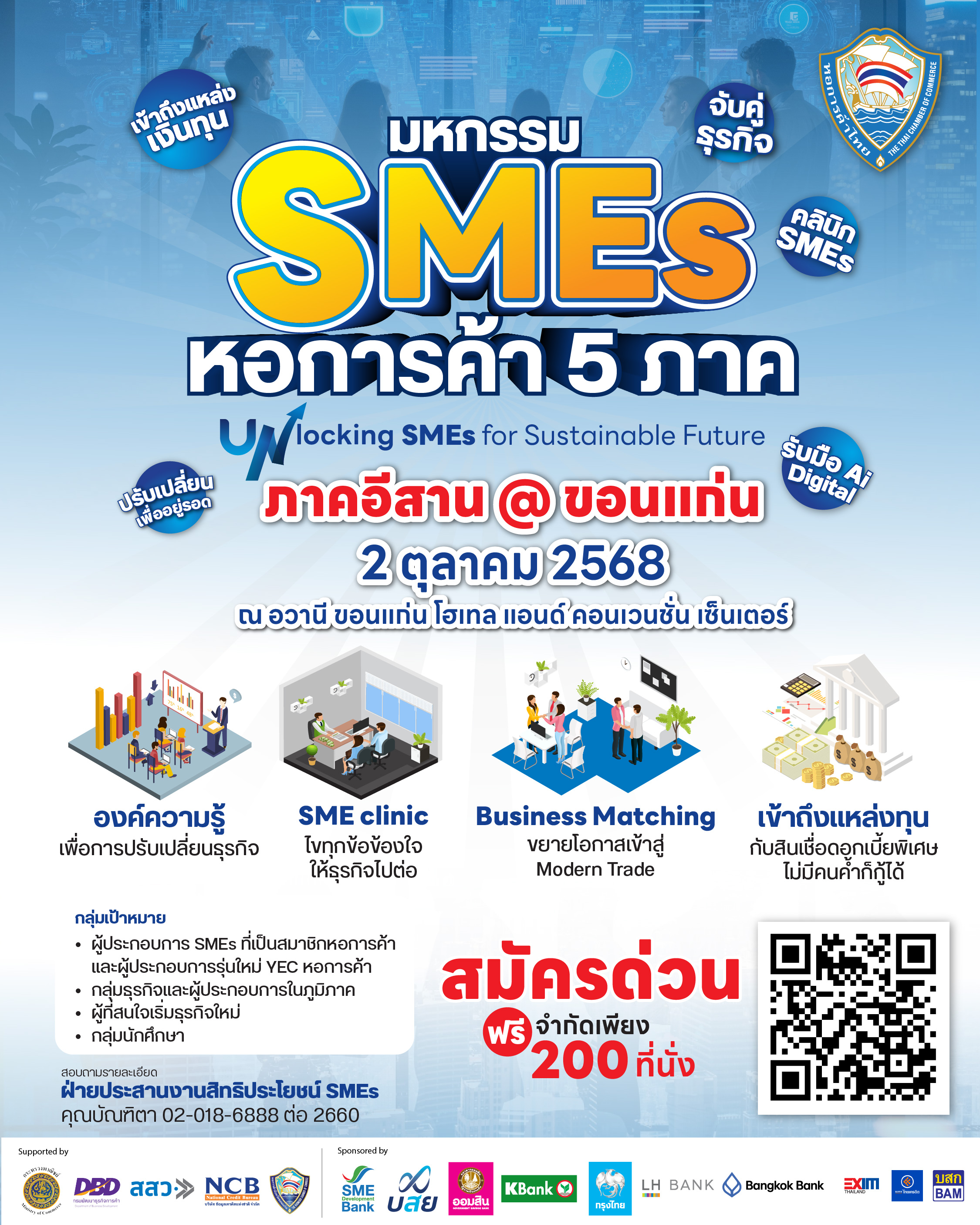 2. โชน SME Clinic ที่จะให้คำปรึกษากับผู้ประกอบการ SMEs โดยหน่วยงานพันธมิตร ทั้งภาครัฐและภาคเอกชน ที่จะไขปัญหาในการขอสินเชื่อ การให้คำปรึกษาเรื่องเครดิตบูโร การบริหารจัดการ บัญชีและภาษี รวมทั้งการเจรจาจับคู่ธุรกิจ Business Matching กับห้าง Modern Trade ชั้นนำของประเทศ นอกจากนั้น ยังมีบูธของหน่วยงานพันธมิตร โดยเฉพาะสถาบันการเงินต่าง ๆ ที่จะนำเสนอสินเชื่อเงื่อนไขพิเศษ และสิทธิประโยชน์ให้กับสมาชิกเครือข่ายหอการค้าไทย และผู้ประกอบการ SMEs ในภูมิภาค