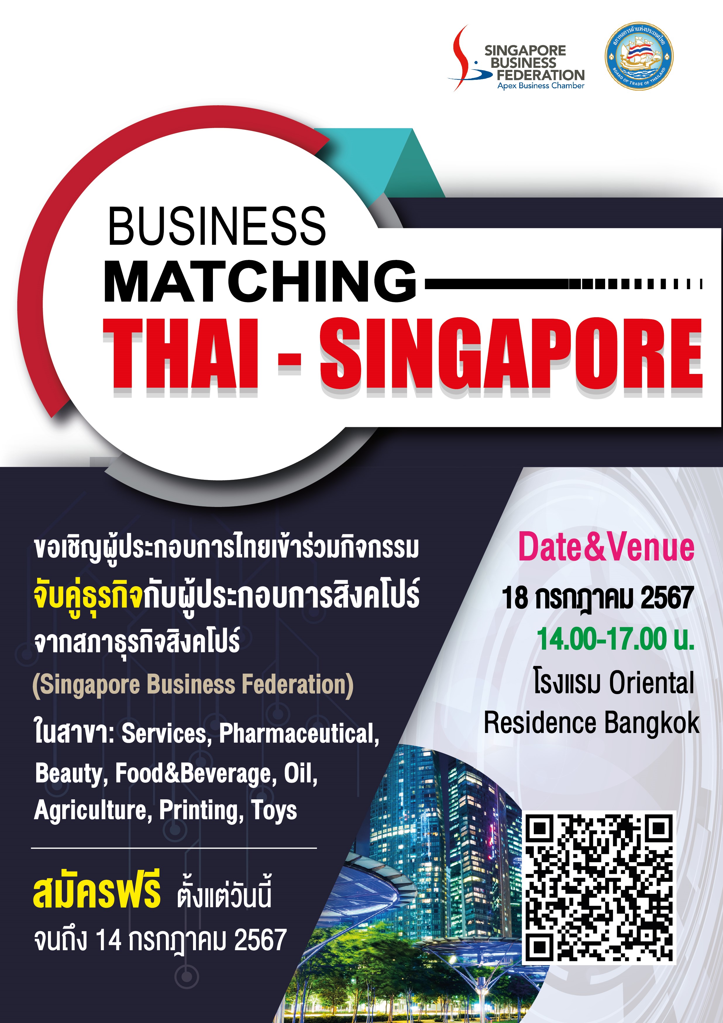 ขอเชิญผู้ประกอบการไทยเข้าร่วมกิจกรรมงานจับคู่เจรจาธุรกิจกับผู้ประกอบการสิงคโปร์ จากสภาธุรกิจสิงคโปร์ (Singapore Business Federation: SBF)