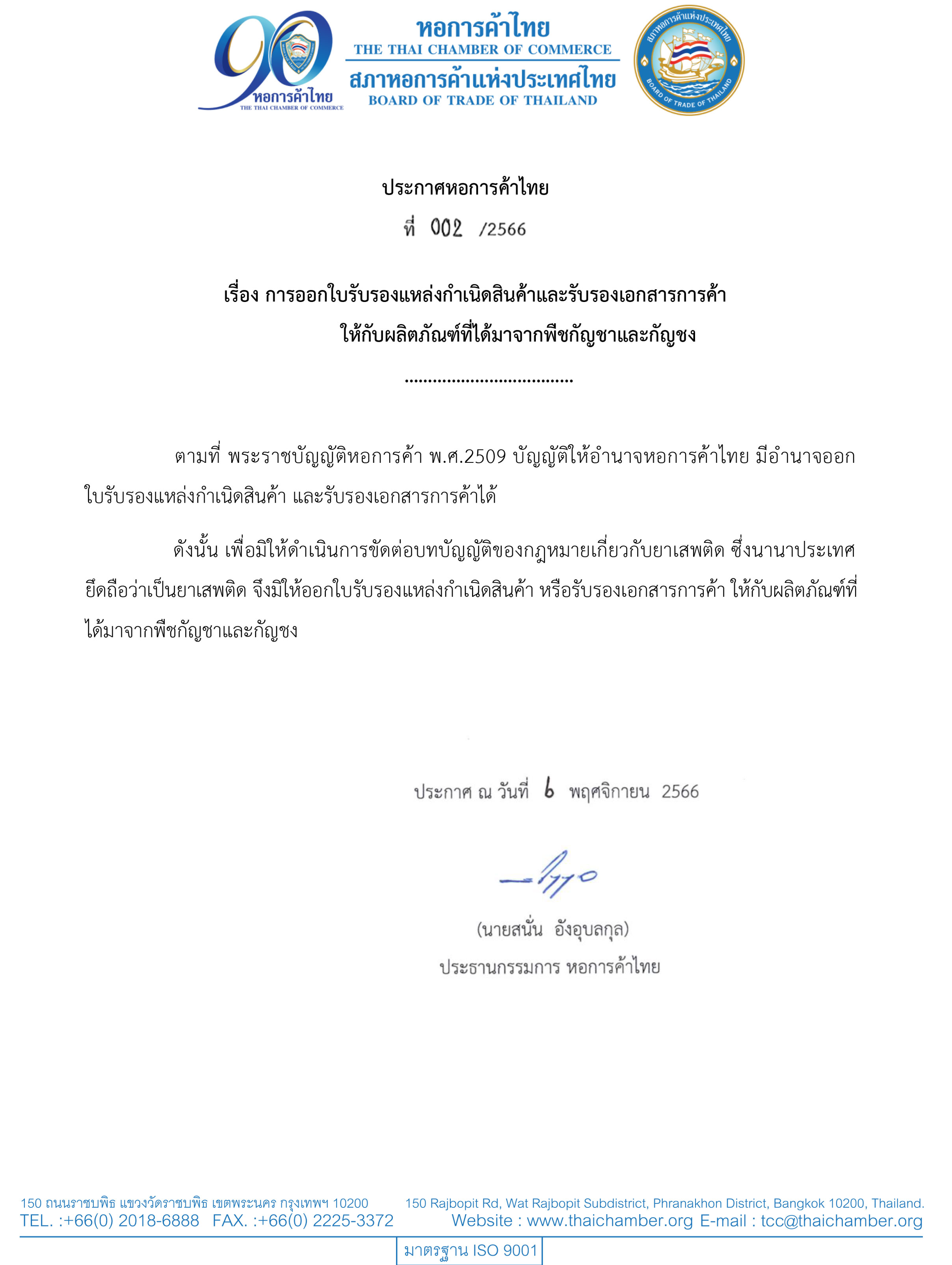 ให้กับผลิตภัณฑ์ที่ได้จากพืชกัญชาและกัญชง  คลิ๊กเอกสารที่นี่