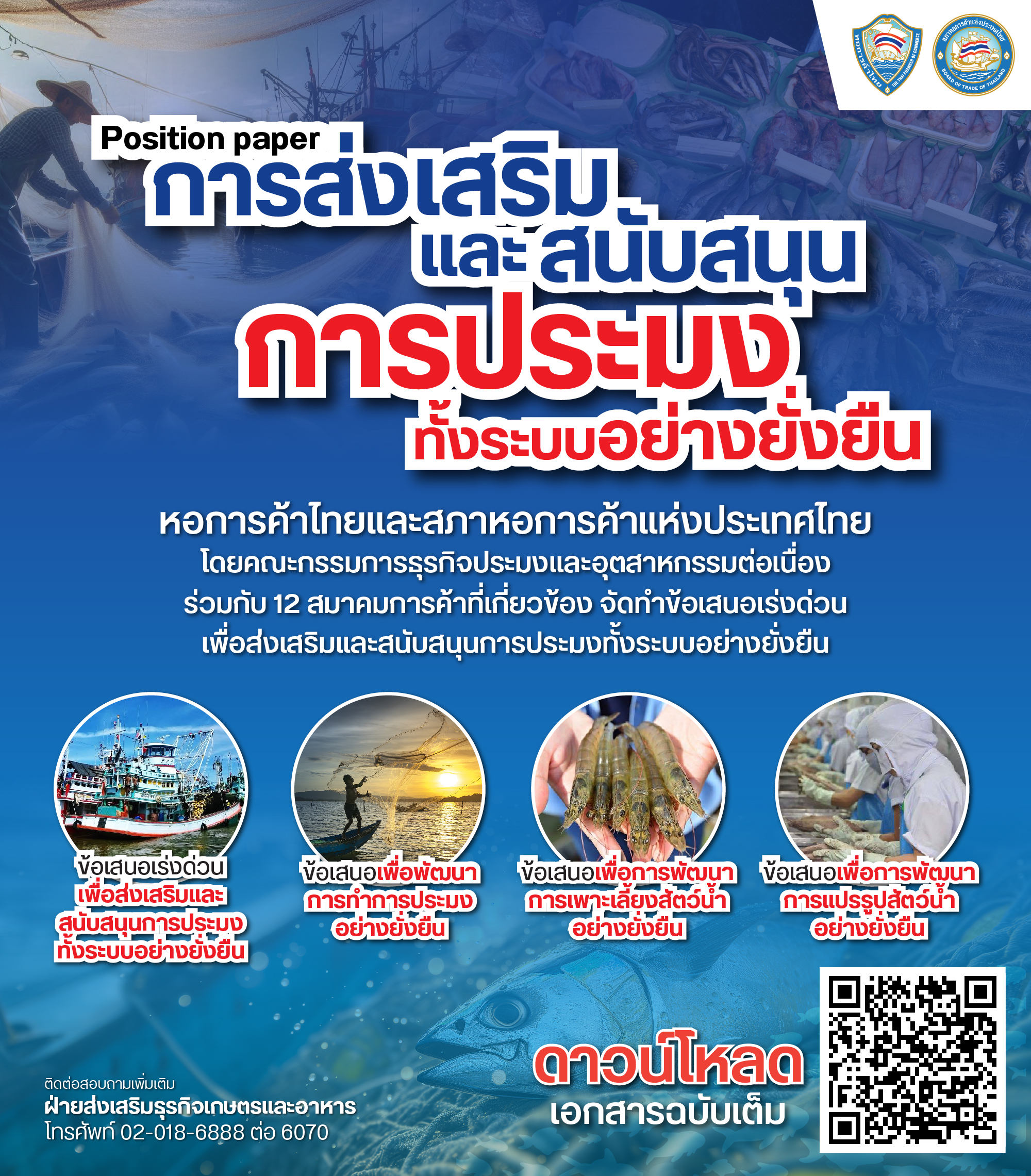 หอการค้าไทยและสภาหอการค้าแห่งประเทศไทย โดยคณะกรรมการธุรกิจประมงและอุตสาหกรรมต่อเนื่อง ร่วมกับ 12 สมาคมการค้าที่เกี่ยวข้อง ได้แก่ สมาคมอุตสาหกรรมทูน่าไทย สมาคมการค้าอาหารสัตว์เลี้ยงไทย สมาคมอาหารแช่เยือกแข็งไทย สมาคมผู้ผลิตอาหารสำเร็จรูป สมาคมผู้ผลิตปลาป่นไทย สมาคมการประมงแห่งประเทศไทย สมาคมสมาพันธ์ชาวประมงพื้นบ้านแห่งประเทศไทย สมาคมการประมงนอกน่านน้ำไทย สมาคมกุ้งไทย สมาพันธ์การเพาะเลี้ยงสัตว์น้ำไทย สมาคมผู้เพาะเลี้ยงปลาไทย และสมาคมผู้เพาะเลี้ยงปลาทะเลไทย จัดทำข้อเสนอการส่งเสริมและสนับสนุนการประมงทั้งระบบอย่างยั่งยืน (Position Paper) แบ่งเป็น 4 ประเด็นหลัก ได้แก่