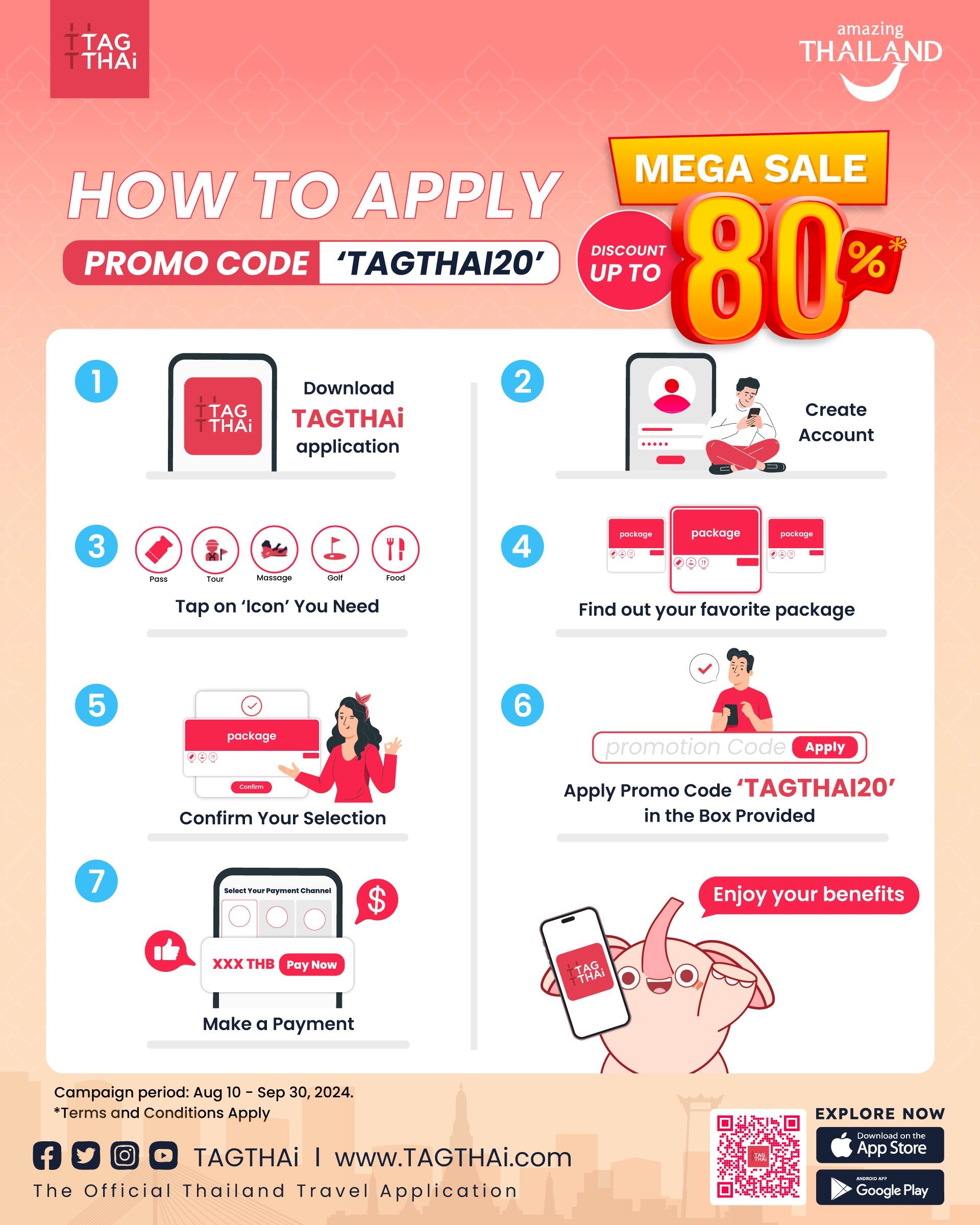 For the MEGA SALE offers, there is something here for everyone. You can get a special 20%* discount on your booking via TAGTHAi app. Just enter promo code "TAGTHAI20" when checking out.