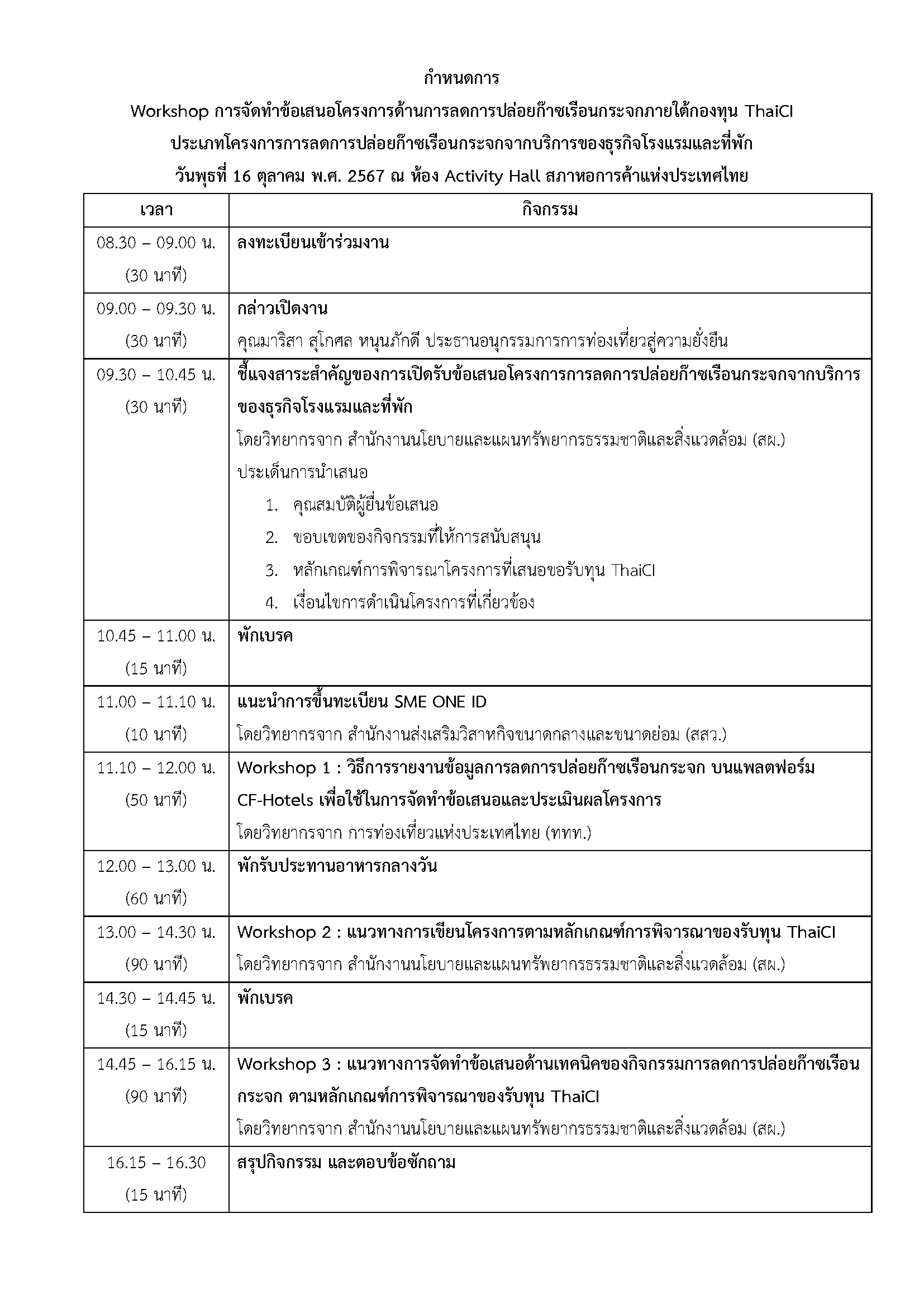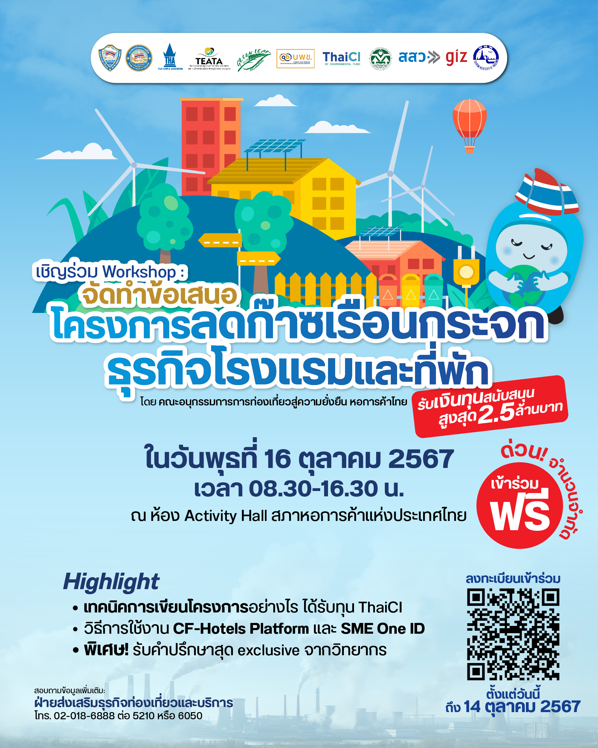 ขอเชิญผู้ประกอบการโรงแรมและที่พักร่วมกิจกรรม Workshop การจัดทำข้อเสนอโครงการด้านการลดการปล่อยก๊าซเรือนกระจก ในธุรกิจโรงแรมและที่พัก ภายใต้กองทุน ThaiCI