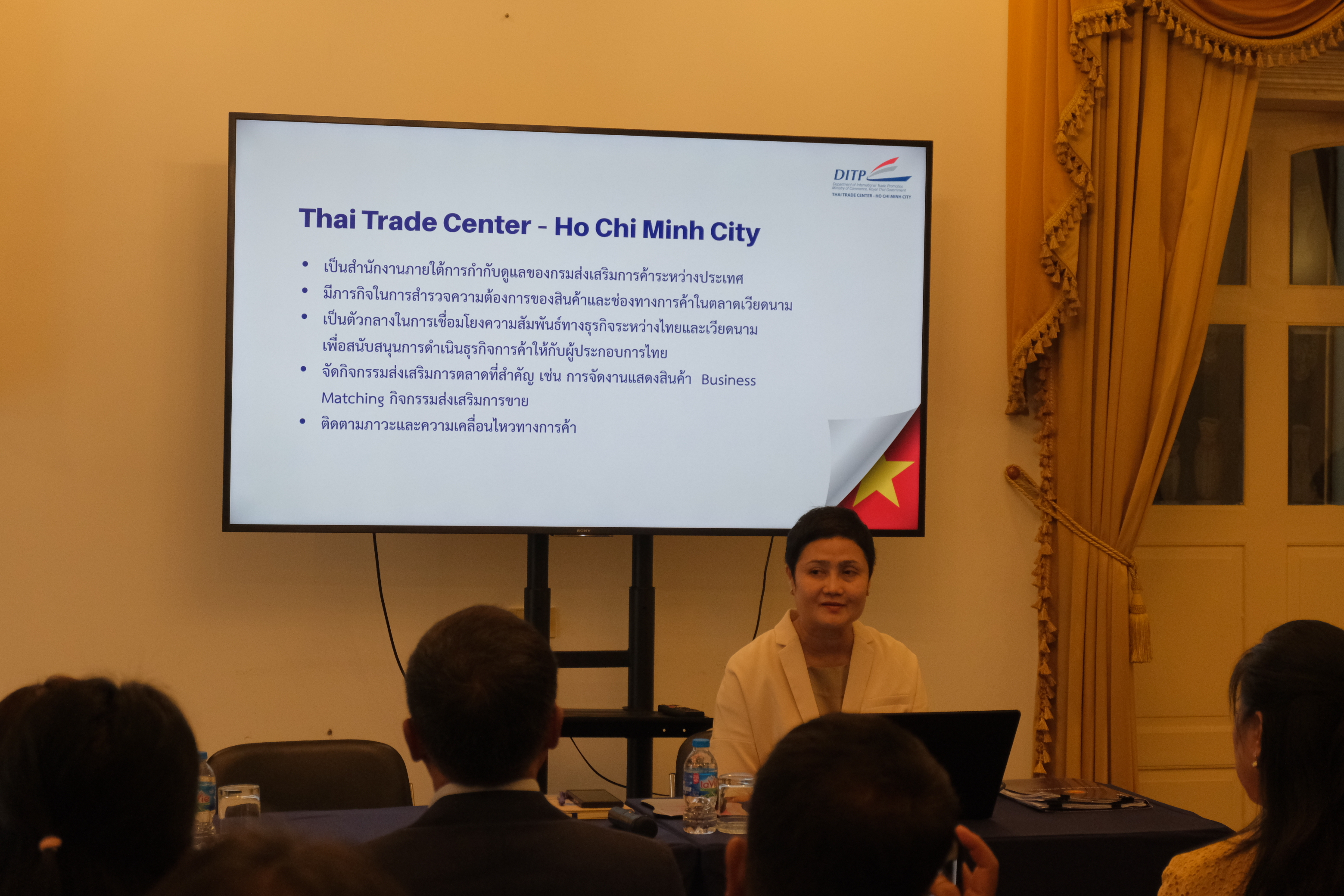 คุณอุษาศรี เขียวระยับ ผู้อำนวยการสำนักงานส่งเสริมการค้าในต่างประเทศ ณ นครโฮจิมินห์ ได้บรรยายเกี่ยวกับบทบาทและภารกิจของสำนักงานฯ ที่พร้อมสนับสนุบผู้ประกอบการไทยในไทยที่ประสงค์จะทำการค้าขายในตลาดเวียดนาม และให้ข้อมูลเกี่ยวกับงานแสดงสินค้าสำคัญ ในเวียดนามที่ประกอบการไทยอาจพิจารณาไปเข้าร่วม ทั้งนี้ ผู้บรรยายและผู้ประกอบการไทยได้ร่วมหารือ และแลกเปลี่ยนข้อคิดเห็นเกี่ยวกับโอกาสด้านการค้าและการลงทุนต่าง ๆ ในตลาดเวียดนามอย่างกว้างขวาง