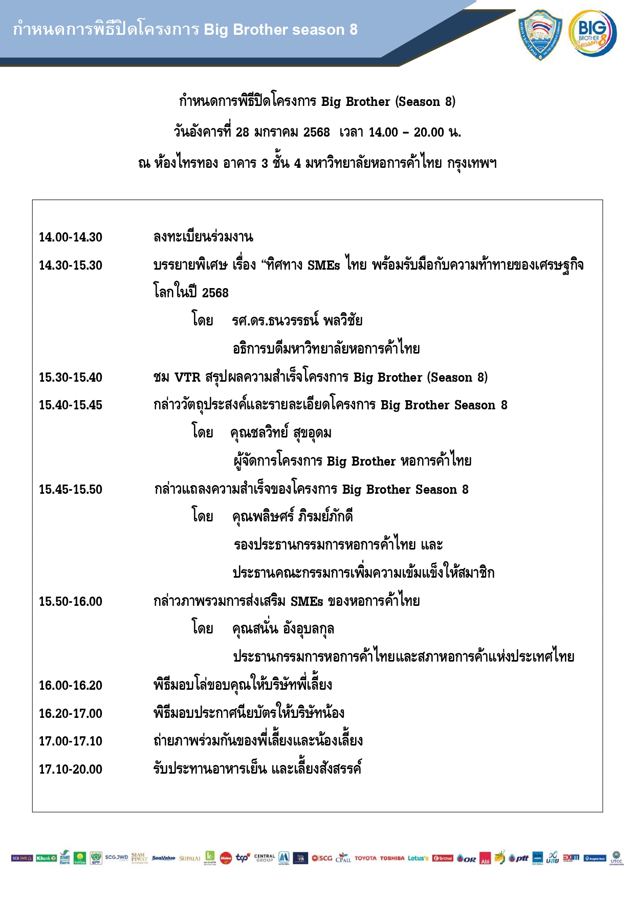 ในวันที่ 28 มกราคม 2568 กำหนดจัดพิธีปิดโครงการ Big Brother Season 8 เวลา 14.00 -20.00 น. ณ ห้องไทรทอง อาคาร 3 ชั้น 4 ม.หอการค้าไทยในการนี้ ขอยืนยันรายชื่อการเข้าร่วมงานอีกครั้ง และสำหรับท่านที่ยังไม่ได้แจ้งทีมงาน ขอความกรุณาแจ้งเก๋ภายในวันที่ 20/1/68 เพื่อเตรียมงานต่อไป ทั้งนี้ หากท่านใดมีการแจ้งมาแต่ข้อมูลไม่ตรงกัน สามารถติดต่อแก้ไขมายังทีมงานได้เลยครับ