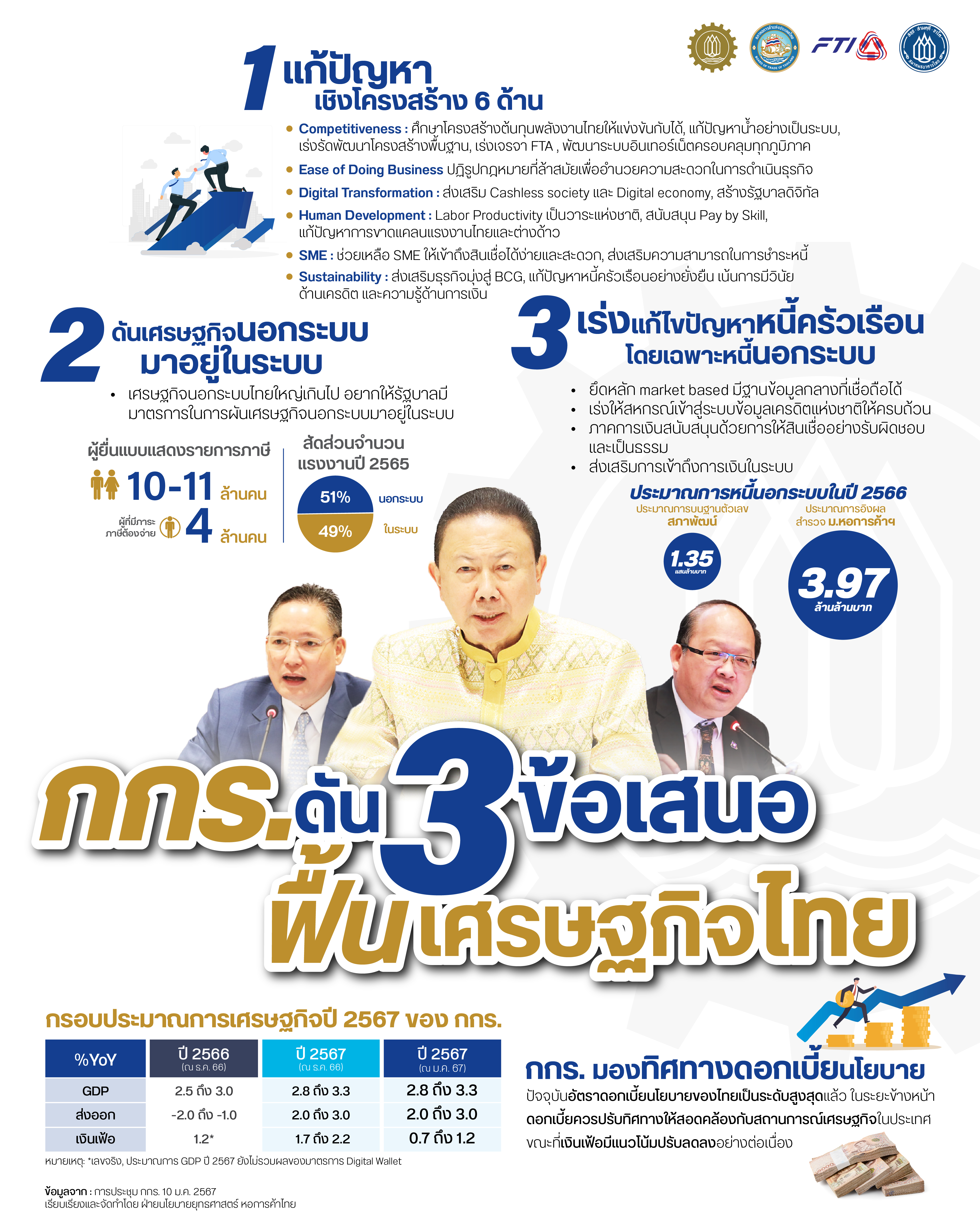 ที่ประชุม กกร. ได้เล็งเห็นถึงความสำคัญของการวางรากฐานเพื่อเพิ่มศักยภาพการเติบโตของเศรษฐกิจไทย จึงเสนอประเด็นสำคัญ 3 ประการที่อยากให้รัฐบาลขับเคลื่อนในปี 2567 ดังนี้