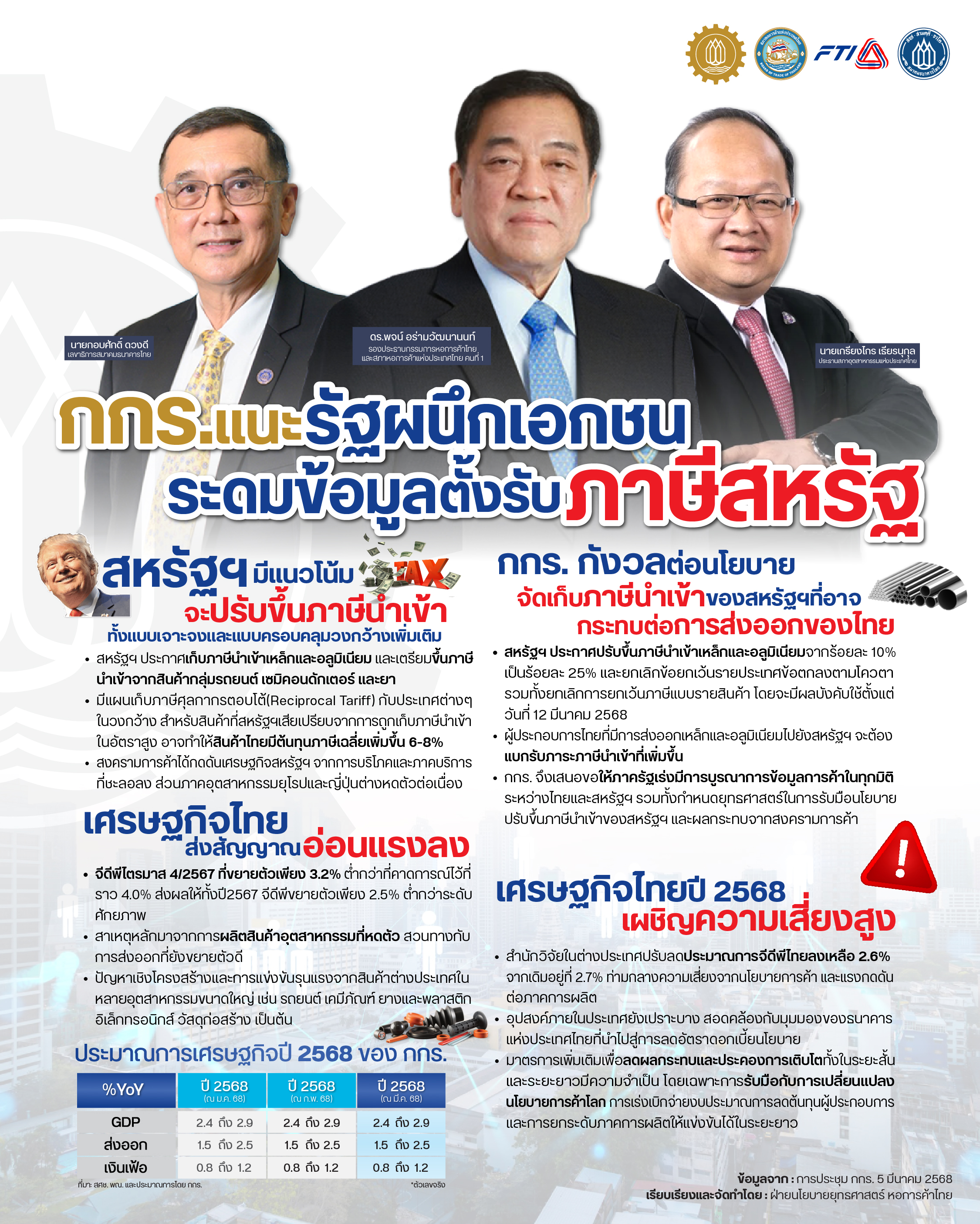 โดยล่าสุดสหรัฐฯ มีการประกาศปรับขึ้นภาษีนำเข้าเหล็กและอลูมิเนียมจากร้อยละ 10% เป็นร้อยละ 25% และยกเลิกข้อยกเว้นรายประเทศ ข้อตกลงตามโควตา รวมทั้งยกเลิกการยกเว้นภาษีแบบรายสินค้า โดยจะมีผลบังคับใช้ตั้งแต่วันที่ 12 มีนาคม 2568 ทำให้ผู้ประกอบการไทยที่มีการส่งออกเหล็กและอลูมิเนียมไปยังสหรัฐฯ จะต้องแบกรับภาระภาษีนำเข้าที่เพิ่มขึ้น ดังนั้น กกร. จึงเสนอขอให้ภาครัฐเร่งมีการบูรณาการข้อมูลการค้าในทุกมิติระหว่างไทยและสหรัฐฯ อาทิ ดุลการค้า ดุลภาคบริการและดิจิทัล ดุลภาคขนส่ง ดุลภาคการศึกษา เป็นต้น เพื่อนำมาวิเคราะห์กำหนดท่าทีร่วมกับภาคเอกชน ในการเจรจาการค้าระหว่าง 2 ประเทศ รวมทั้งกำหนดยุทธศาสตร์ในการรับมือนโยบายปรับขึ้นภาษีนำเข้าของสหรัฐฯ และผลกระทบจากสงครามการค้า เพื่อบรรเทาผลกระทบของผู้ประกอบการและสร้างโอกาสทางการค้าใหม่ๆ ลดการพึ่งพาตลาดเดิม