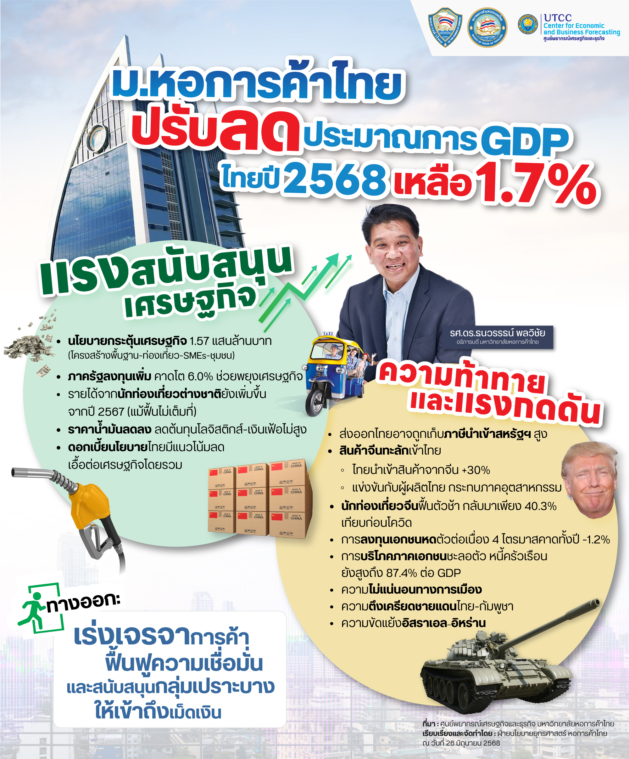 ศูนย์พยากรณ์เศรษฐกิจและธุรกิจ มหาวิทยาลัยหอการค้าไทย ปรับลดประมาณการอัตราการเติบโตทางเศรษฐกิจ (GDP) ของประเทศไทยในปี 2568 ลงเหลือเพียง 1.7% จากเดิมที่คาดการณ์ไว้ที่ 3.0% โดยให้เหตุผลว่าเศรษฐกิจไทยกำลังเผชิญแรงกดดันจากทั้งภายนอกและภายในประเทศ พร้อมเสนอแนวทางเร่งด่วนเพื่อขับเคลื่อนเศรษฐกิจ