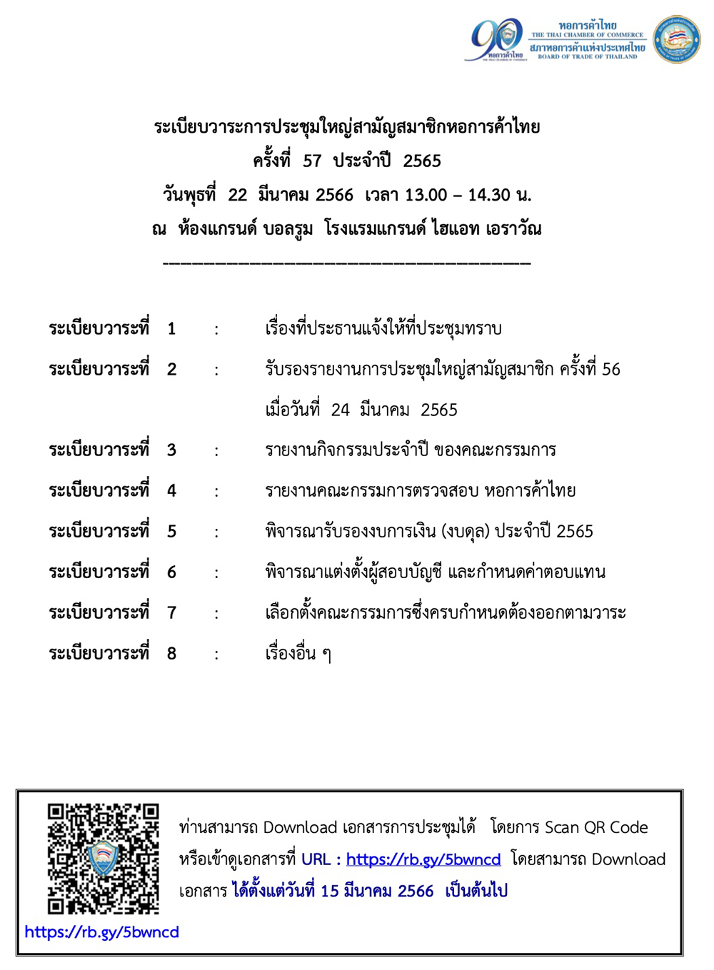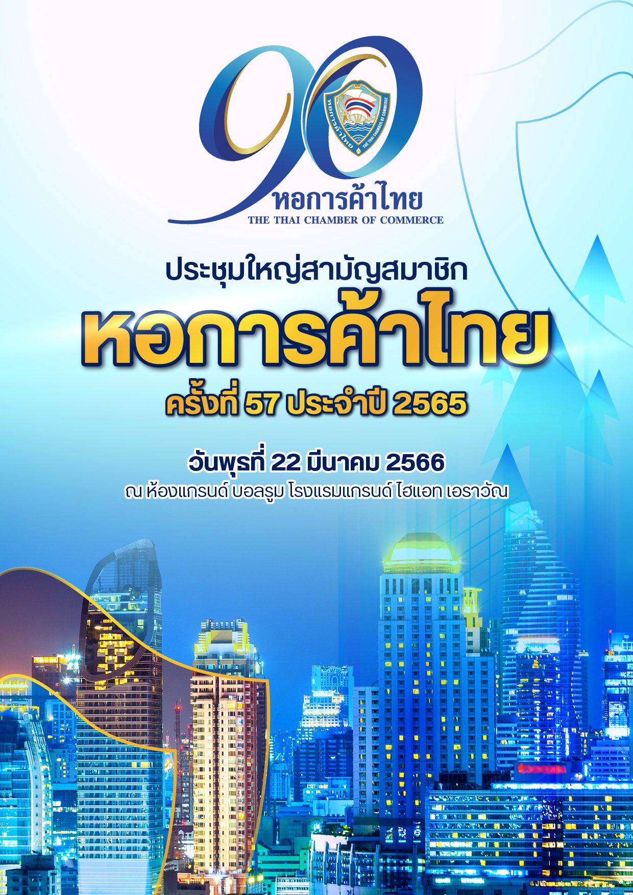 ประชุมใหญ่สามัญสมาชิกการค้าไทย หอการค้าไทย ครั้งที่ 57 ประจำปี 2565 วันพุธที่ 22 มีนาคม 2566 ณ ห้องแกรนด์ บอลรูบ โรงแรมแกรนด์ ไฮแอท เอราวัณ