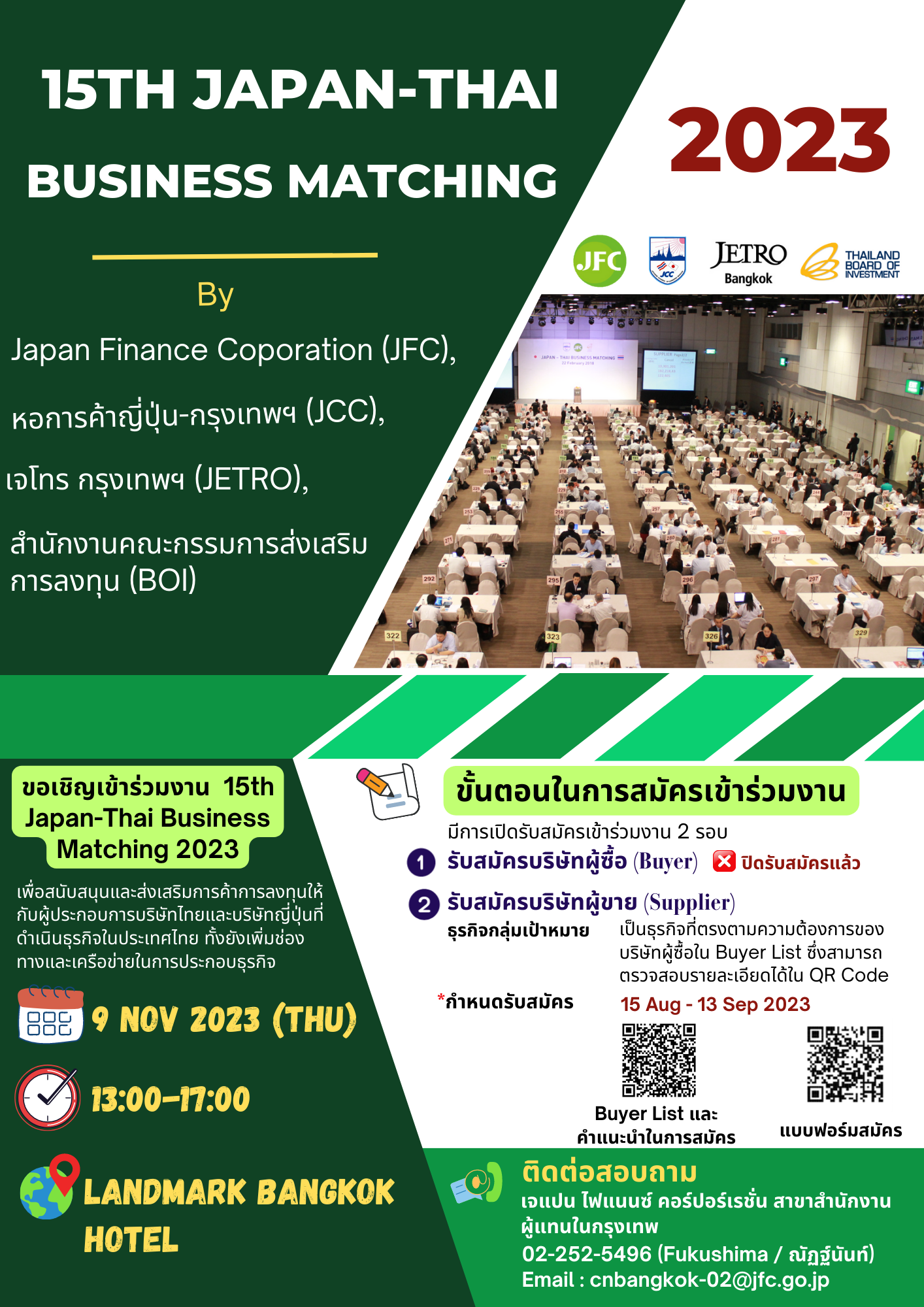 หอการค้าญี่ปุ่น-กรุงเทพฯ (JCC) ร่วมกับ Japan Finance Corporation (JFC), เจโทรกรุงเทพฯ (JETRO), และ สํานักงานคณะกรรมการส่งเสริมการลงทุน (BOI) เปิดรับสมัคร “ผู้ขาย” (Supplier) เข้าร่วมงาน “15th Japan-Thai Business Matching 2023” งานจับคู่ธุรกิจระหว่างผู้ประกอบการไทยและญี่ปุ่น เพื่อส่งเสริมการค้าการลงทุนของทั้งสองประเทศ