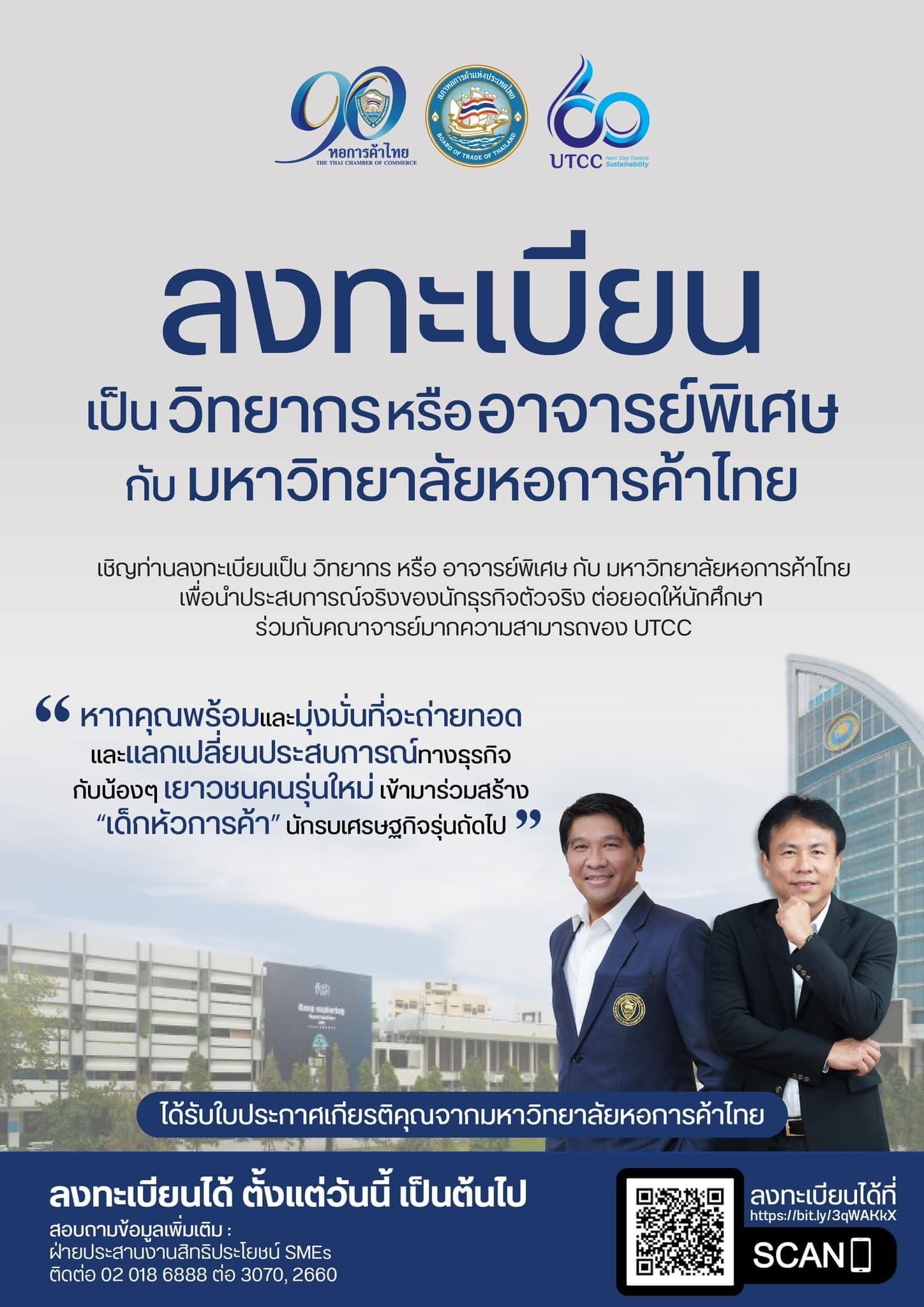 หากคุณพร้อมและมุ่งมั่น ที่จะถ่ายทอด แลกเปลี่ยนประสบการณ์ทางธุรกิจกับน้อง ๆ เยาวชนคนรุ่นใหม่ เราขอเชิญชวนให้คุณเข้ามาร่วมสร้าง “เด็กหัวการค้า” นักรบเศรษฐกิจรุ่นถัดไปกับเรา โดยสามารถลงทะเบียนร่วมเป็นวิทยากรหรืออาจารย์พิเศษกับมหาวิทยาลัยหอการค้าไทย ได้ที่ https://bit.ly/3qWAKkX เพื่อนำประสบการณ์จริง ของนักธุรกิจตัวจริง มาต่อยอดให้นักศึกษา ร่วมกับคณาจารย์มากความสามารถของเรา โดยเปิดลงทะเบียนตั้งแต่วันนี้เป็นต้นไป หรือสอบถามข้อมูลเพิ่มเติมได้ที่ ฝ่ายประสานงานสิทธิประโยชน์ SMEs หอการค้าไทย โทร. 02 018 6888 ต่อ 3070, 2660