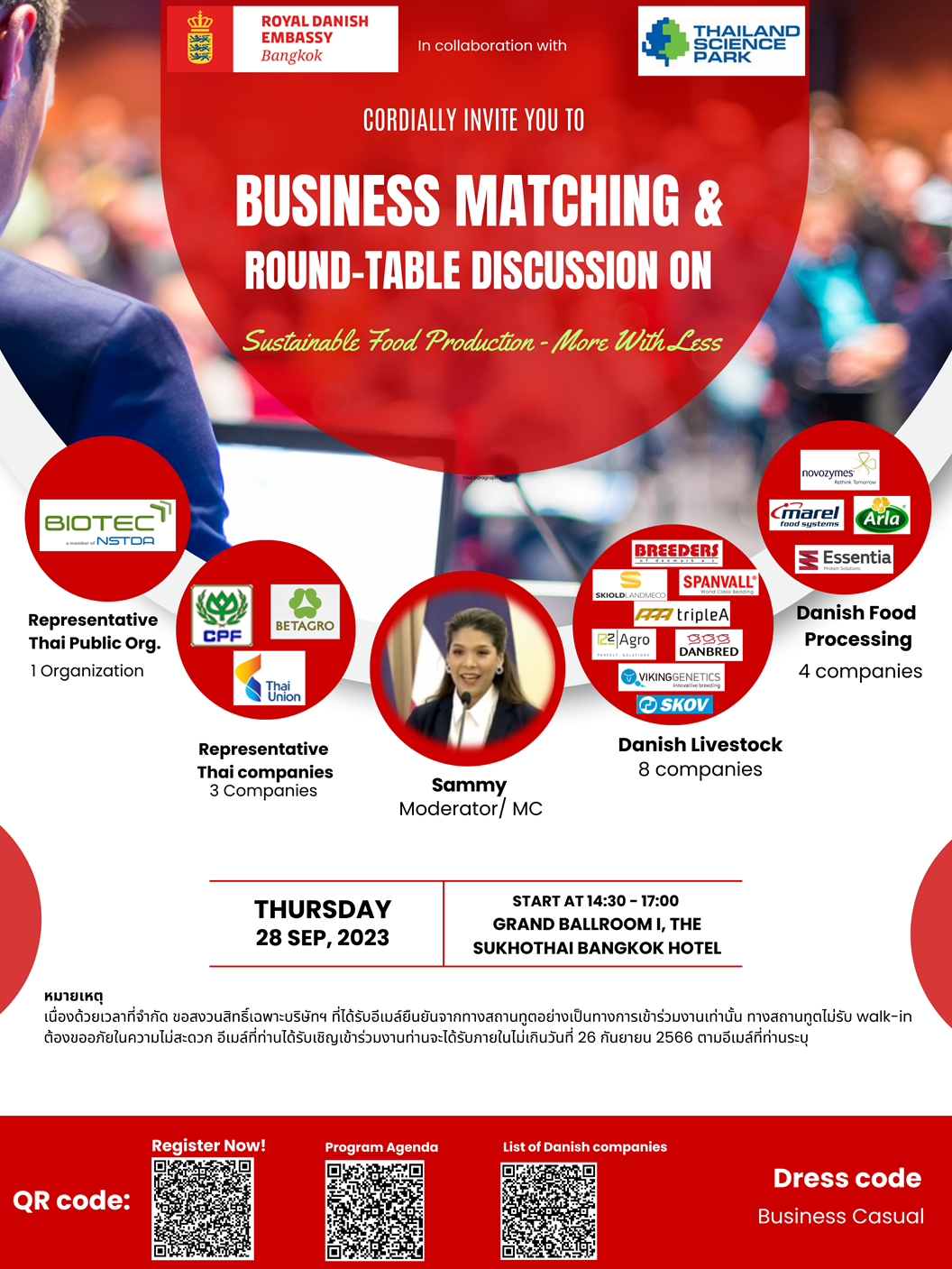 สถานเอกอัครราชทูตเดนมาร์ก ประจำประเทศไทย มีกำหนดจัดงานสัมมนา "Round Table Business Conference: Sustainable Food Production-More with Less" ในวันพฤหัสบดีที่ 28 กันยายน 2566 เวลา 14.30-17.00 น. ณ ห้อง Grand Ballroom 1 โรงแรมเดอะ สุโขทัย กรุงเทพ โดยงานสัมมนาฯ มีวัตถุประสงค์ในการกระชับความสัมพันธ์ระหว่างไทยและเดนมาร์ก โดยเฉพาะอย่างยิ่งเพื่อหารือแลกเปลี่ยนข้อคิดเห็นเพื่อรับมือกับความท้าทายต่าง ๆ ที่มีต่อด้านปศุสัตว์ ตลาดอาหารแปรรูป ในการบรรลุเป้าหมาย SDGs ตลอดจนเพื่อให้ฝ่ายไทยได้รับทราบความก้าวหน้าและแนวทางการพัฒนาด้านปศุสัตว์ และการผลิตอาหารของเดนมาร์ก