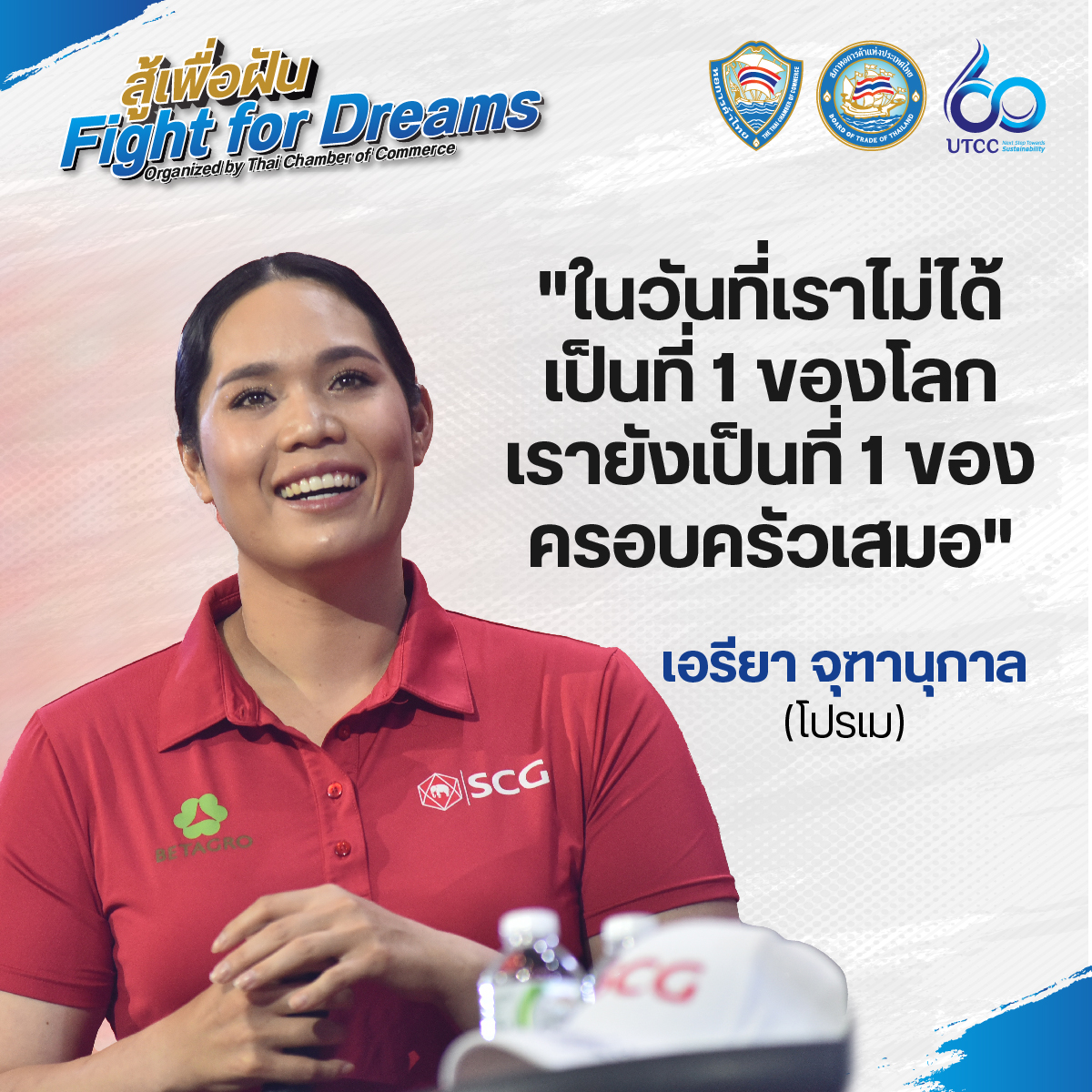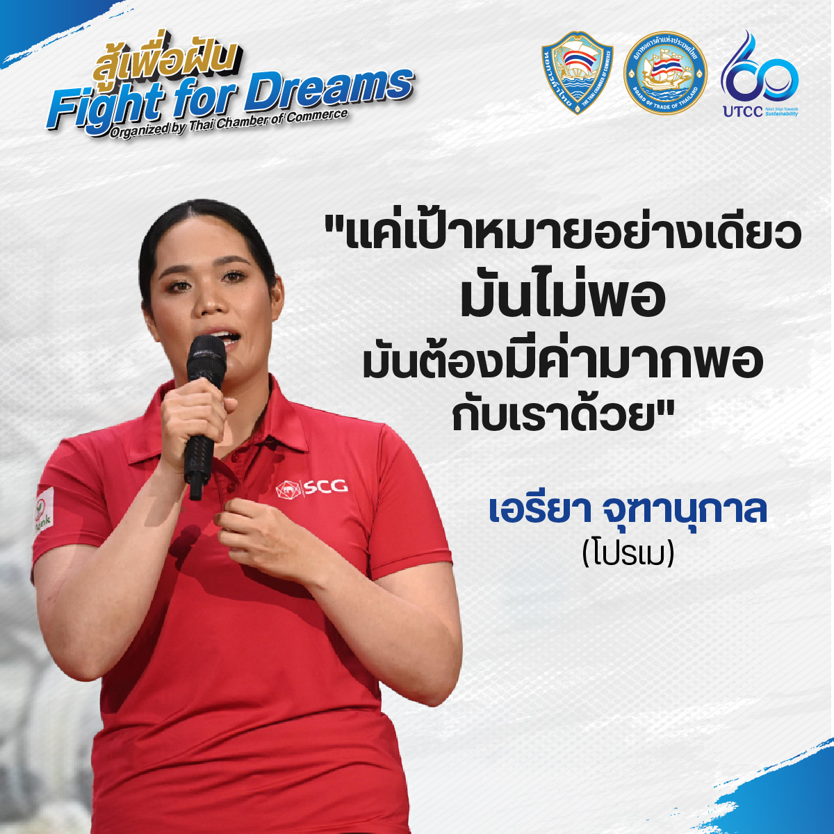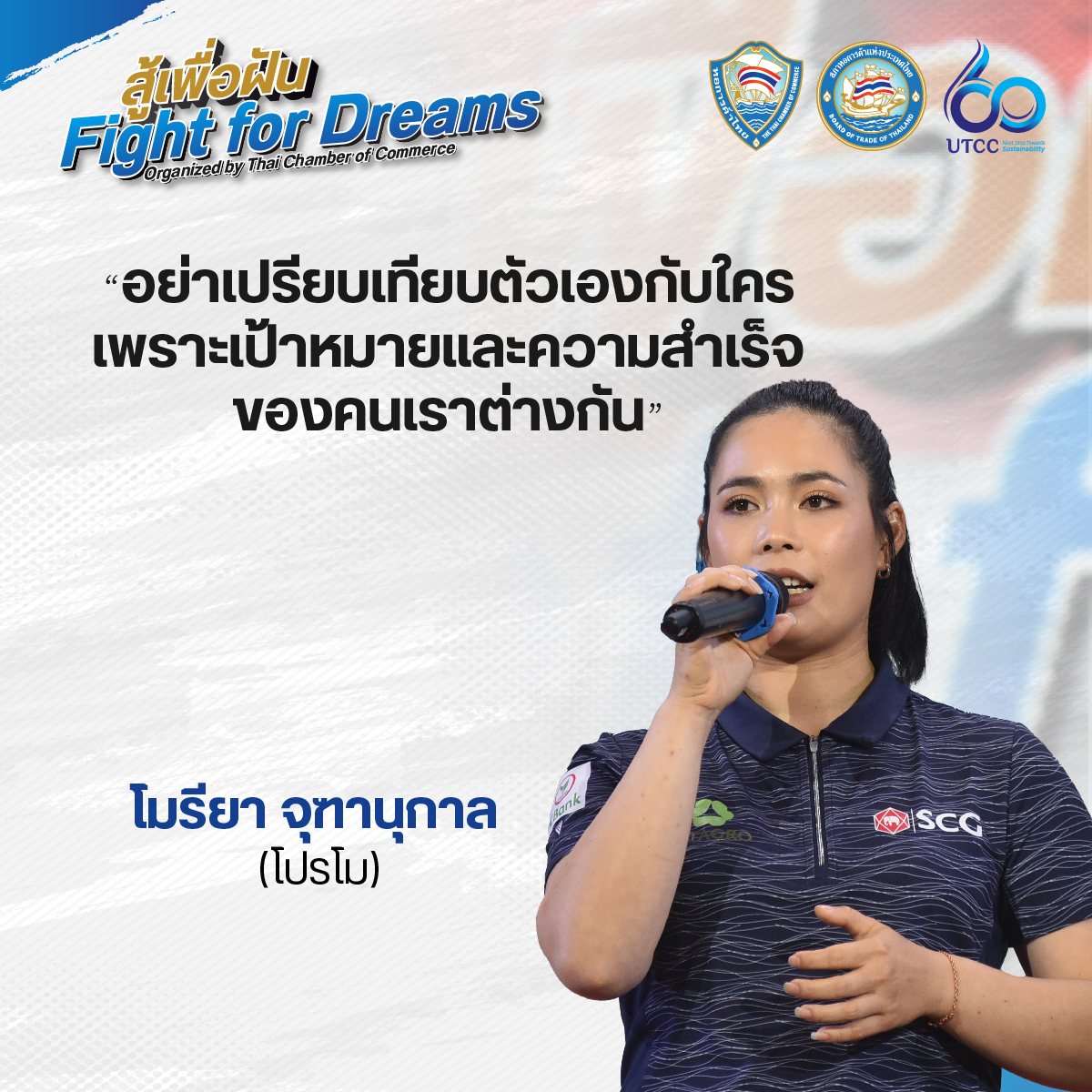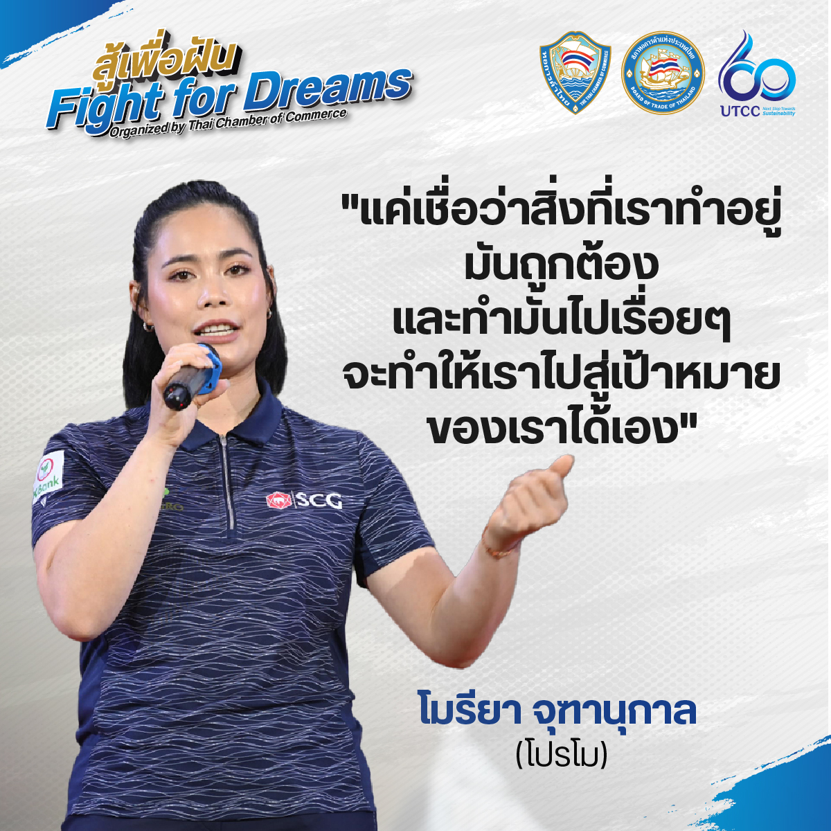 หอการค้าไทย ร่วมกับมหาวิทยาลัยหอการค้าไทย และ SCG บริษัท ปูนซิเมนต์ไทย จำกัด (มหาชน) จัดกิจกรรม “สู้เพื่อฝัน Fight for Dreams” โดยเชิญ 2 สาวโปรกอล์ฟมืออาชีพของประเทศไทย นางสาวโมรียา จุฑานุกาล (โปรโม) และนางสาวเอรียา จุฑานุกาล (โปรเม) ที่สร้างตำนานการเป็นโปรกอล์ฟมืออาชีพสู่เบอร์ 1 ของโลก พร้อมทั้งได้รับรางวัลการทูตสาธารณะ ในปี 2566 จากมูลนิธิไทย มาร่วมเล่าประสบการณ์ความภาคภูมิใจ แลกเปลี่ยนความคิดเห็นในมุมมองต่างๆ รวมถึงถ่ายทอดแรงบันดาลใจให้กับนักธุรกิจรุ่นใหม่ (YEC) นักเรียน นักศึกษา และบุคคลทั่วไป ที่พร้อมจะสู้เพื่อฝันของตนเอง ให้จุดประกายฝัน ก้าวสู่ความสำเร็จไปด้วยกัน เมื่อวันที่ 11 มกราคม 2567 ณ หอประชุมมหาวิทยาลัยหอการค้าไทย โดยมี นายสนั่น อังอุบลกุล ประธานกรรมการหอการค้าไทยและสภาหอการค้าแห่งประเทศไทย และนายกสภามหาวิทยาลัยหอการค้าไทย พร้อมด้วย นางกอบกาญจน์ วัฒนวรางกูร อดีตรัฐมนตรีกระทรวงท่องเที่ยวและกีฬา และกรรมการหอการค้าไทย, นางกาญจนา ภัทรโชค อธิบดีกรมสารสนเทศ กระทรวงการต่างประเทศ ตลอดจนผู้บริหารและบุคลากรจาก เอสซีจี เข้าร่วมรับฟัง