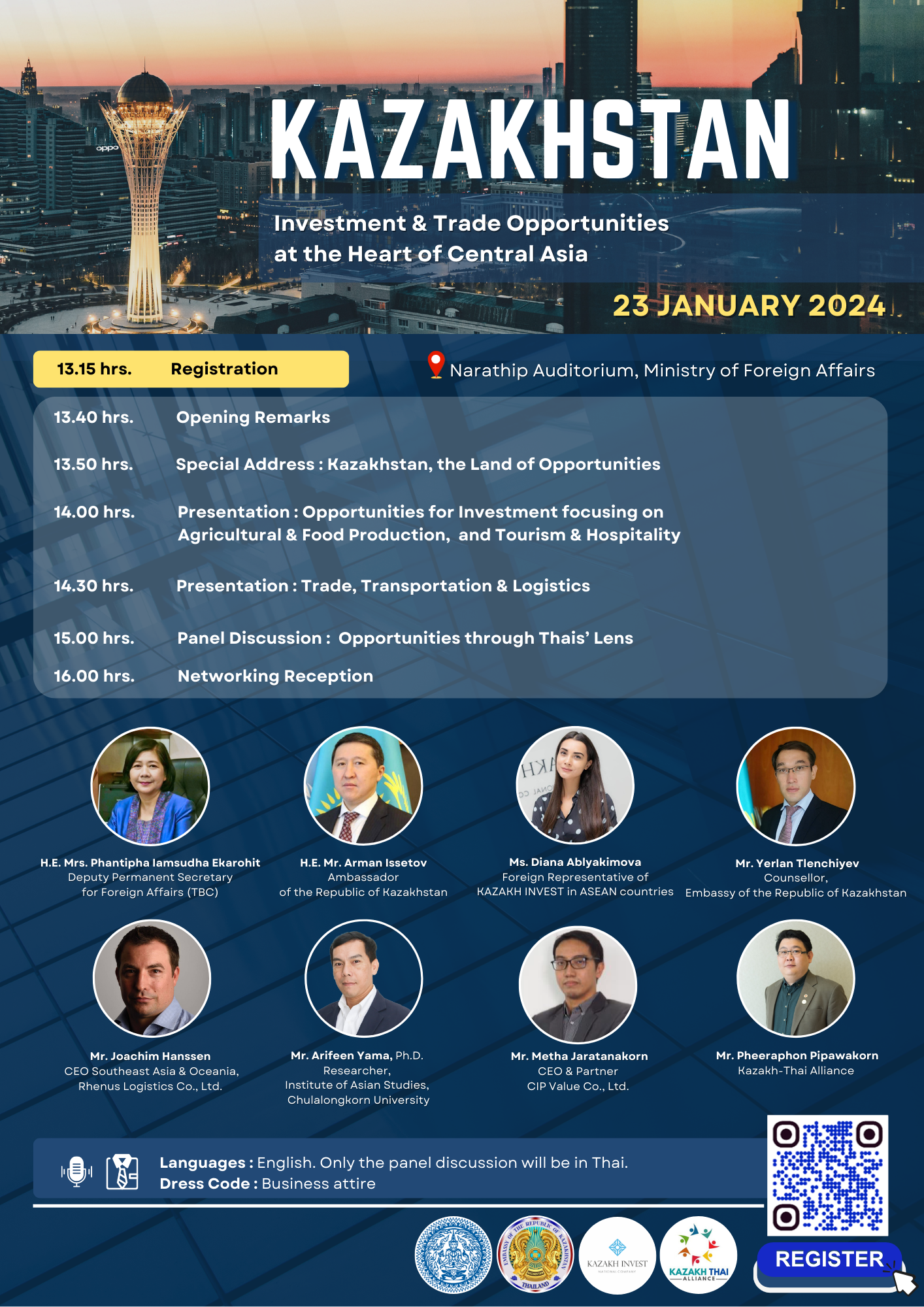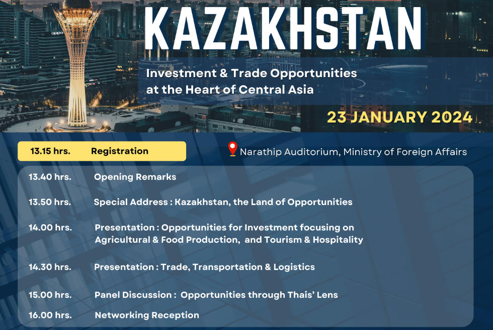 กรมเศรษฐกิจระหว่างประเทศ กระทรวงการต่างประเทศ มีกำหนดจัดงานสัมมนา Kazakhstan: Investment & Trade Opportunities at the Heart of Central Asia ในวันอังคารที่ 23 มกราคม 2567 เวลา 13.40 - 17.00 น. ณ กระทรวงการต่างประเทศ (ถนนศรีอยุธยา) เพื่อให้ข้อมูลและแลกเปลี่ยนความคิดเห็นเกี่ยวกับโอกาสการลงทุนและการค้าในคาซัคสถาน โดยเฉพาะสาขาเกษตรและอาหาร, และสาขาการท่องเที่ยว (รายละเอียดปรากฎตามเอกสารแนบ)