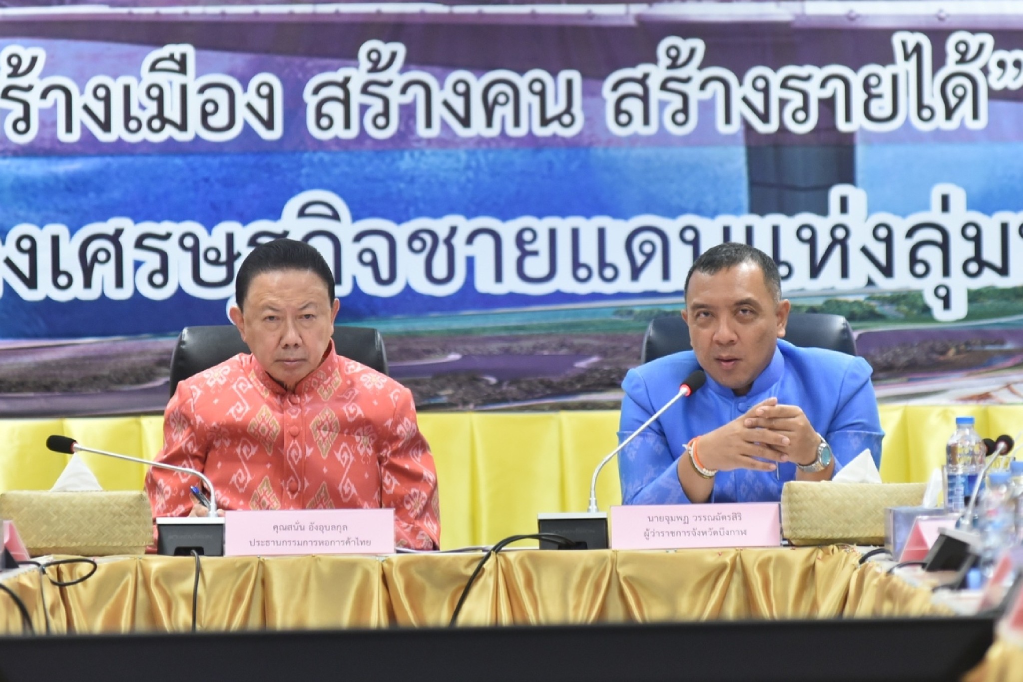 ประธานกรรมการหอการค้าไทยและสภาหอการค้าแห่งประเทศไทย เข้าพบและคารวะผู้ว่าราชการจังหวัดบึงกาฬ (คุณบุญเพ็ง ลามคำ) พร้อมกับประชุมหารือร่วมกับประธานหอการค้า (คุณบุญเพ็ง ลามคำ) คณะกรรมการ และ YEC หอการค้าจังหวัดบึงกาฬ ณ ห้องประชุมภูทอก ชั้น 2 ศาลากลางจังหวัดบึงกาฬ โดยที่ประชุมได้เสนอขอรับการสนับสนุนการจัดทำแผนส่งเสริมการท่องเที่ยว 3 ประเทศ (ไทย-ลาว-เวียดนาม) ให้เกิดเป็นรูปธรรม อยากให้มีการส่งเสริมให้ผู้ประกอบการเข้ามาลงทุนในจังหวัดบึงกาฬ โดยขอให้หอการค้าไทยช่วยสนับสนุนและผลักดันให้เกิดการลงทุน อาทิ โรงพยาบาลเอกชน โรงแรม มหาวิทยาลัย หรือ วิทยาลัย ห้างสรรพสินค้า เป็นต้น