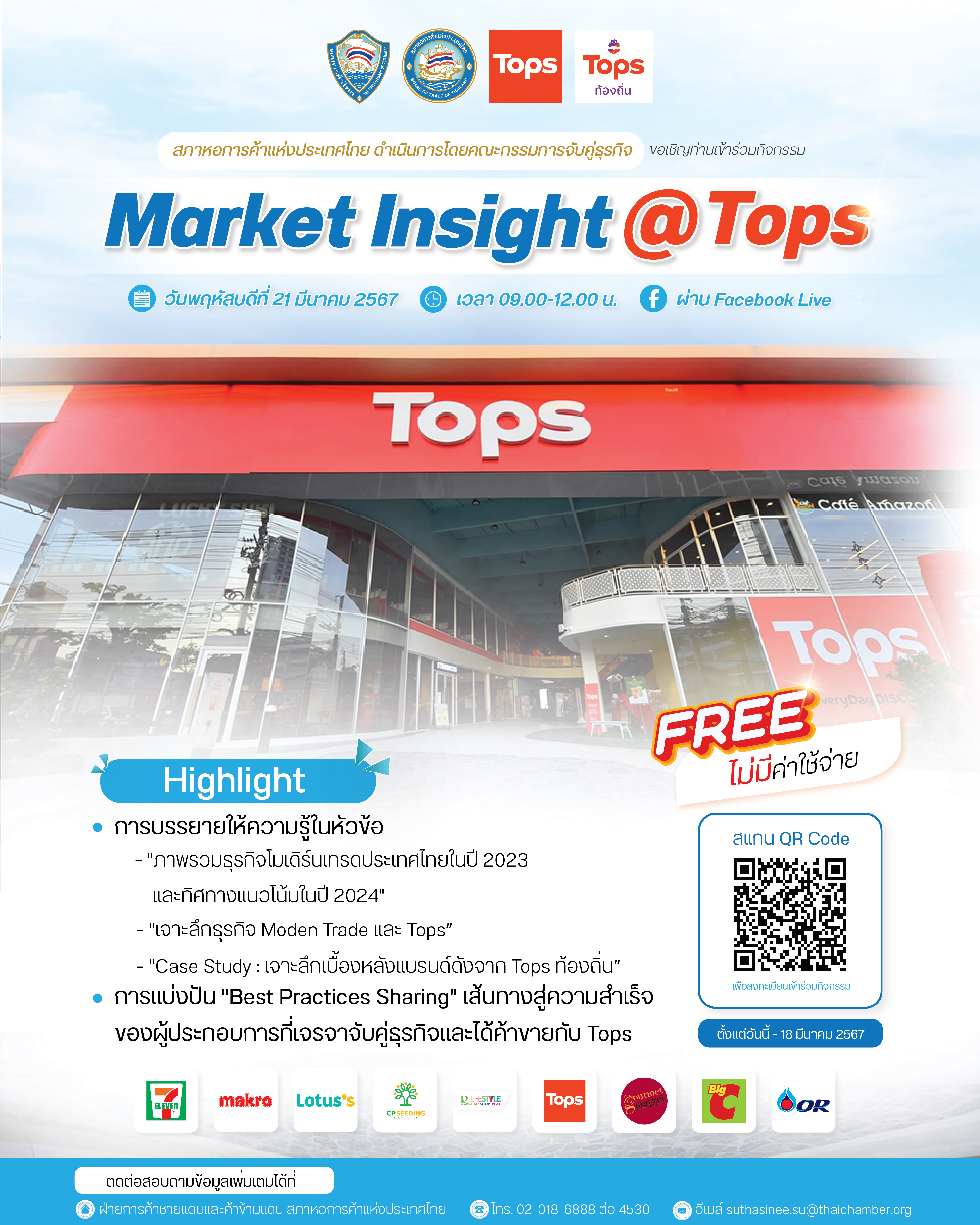 หอการค้าไทยและสภาหอการค้าแห่งประเทศไทย โดยคณะกรรมการจับคู่ธุรกิจร่วมกับ Tops มีกำหนดจัดกิจกรรม Market Insight @ Tops ในวันพฤหัสบดีที่ 21 มีนาคม 2567 เวลา 09.00 - 12.00 น. ผ่าน Facebook Live โดยภายในงานมีการเพิ่มความรู้เเละถ่ายทอดประสบการณ์แก่ผู้เข้าร่วมสัมมนา เพื่อนำไปใช้ประกอบการพัฒนาธุรกิจ ซึ่งกิจกรรมจะประกอบด้วยการบรรยายให้ความรู้เจาะลึกการทำธุรกิจ Modern Trade จากกผู้บริหาร เซ็นทรัล ฟู้ด รีเทล จำกัด