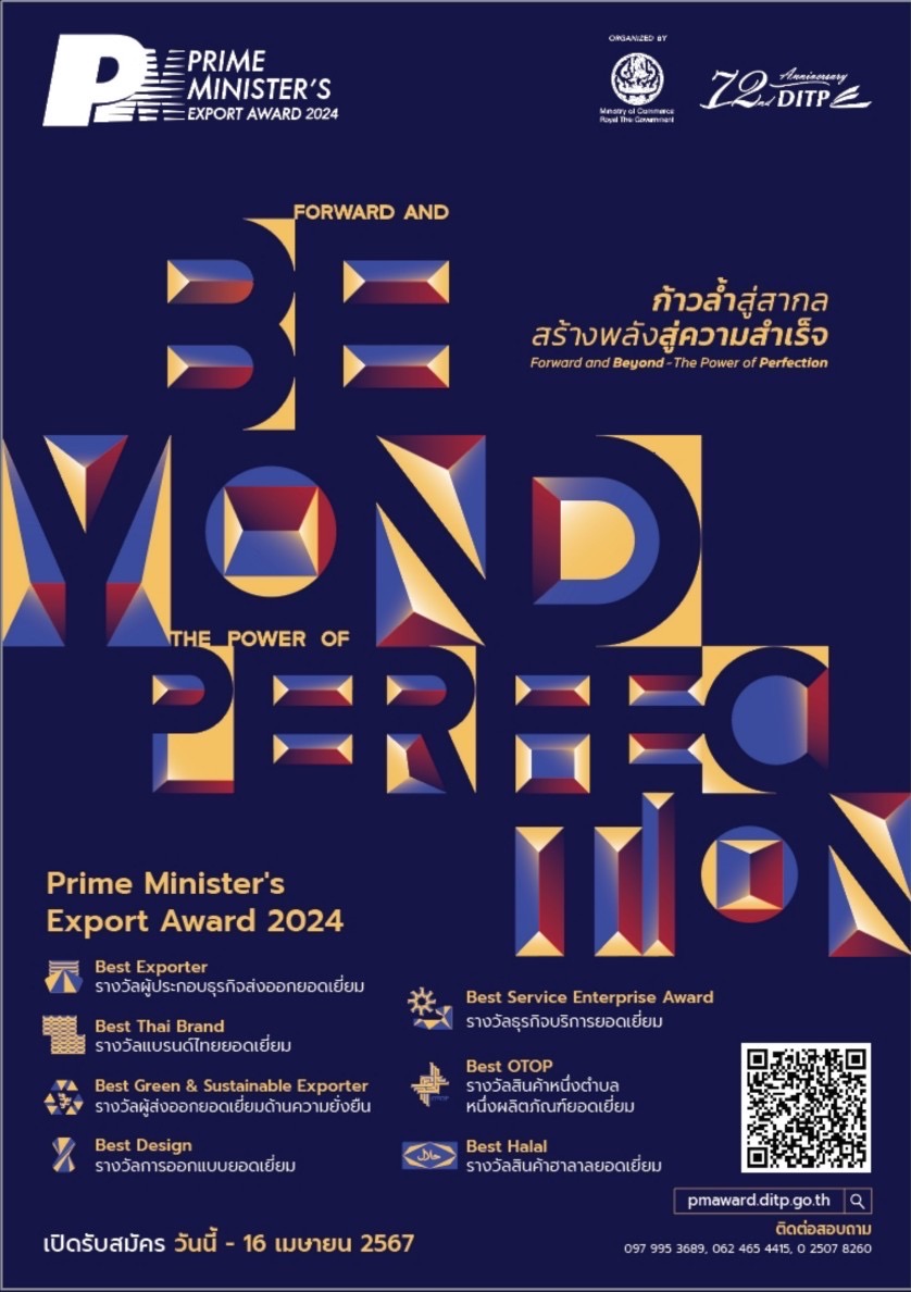 กรมส่งเสริมการค้าระหว่างประเทศ กระทรวงพาณิชย์ เชิญชวนผู้ประกอบธุรกิจส่งออก สมัครเข้ารับการคัดเลือกรางวัลผู้ประกอบธุรกิจส่งออกดีเด่น ประจำปี 2567 (PM Award 2024) ภายใต้แนวคิด "Forward and Beyond - The Power Of Perfection - ก้าวล้ำสู่สากล สร้างพลังสู่ความสำเร็จ" ต้อนรับการก้าวสู่ทศวรรษใหม่ ปีที่ 32 โดยเปิดรับสมัครตั้งแต่ วันนี้ ถึง 16 เมษายน 2567