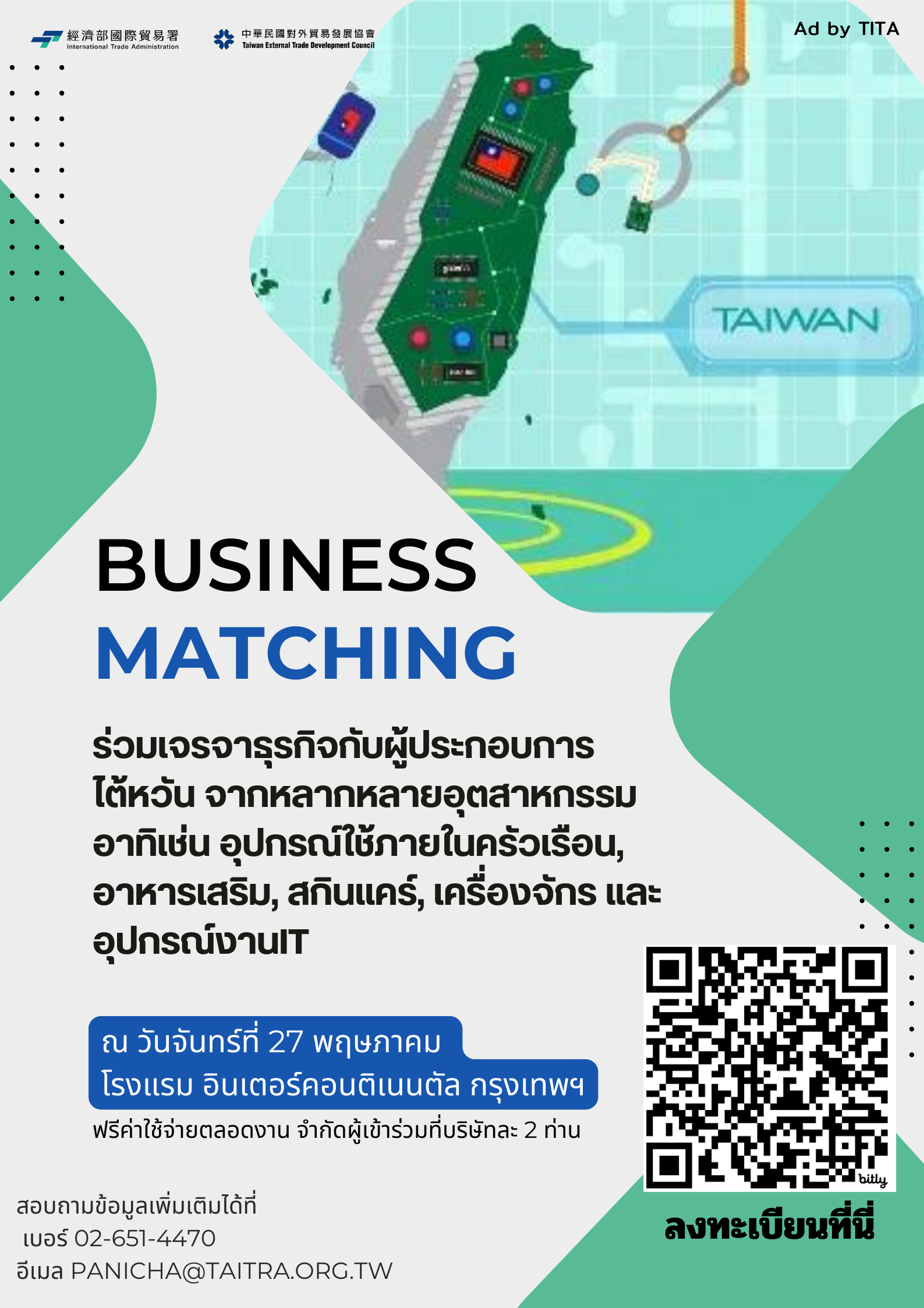 TAIWAN TRADE CENTER, BANGKOK (TAITRA) หรือ สภาการค้าไต้หวันฯ องค์กรไม่แสวงหากำไรเพื่อส่งเสริมการค้า ซึ่งสนับสนุนโดยรัฐบาลไต้หวัน ขอเรียนเชิญท่านเข้าร่วมงานพูดคุยทางธุรกิจกับผู้ประกอบการไต้หวัน ซึ่งมีรายละเอียดดังนี้