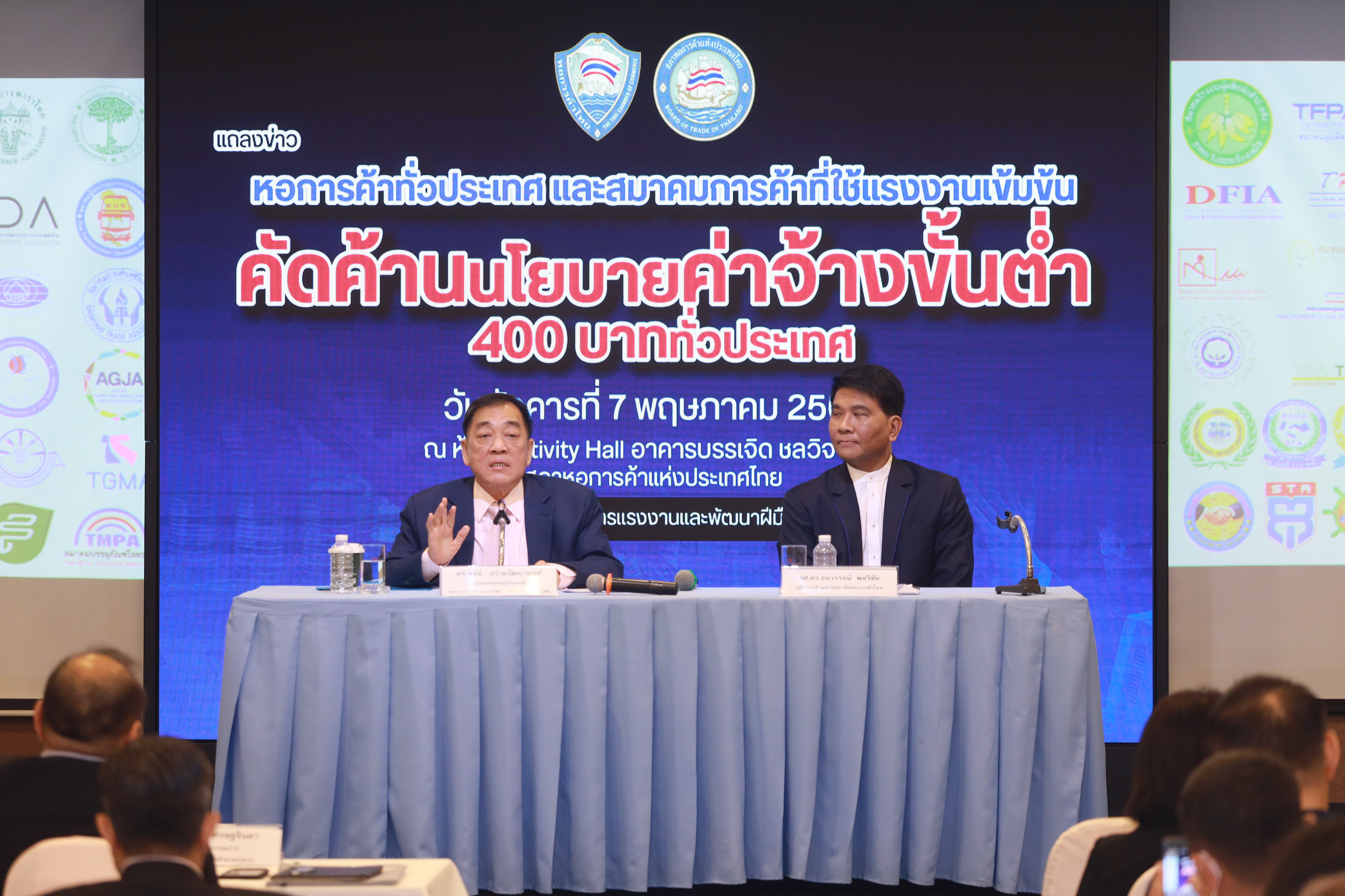 วันที่ 7 พฤษภาคม 2567 หอการค้าไทยและสภาหอการค้าแห่งประเทศไทย โดยคณะกรรมการแรงงานและพัฒนาฝีมือแรงงาน ได้จัดแถลงข่าวคัดค้านนโยบายค่าจ้างขั้นต่ำ 400 บาททั่วประเทศ โดยมี หอการค้าทั่วประเทศ และสมาคมการค้าที่ใช้แรงงานเข้มข้นมากกว่า 50 สมาคม ร่วมแสดงจุดยืนภาคเอกชนคัดค้านค่าจ้างขั้นต่ำ 400 บาทเท่ากันทั่วประเทศ โดยเสนอการปรับค่าจ้างขั้นต่ำต้องเป็นไปตามกฎหมายคุ้มครองแรงงานและกลไกการพิจารณาจากคณะอนุกรรมการพิจารณาอัตราค่าจ้างขั้นต่ำจังหวัด และคณะกรรมการค่าจ้าง (ไตรภาคี)