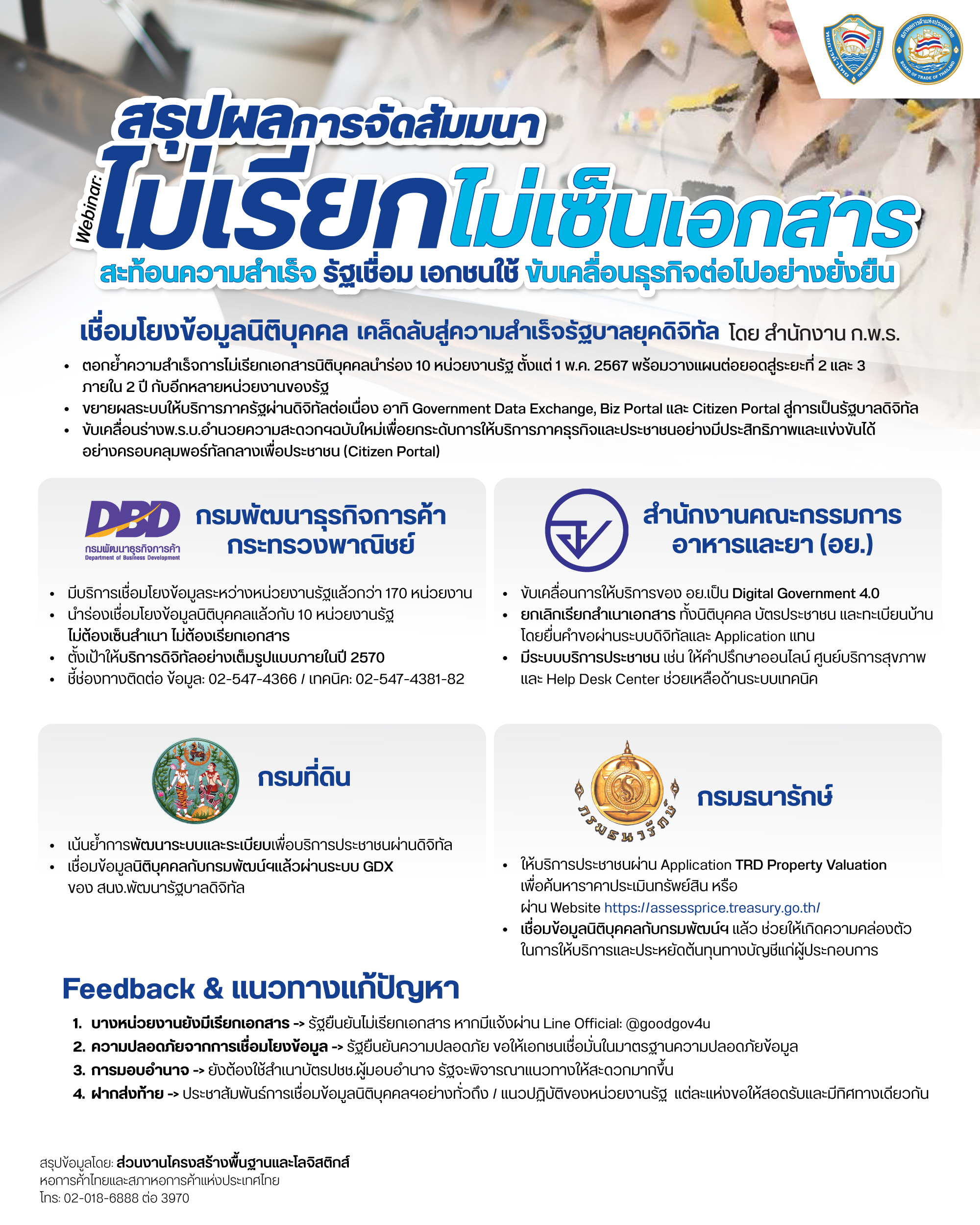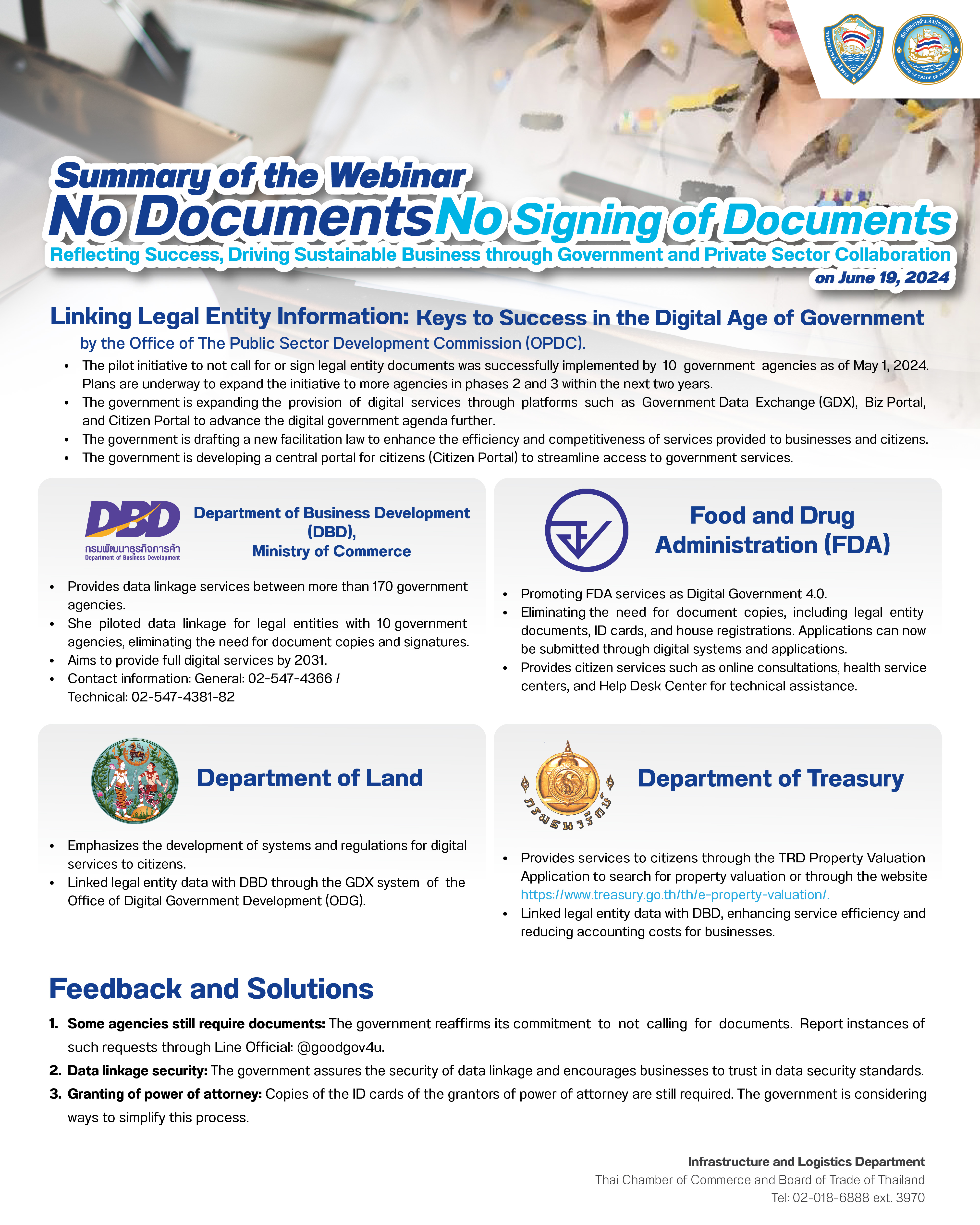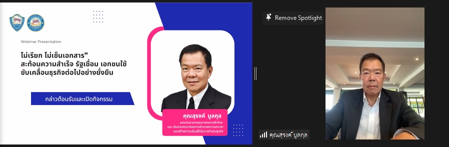 19 มิถุนายน 2567 คณะกรรมการอำนวยความสะดวกและสร้างความเข้มแข็งในการดำเนินธุรกิจ จัดกิจกรรมสัมมนาออนไลน์ (Webinar) หัวข้อ “ไม่เรียก ไม่เซ็นเอกสาร สะท้อนความสำเร็จ รัฐเชื่อม เอกชนใช้ ขับเคลื่อนธุรกิจต่อไปอย่างยั่งยืน โดยได้รับเกียรติจากคุณสุรงค์ บูลกุล เป็นประธานในพิธีเปิดและกล่าววัตถุประสงค์ เพื่อสร้างการรับรู้ ความเข้าใจ ร่วมทั้ง รับฟังความคิดเห็นจากการใช้บริการภาครัฐในการเชื่อมโยงและแลกเปลี่ยนข้อมูลนิติบุคคลของหน่วยงานภาครัฐ ในการอำนวยความสะดวกในการดำเนินธุรกิจ