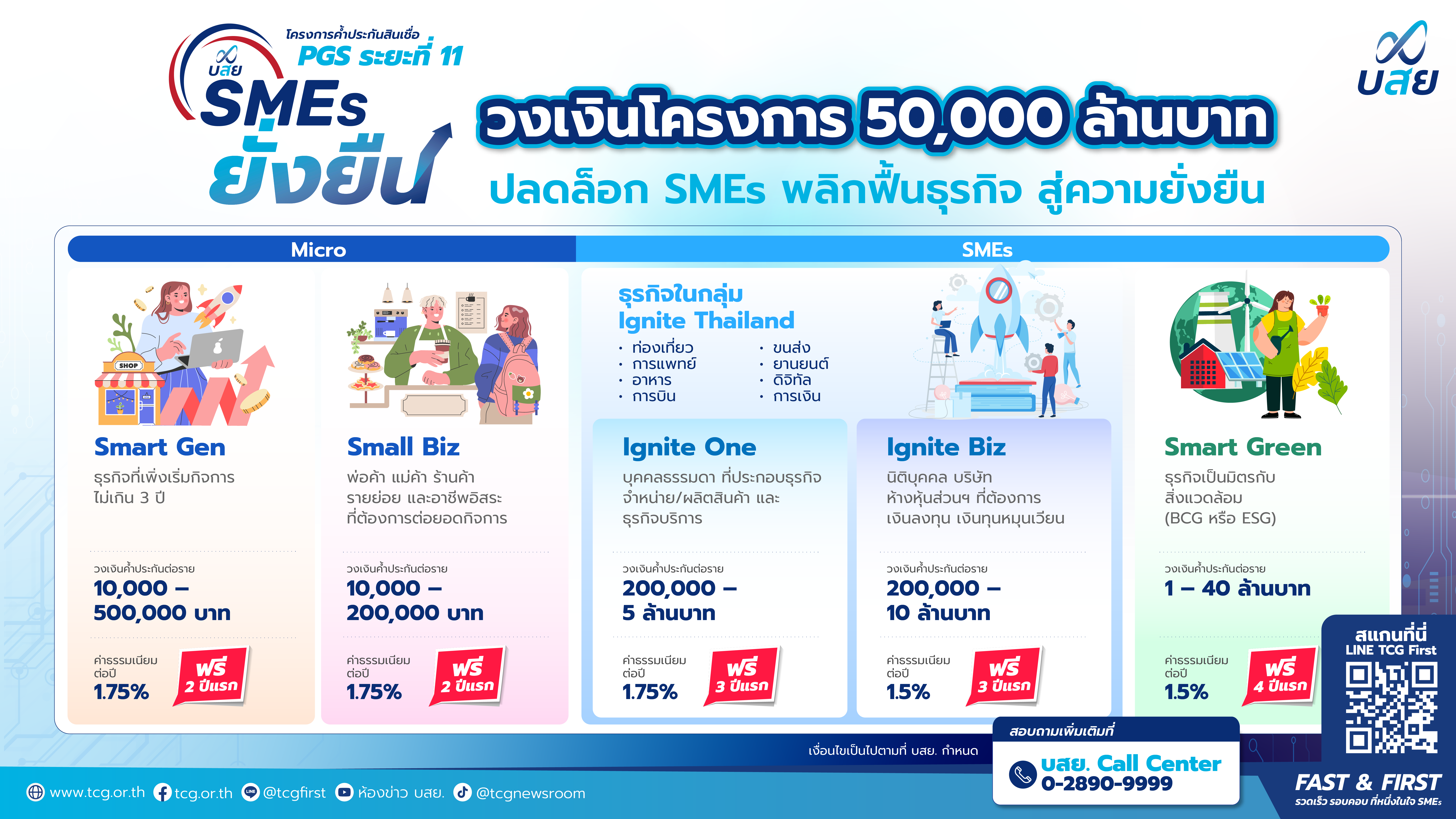 โครงการค้ำประกันสินเชื่อ PGS (Portfolio Guarantee Scheme) ระยะที่ 11 “บสย. SMEs ยั่งยืน” คณะรัฐมนตรี ได้อนุมัติ เมื่อวันที่ 11 มิถุนายน 2567 ในกรอบวงเงิน 50,000 ล้านบาท โดย บสย. ได้จัดสรรวงเงิน ระยะที่ 1 จำนวน 25,000 ล้านบาท เน้นช่วยเหลือ “กลุ่มเปราะบาง” ผู้ประกอบการรายย่อย พ่อค้า แม่ค้า อาชีพอิสระ และผู้ประกอบการใหม่ รวมถึงกลุ่มอุตสาหกรรมภายใต้ยุทธศาสตร์ IGNITE THAILAND (ท่องเที่ยว การแพทย์และสุขภาพ อาหาร การบิน การขนส่ง การผลิตยานยนต์ เศรษฐกิจดิจิทัล และการเงิน) และธุรกิจที่เป็นมิตรกับสิ่งแวดล้อม มุ่งปรับตัวเข้าสู่สังคม Carbon ต่ำ สำหรับการช่วยเหลือเร่งด่วน บสย. ได้เตรียม 5 โครงการย่อย ดังนี้
