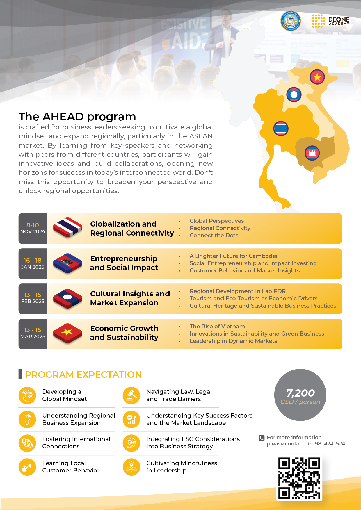หลักสูตร AHEAD เป็นหลักสูตรระดับสากลที่ออกแบบมาเพื่อนักธุรกิจที่ต้องการพัฒนามุมมองใหม่ ๆ และเปิดโอกาสให้พบปะกับนักธุรกิจจากหลากหลายประเทศ โดยใช้ภาษาอังกฤษทั้งหมดในการสื่อสาร