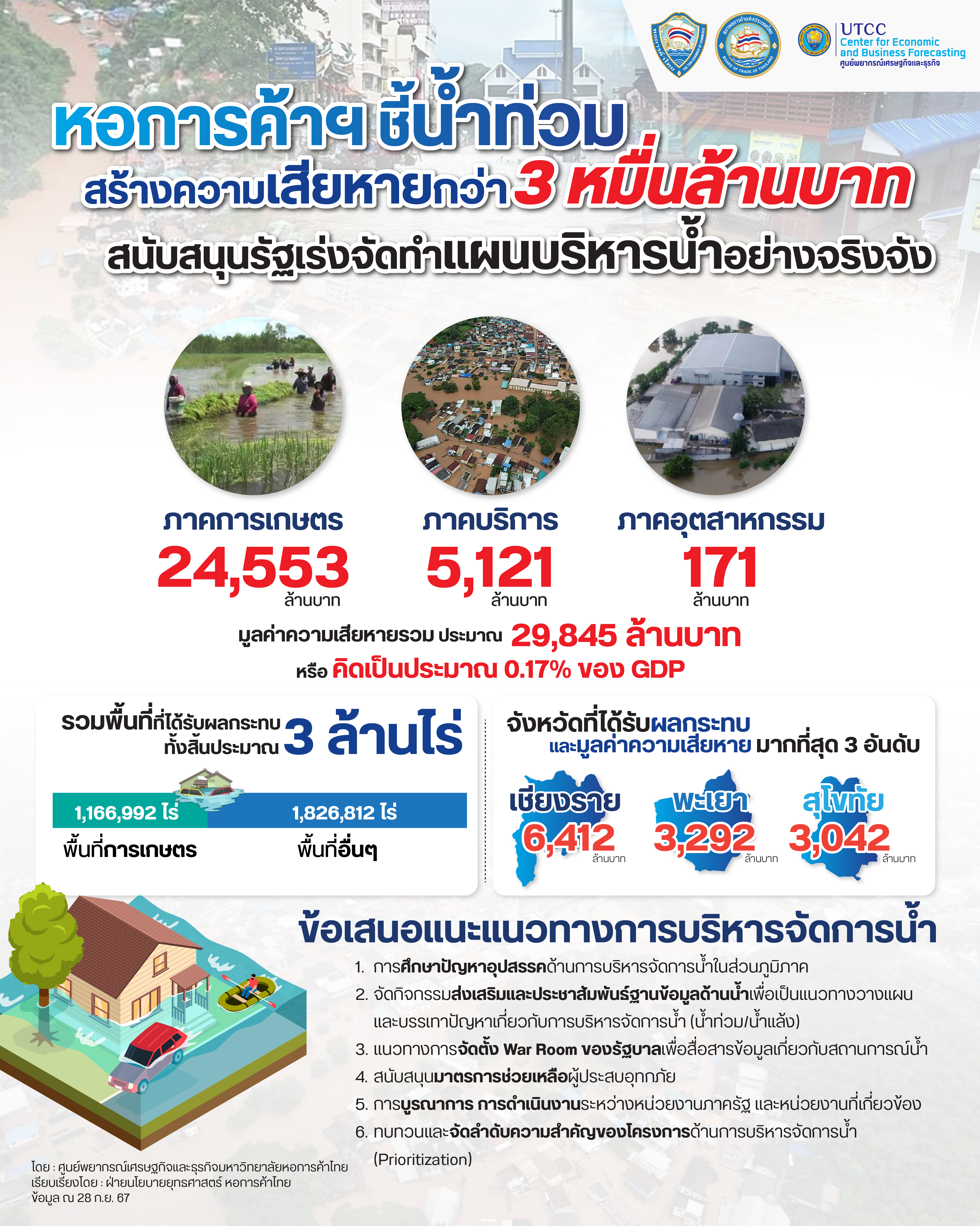 (กรุงเทพฯ, 30 กันยายน 2567) นายสนั่น อังอุบลกุล ประธานกรรมการหอการค้าไทยและสภาหอการค้าแห่งประเทศไทย เปิดเผยว่า สถานการณ์น้ำท่วมที่เกิดขึ้นในปัจจุบันขยายวงกว้างไปยัง 33 จังหวัดทั้งทางภาคเหนือและภาคตะวันออกเฉียงเหนือ อาทิ เชียงราย พะเยา สุโขทัย หนองคาย นครพนม พิจิตร สกลนคร พิษณุโลก และอุดรธานี เป็นต้น นอกจากนี้ มวลน้ำที่ไหลผ่านเข้าสู่ภาคกลางประกอบกับแนวโน้มที่ฝนจะตกเพิ่มต่อเนื่องอีกระลอก ทำให้หลายจังหวัดยังมีความเสี่ยงที่อาจเกิดน้ำท่วม โดยเฉพาะปริมาณฝนที่คาดว่าจะมีการตกหลังเขื่อนในช่วงเดือนตุลาคม ซึ่งจะเป็นปัจจัยสำคัญที่อาจทำให้เกิดน้ำท่วมเพิ่มเติมได้ ดังนั้น ทุกภาคส่วนยังจำเป็นต้องติดตามสถานการณ์น้ำต่อไปอย่างใกล้ชิด ขณะเดียวกัน รัฐบาลควรเร่งจัดทำแผนเชิงป้องกันไว้ล่วงหน้าที่ชัดเจนก็จะช่วยลดผลกระทบและความเสียหายที่จะเกิดขึ้นกับประชาชนและเศรษฐกิจได้มาก โดยหอการค้าไทยและมหาวิทยาลัยหอการค้าไทย ติดตามอย่างใกล้ชิดและประเมินมูลค่าความเสียหายแล้ว ประมาณ 29,845 ล้านบาท หรือ คิดเป็น 0.17% ของ GDP (ข้อมูล ณ 28 ก.ย. 67) ซึ่งภาพรวมพื้นที่ที่ได้รับผลกระทบจากน้ำท่วมรวมทั้งสิ้นประมาณ 3 ล้านไร่ โดยแบ่งเป็นพื้นที่การเกษตร 1,166,992 ไร่ และพื้นที่อื่นๆ 1,826,812 ไร่ ทั้งนี้ จากการประเมิน พบว่า ภาคการเกษตรได้รับผลกระทบมากที่สุด โดยมีมูลค่าความเสียหายรวมถึง 24,553 ล้านบาท คิดเป็นสัดส่วนประมาณ 82.3% ของความเสียหายทั้งหมด รองลงมาเป็นภาคบริการ เสียหาย 5,121 ล้านบาท ส่วนภาคอุตสาหกรรมเสียหายราว 171 ล้านบาท ซึ่งถือเป็นสัดส่วนน้อยเมื่อเทียบกับความเสียหายในภาคเศรษฐกิจอื่นๆ เนื่องจากมีการเตรียมการรับมือกับสถานการณ์น้ำได้ดี สำหรับจังหวัดที่ได้รับผลกระทบและมูลค่าความเสียหายมากที่สุด 3 อันดับ ได้แก่ เชียงราย มีมูลค่าความเสียหายรวม 6,412 ล้านบาท รองลงมาคือ พะเยา 3,292 ล้านบาท สุโขทัย 3,042 ล้านบาท ตามลำดับ