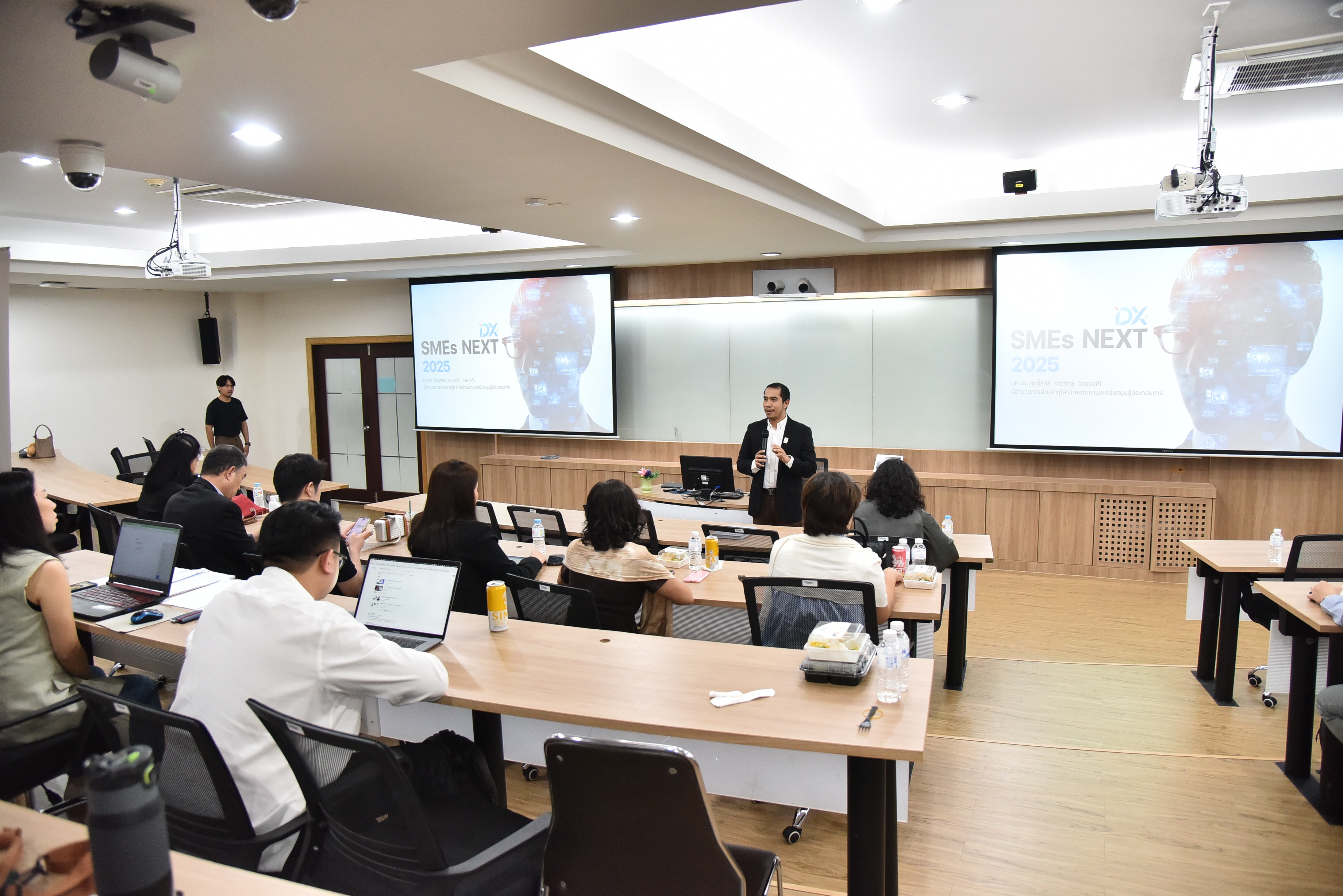 • ในช่วงบ่าย SME D Bank พาผู้ประกอบการไปอัพเดท Trend ในการประกอบธุรกิจ ในปี 2025 ที่จะต้องคำนึงถึงสิ่งแวดล้อม ESG และ BCG เพื่อนำไปสู่ความยั่งยืนของธุรกิจ โดยได้รับเกียรติจาก ผศ.ดร.ศักดิ์สิทธิ์  ราชรักษ์ ผู้อำนวยการอาวุโสฝ่ายพัฒนาและสนับสนุนผู้ประกอบการ บรรยายในหัวข้อ “Marketing Trend for SMEs 2025” และต่อด้วยการบรรยายในหัวข้อ "เครื่องมือการพัฒนา SME ให้สร้างโอกาสในการเติบโตธุรกิจด้วย DX" โดยคุณพรเทพ กิตติพัฒน์ไพบูลย์ ผู้เชี่ยวชาญ ฝ่ายพัฒนาและสนับสนุนผู้ประกอบการ ที่จะช่วยประเมินความพร้อมของผู้ประกอบการ และการขอรับคำปรึกษาจากผู้เชี่ยวชาญในแต่ละด้านประกอบด้วย ด้านการตลาด, ด้านการพัฒนาผลิตภัณฑ์, ด้านการเขียนแผนธุรกิจ, ด้านการผลิต, ด้านการพัฒนาเทคโนโลยีและนวัตกรรม และด้านการสนับสนุนแหล่งเงินทุน ปิดท้ายกิจกรรมของวันนี้ด้วยการแนะนำให้เข้าถึงแหล่งทุน เสริมแกร่ง SMEs ไทย โดย คุณพรชัย จิรโสภณ รองผู้อำนวยการฝ่ายพัฒนาธุรกิจ เพื่อเสริมสภาพคล่องให้ผู้ประกอบการ SMEs สามารถดำเนินธุรกิจและเติบโตต่อไปได้