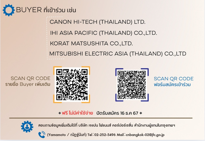 ขอเชิญผู้ประกอบการบริษัทไทยที่ดําเนินธุรกิจภายในประเทศ และผู้ประกอบการบริษัทญี่ปุ่นในประเทศไทย (บริษัทที่จดทะเบียนหรือเปิดสาขาในประเทศไทย) ในภาคอุตสาหกรรมยานยนต์ อุตสาหกรรมไฟฟ้าอิเล็กทรอนิกส์ เทรดดิ้ง หรืออุตสาหกรรมที่เกี่ยวข้อง ร่วมเป็นส่วนหนึ่งของการสนับสนุนและส่งเสริมการค้าการลงทุนของผู้ประกอบการบริษัทไทยและบริษัทญี่ปุ่น ทั้งยังเพิ่มช่องทางและเครือข่ายในการประกอบธุรกิจ