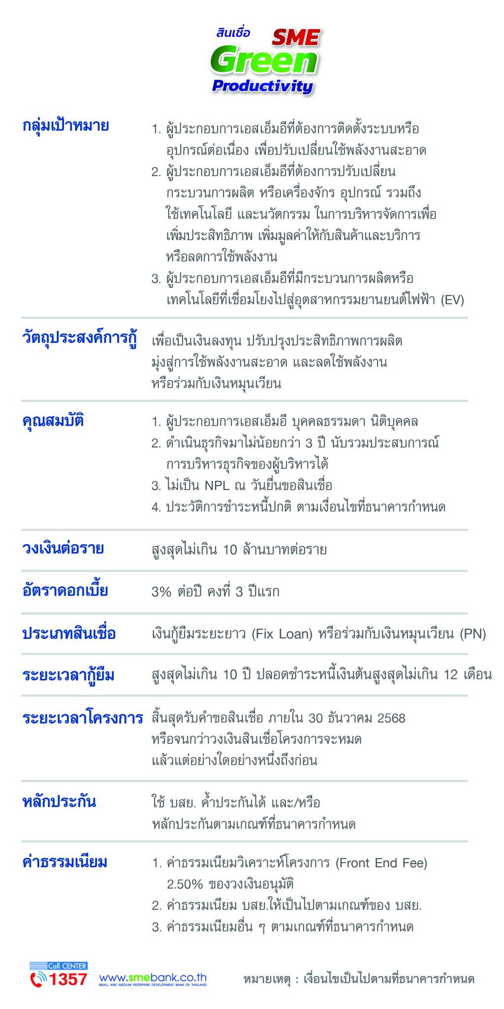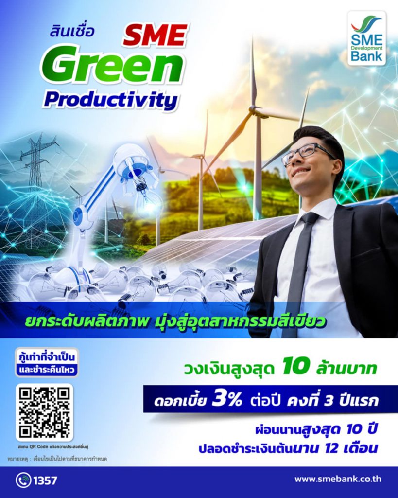 นอกจากนี้ยังมีโครงการสินเชื่อ SME Green Productivity เหมาะสำหรับผู้ประกอบการที่ต้องการลดต้นทุนพลังงาน เพื่อก้าวสู่อุตสาหกรรมสีเขียว โดยมีอัตราดอกเบี้ยเพียง 3% ต่อปี คงที่ 3 ปีแรก วงเงินกู้สูงสุด 10 ล้านบาท ผ่อนชำระนานสูงสุดถึง 10 ปี แถมปลอดชำระหนี้เงินต้นสูงสุด 12 เดือนแรก ผ่อนปรนเงื่อนไข และหลักประกันค้ำประกัน โดยใช้ บสย. ค้ำประกันได้สูงสุดถึง 10 ล้านบาท