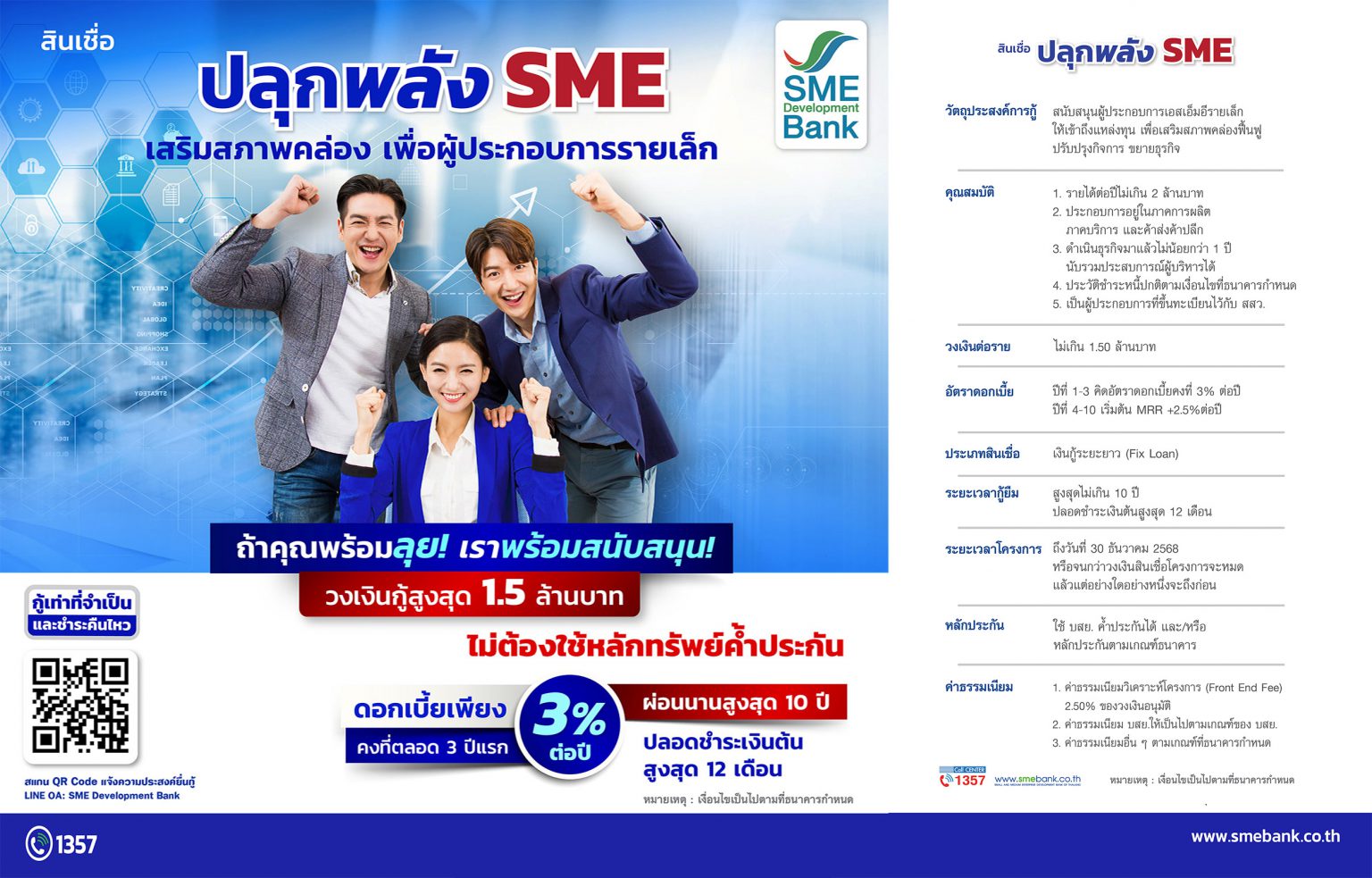 โครงการสินเชื่อ “ปลุกพลัง SME” วงเงินสินเชื่อ 10,000 ล้านบาท สำหรับผู้ประกอบการเอสเอ็มอีรายเล็ก ทั้งบุคคลธรรมดาและนิติบุคคล ในทุกภาคธุรกิจ ที่มีรายได้ต่อปีไม่เกิน 2 ล้านบาท สำหรับลงทุน ขยาย ปรับปรุงกิจการ หรือปรับเปลี่ยนรูปแบบการดำเนินธุรกิจ รวมถึงหมุนเวียน และเสริมสภาพคล่องในธุรกิจ วงเงินกู้ต่อรายสูงสุดไม่เกิน 1.5 ล้านบาท ผ่อนนานสูงสุด 10 ปี อัตราดอกเบี้ย 3%ต่อปี คงที่ตลอด 3 ปีแรก ปลอดชำระเงินต้นสูงสุด 12 เดือน และใช้ บสย.ค้ำประกันได้