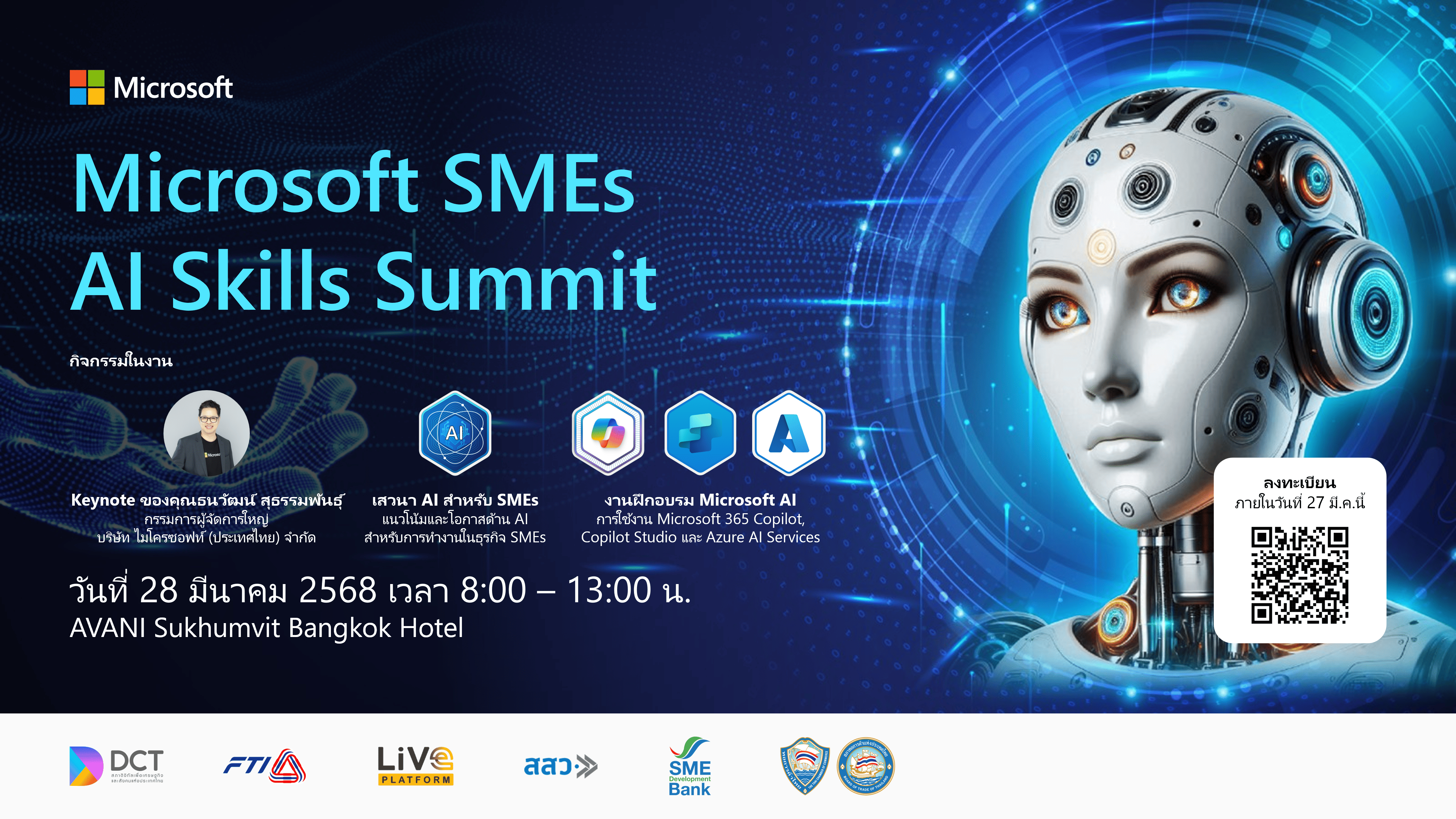 ขอเชิญทุกท่านเข้าร่วมงานสัมมนา Microsoft SMEs AI Skills Summit พร้อมพบกับผู้นำองค์กร ผู้นำธุรกิจ SMEs และผู้เชี่ยวชาญในสาย AI