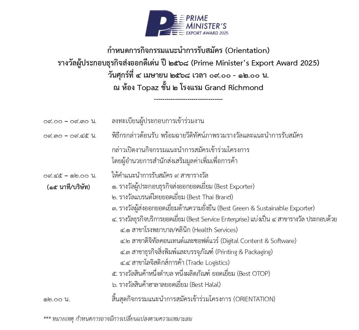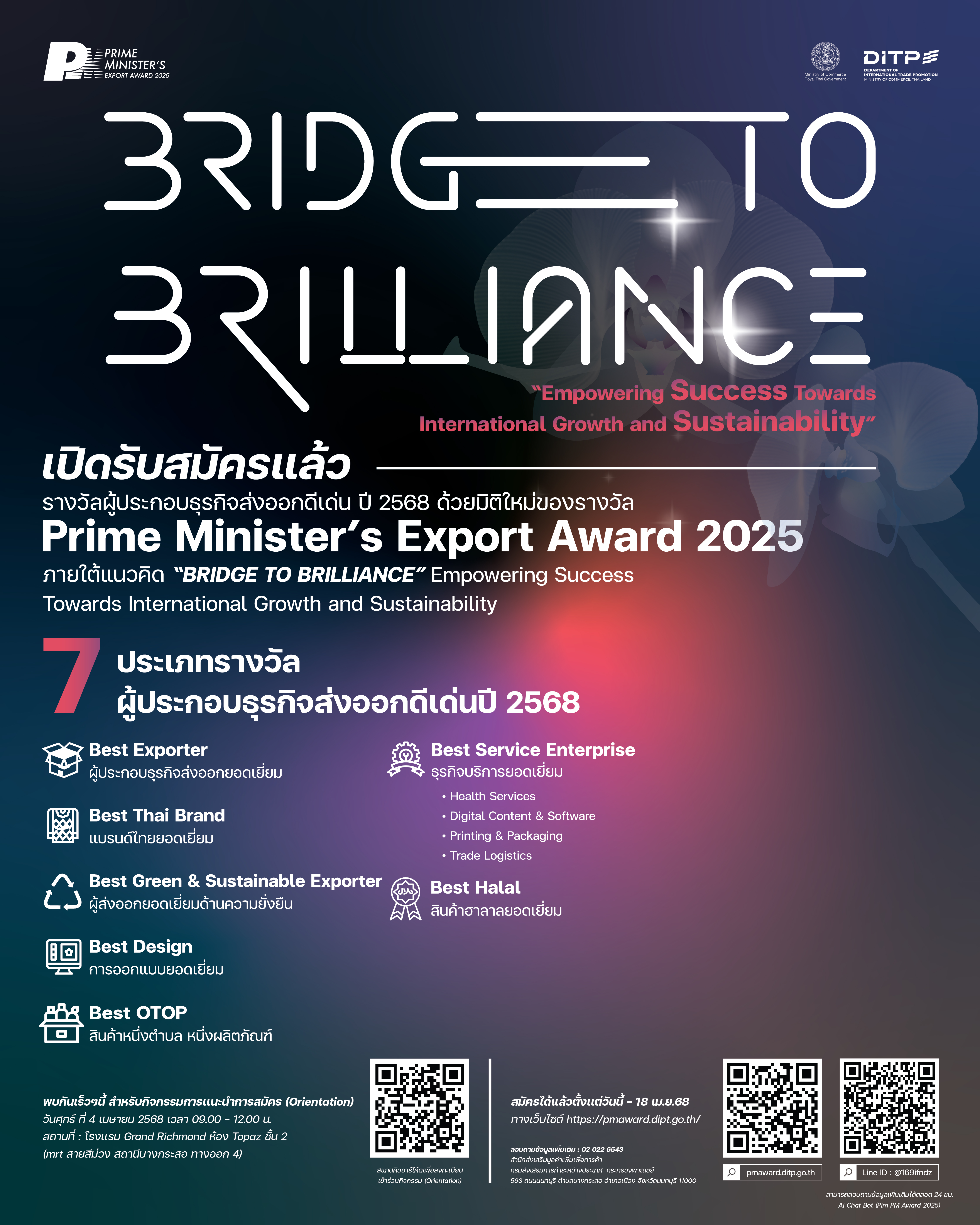 กรมส่งเสริมการค้าระหว่างประเทศ โดยสำนักส่งเสริมมูลค่าเพิ่มเพื่อการค้า ดำเนินการจัดรางวัลผู้ประกอบธุรกิจส่งออกดีเด่น ปี 2568 (Prime Minister’s Export Award 2025) ครั้งที่ 33 ภายใต้แนวคิด “BRIDGE TO BRILLIANCE : Empowering Success Towards International Growth and Sustainability เสริมพลังความสำเร็จ สู่การเติบโตระดับนานาชาติอย่างยั่งยืน” เพื่อส่งเสริมผู้ประกอบธุรกิจส่งออกสินค้าและบริการดีเด่น ที่มีการริเริ่มและพยายามบุกเบิกตลาดต่างประเทศภายใต้ชื่อทางการค้าของตนเอง