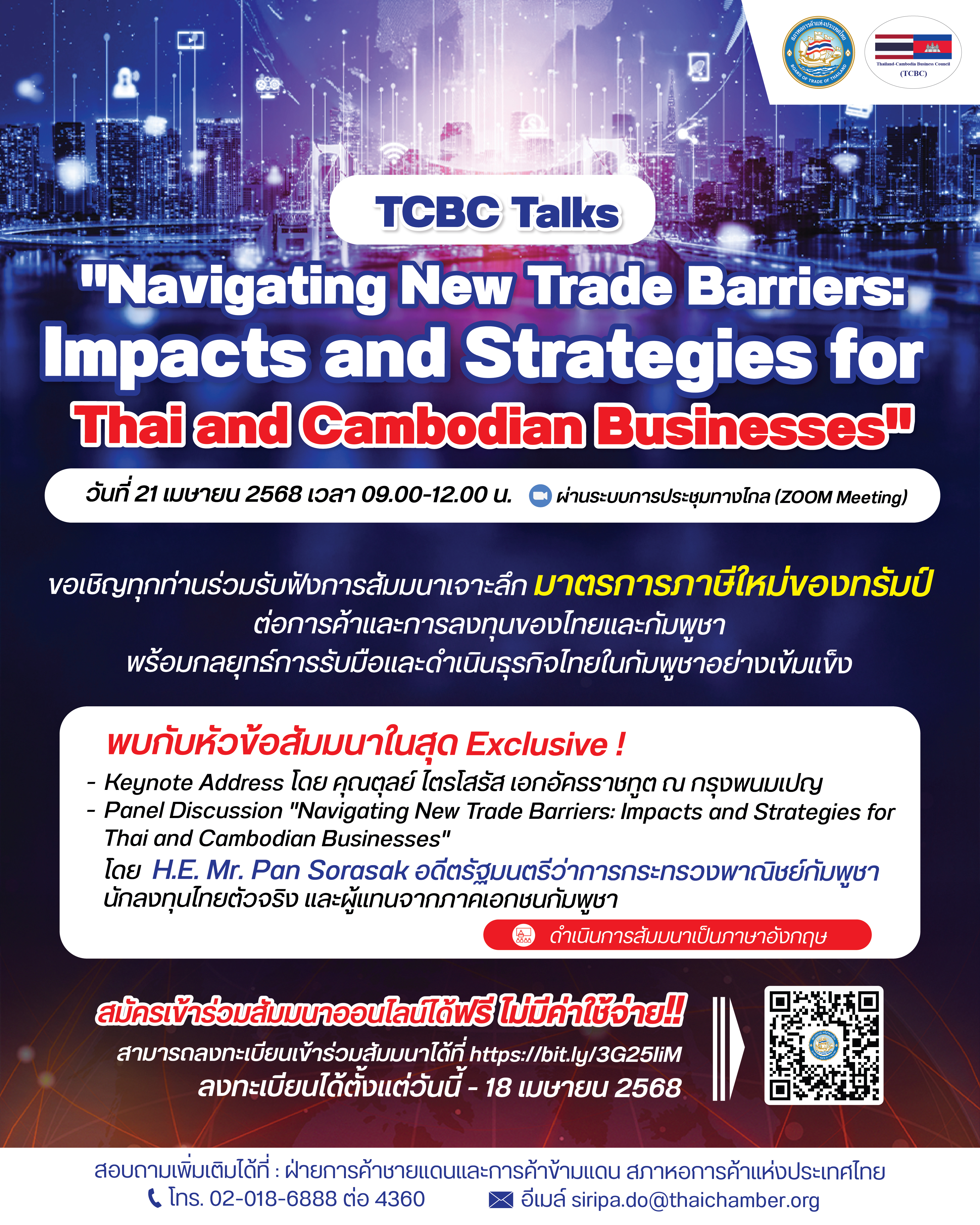 คณะกรรมการค้าชายแดนและค้าข้ามแดน สภาหอการค้าแห่งประเทศไทย ร่วมกับ สภาธุรกิจไทย-กัมพูชา ขอเชิญทุกท่านเข้าร่วมงานสัมมนาออนไลน์ TCBC Talks "Navigating New Trade Barriers: Impacts and Strategies for Thai and Cambodian Businesses" ในวันจันทร์ที่ 21 เมษายน 2568 เวลา 09.00-12.00 น. ผ่านระบบการประชุมทางไกล (ZOOM)
