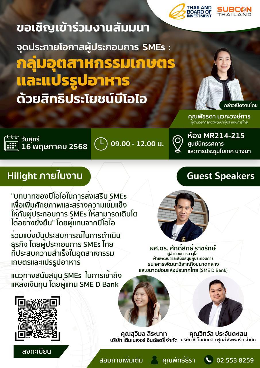 “จุดประกายโอกาสผู้ประกอบการ SMEs: กลุ่มอุตสาหกรรมเกษตรและแปรรูปอาหารด้วยสิทธิประโยชน์บีโอไอ”