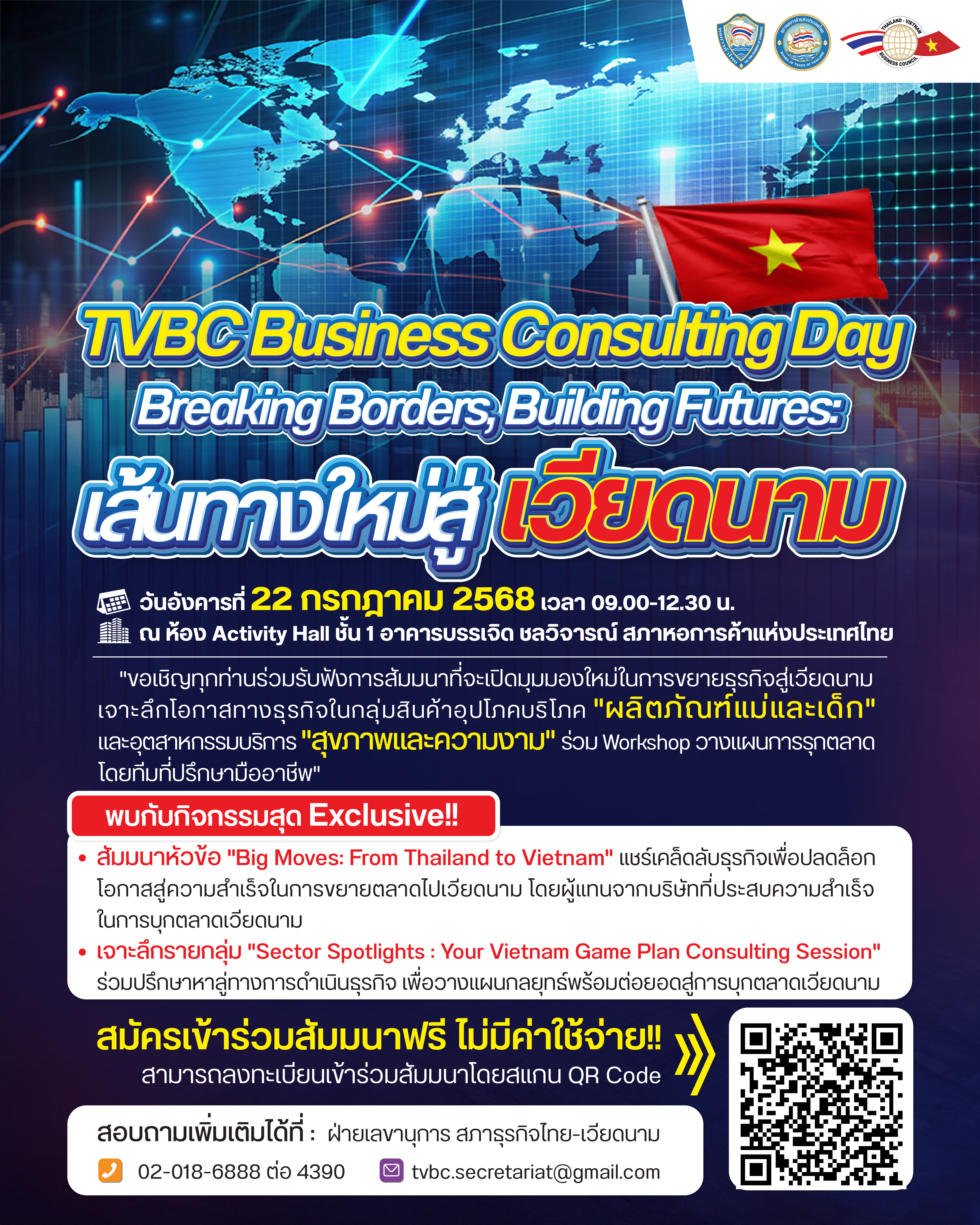 ขอเชิญทุกท่านร่วมรับฟังการสัมมนาที่จะเปิดมุมมองใหม่ในการขยายธุรกิจจากไทยสู่เวียดนาม พร้อมรับฟังประสบการณ์จริงและกลยุทธ์สำคัญจากผู้ประกอบการไทยที่ประสบความสำเร็จในการบุกตลาดเวียดนาม เจาะลึกโอกาสทางธุรกิจในกลุ่มอุตสาหกรรม “ผลิตภัณฑ์แม่และเด็ก” และ “สุขภาพและความงาม” และร่วม Workshop วางแผนการรุกตลาด โดยทีมที่ปรึกษาจากบริษัทชั้นนำของไทย