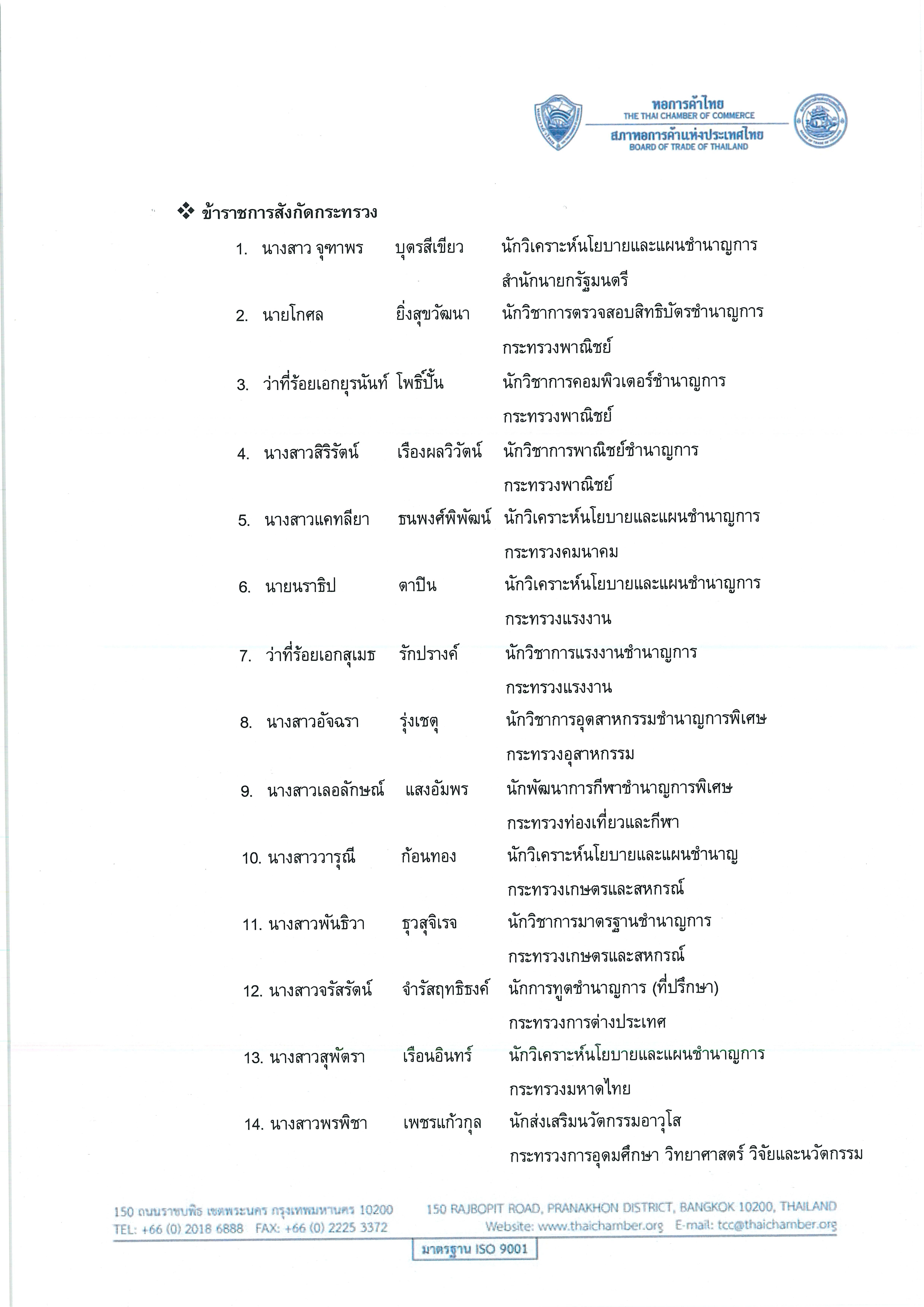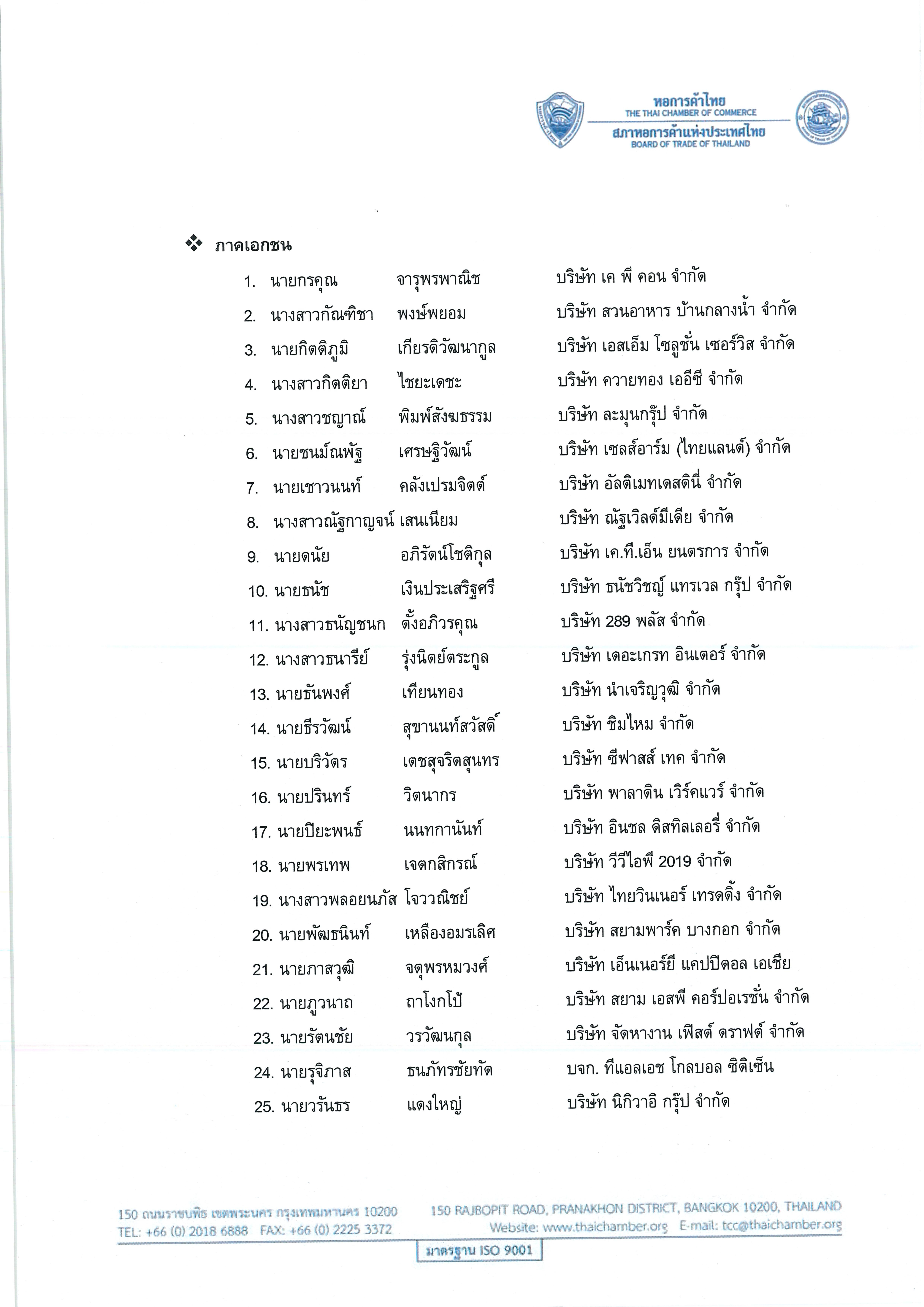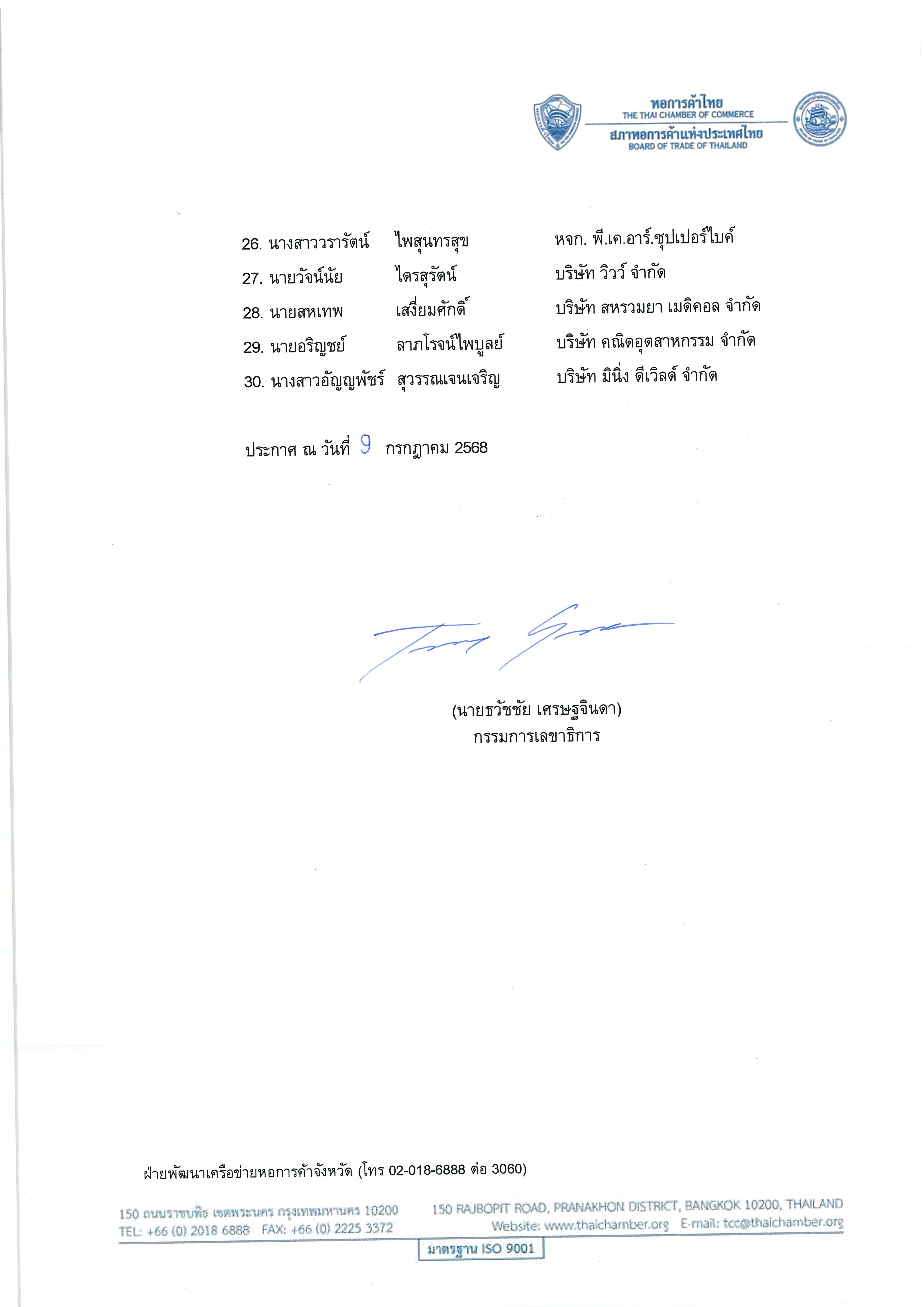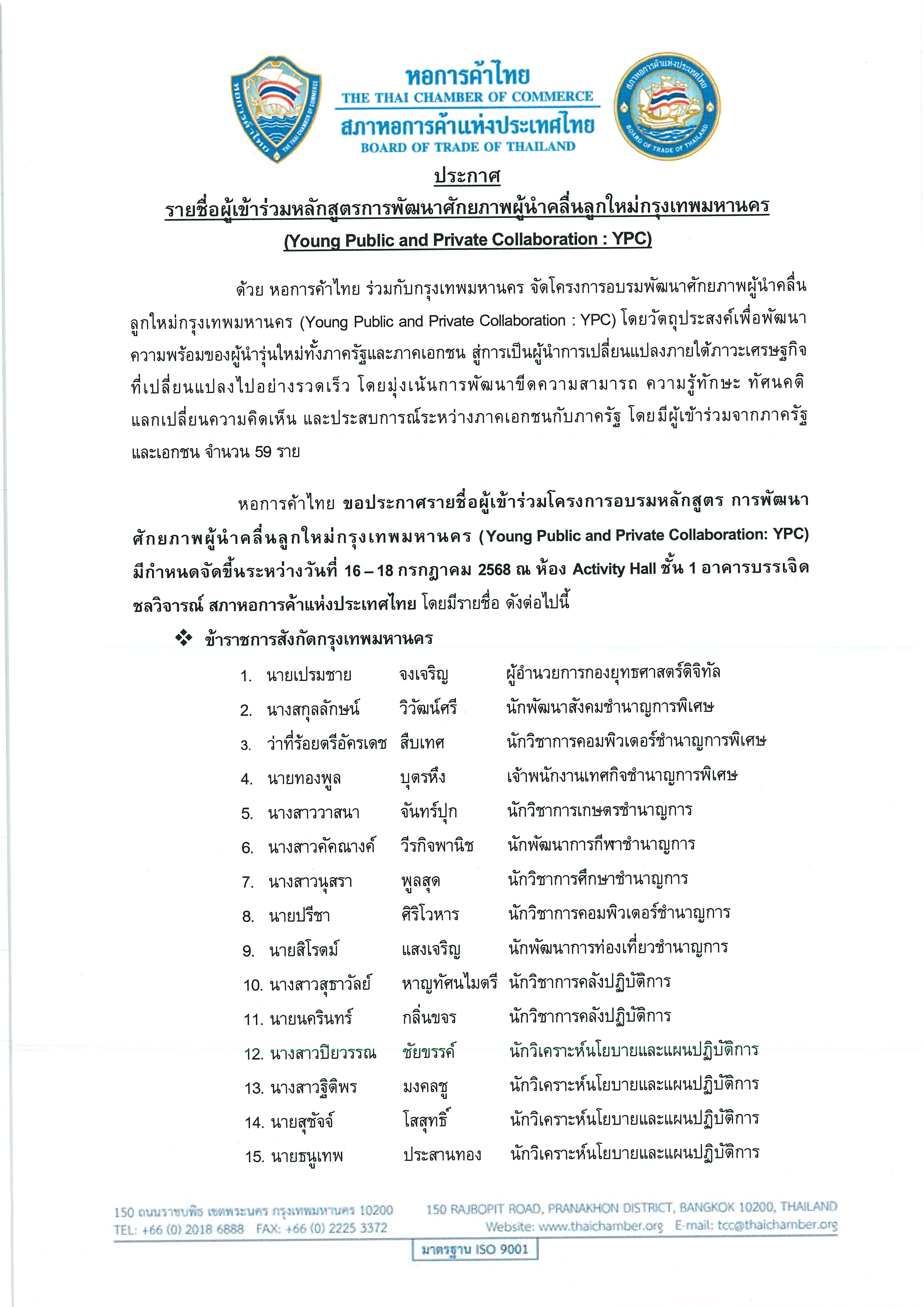 หอการค้าไทย ขอประกาศรายชื่อผู้เข้าร่วมโครงการอบรมหลักสูตร การพัฒนาศักยภาพผู้นำคลื่นลูกใหม่กรุงเทพมหานคร (Young Public and Private Collaboration: YPC) มีกำหนดจัดขี้นระหว่างวันที่ 16 – 18 กรกฎาคม 2568 ณ ห้อง Activity Hall ชั้น 1 อาคารบรรเจิด ชลวิจารณ์ สภาหอการค้าแห่งประเทศไทย โดยมีรายชื่อ ดังต่อไปนี้